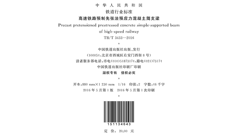 15113.4643高速铁路预制先张法预应力混凝土简支梁 TB/T 3433—2016
