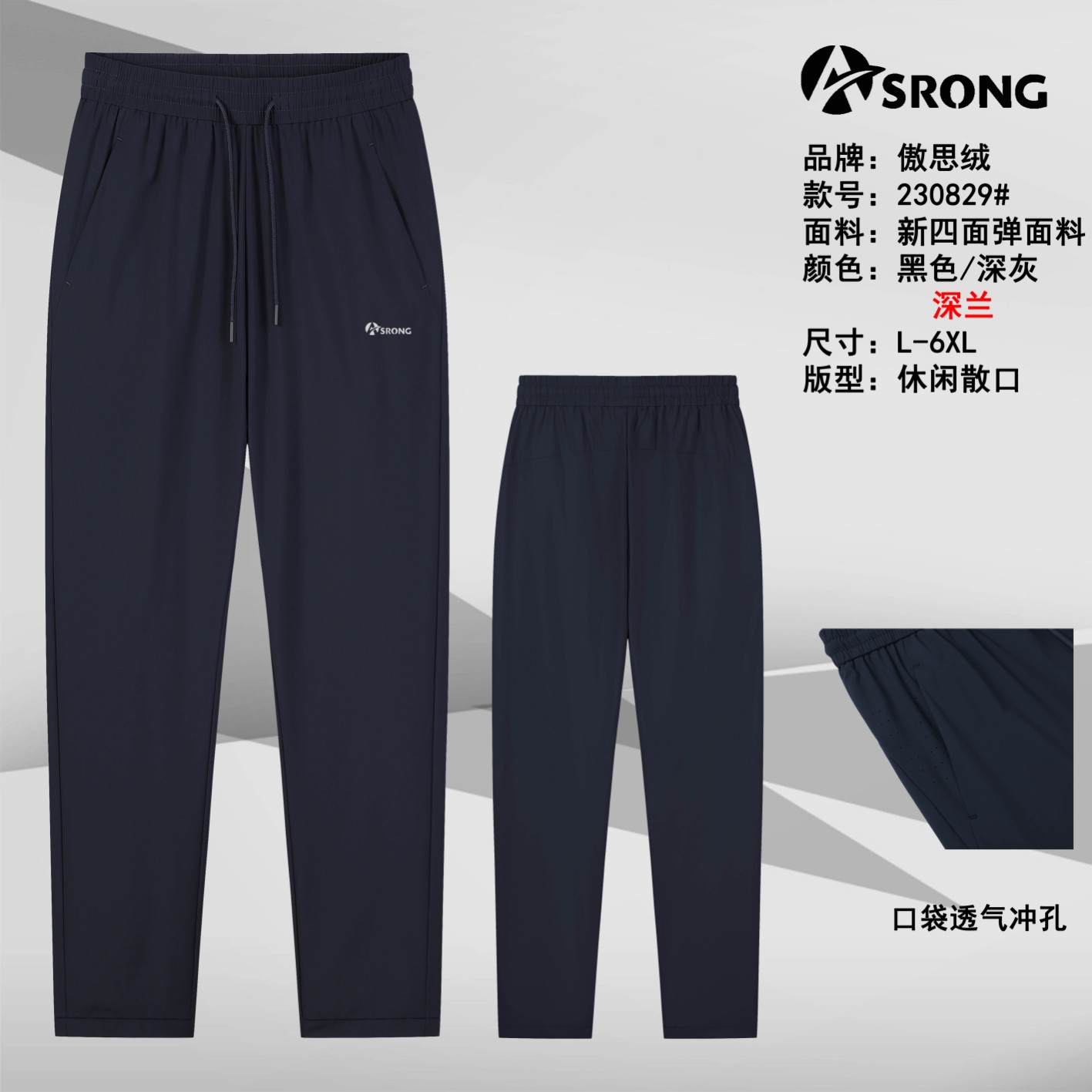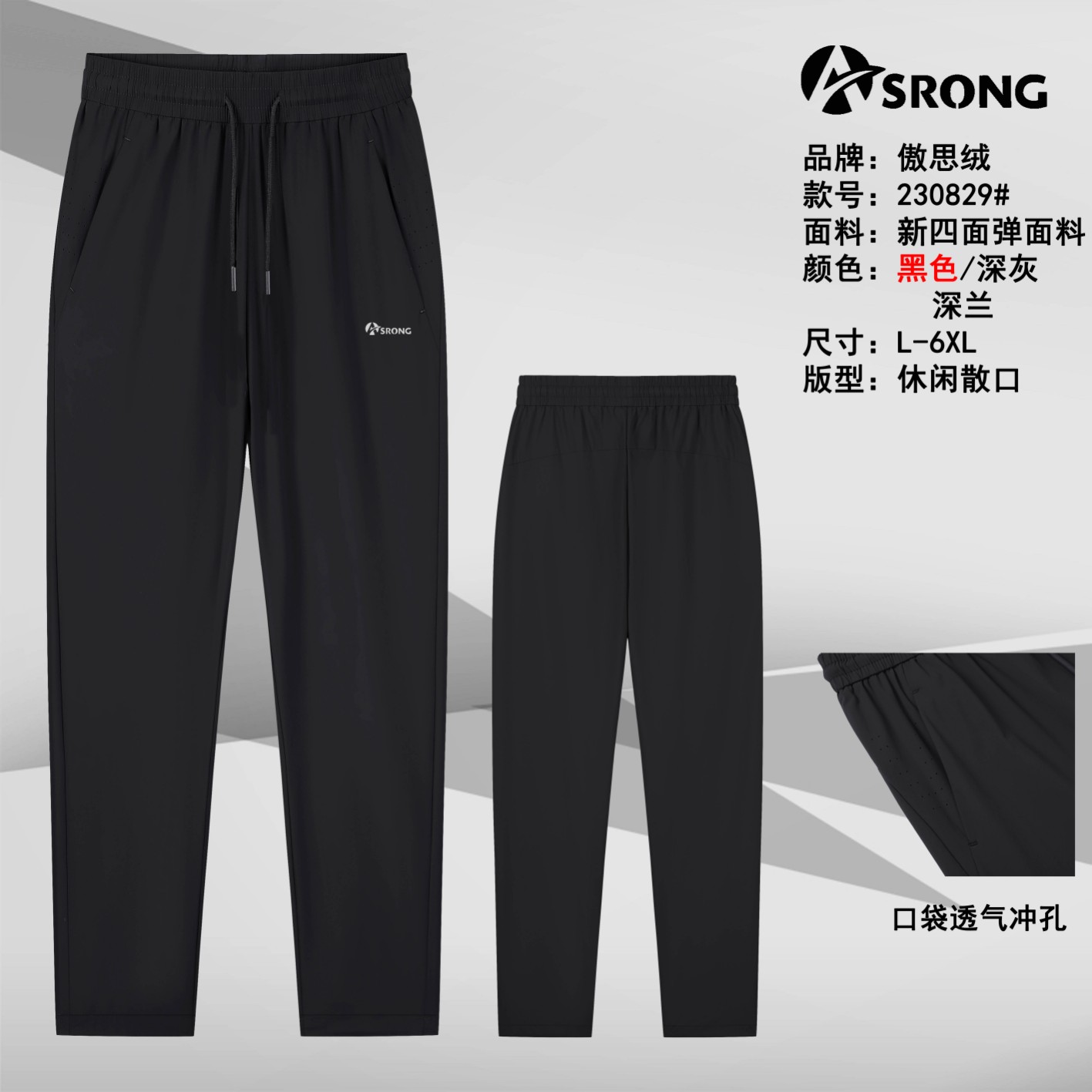 【款号】:230829 【品牌】:傲思绒 【品名】:休闲单裤 【颜色】:黑色 深灰 深兰 【尺码】:L一6XL 【面料】:新四面弹面料 【版型】:休闲散口