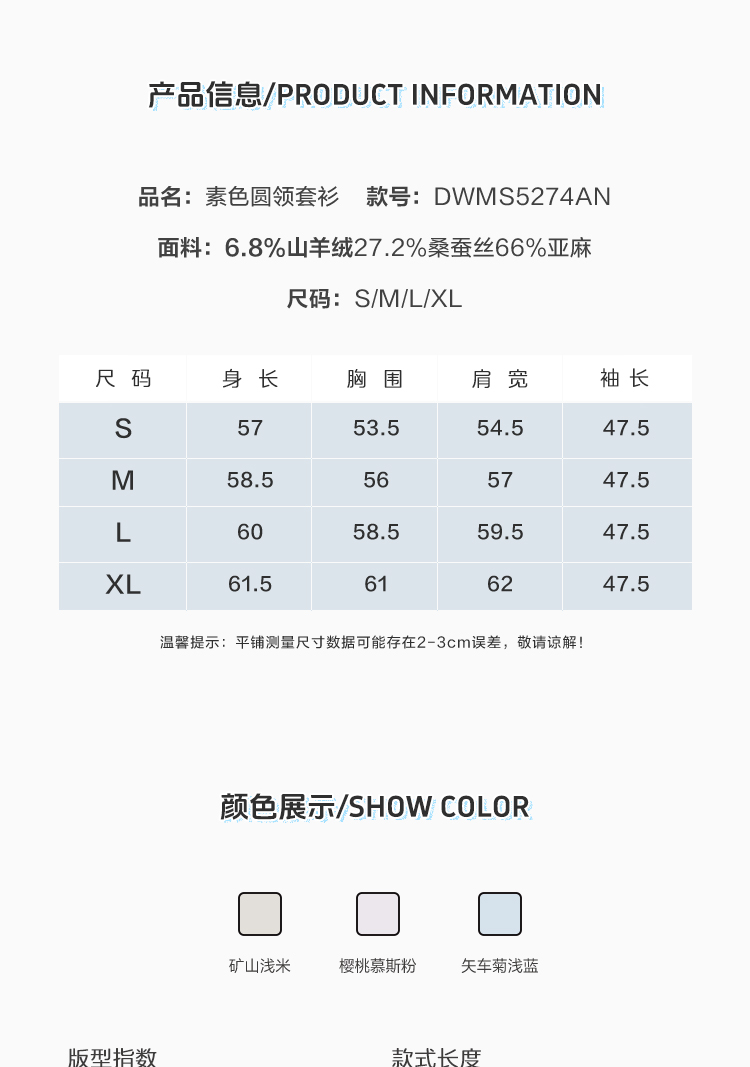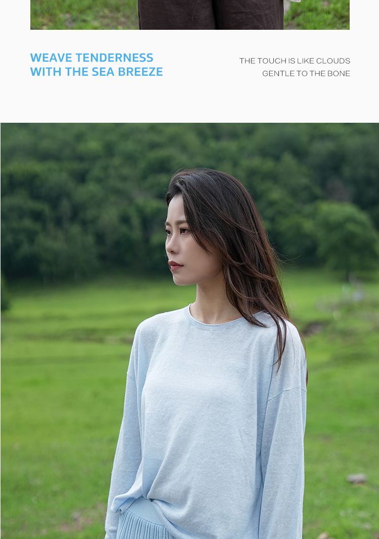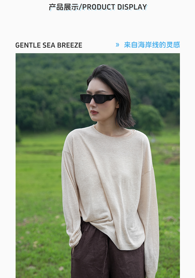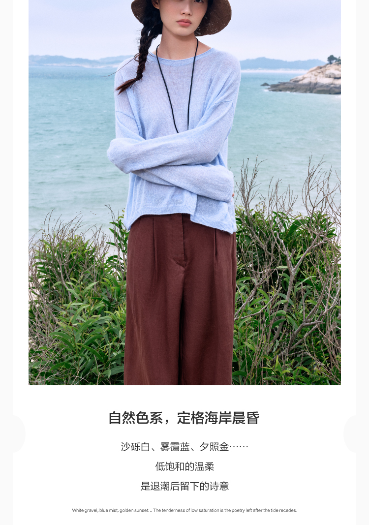 东黎 • 温柔的海风 山羊绒桑蚕丝亚麻女士素色圆领套衫 5274