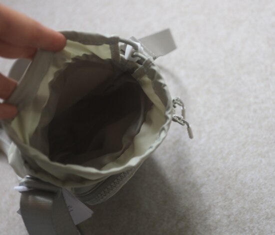 后面主袋 抽绳收紧 内无隔断 是专为小露水壶设计的 适用于大部分水壶吧