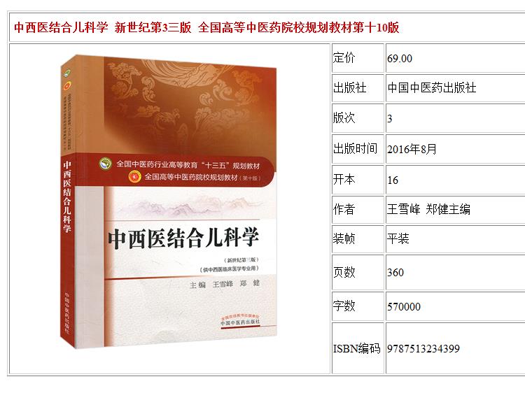 中西医结合儿科学 新世纪第3三版 全国高等中医药院校规划教材 第十10版 王雪峰郑健主编 中国中医药出版社供中西医临床医学专业用