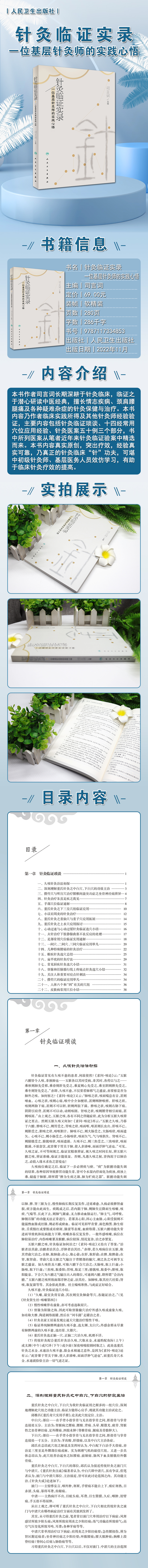 本书作者司言词长期深耕于针灸临床,临证之于潜心研读中医经典,擅长情志疾病、颈肩腰腿痛及各种疑难杂症的针灸保健与治疗。本书内容乃作者临床实践所得及其他针灸师经验验证,主要内容包括针灸临证琐谈、十四经常用穴位应用经验、针灸医案五十例三个部分,书中所列医案从笔者近年来针灸临证验案中精选而来。本书内容真实原创,突出疗效,经验真实可靠,乃真正的针灸临床“针”功夫,可堪中初级针灸师、基层医务人员效仿学习,有助于临床针灸疗效的提高。
