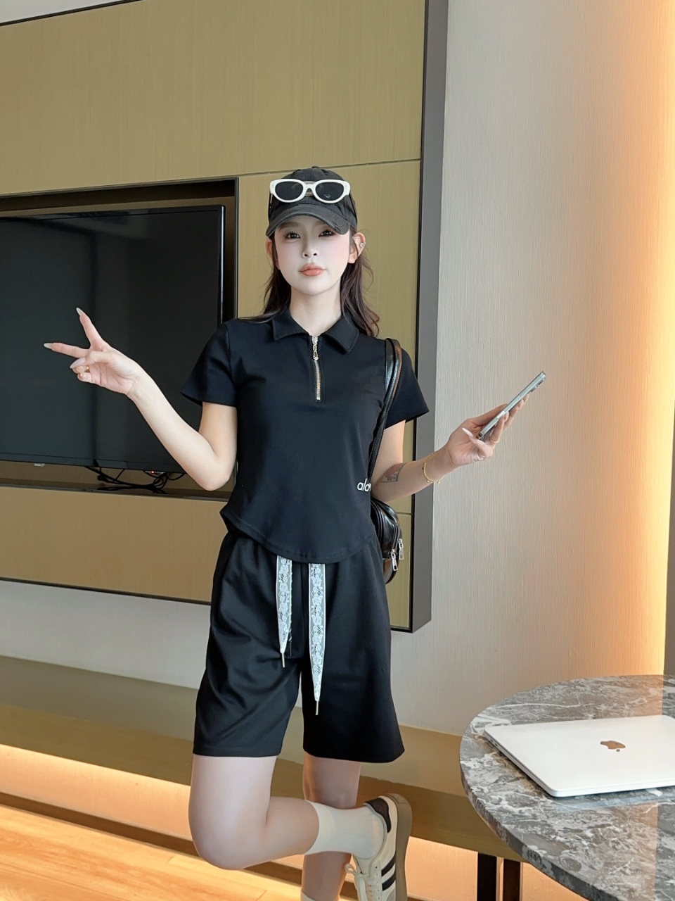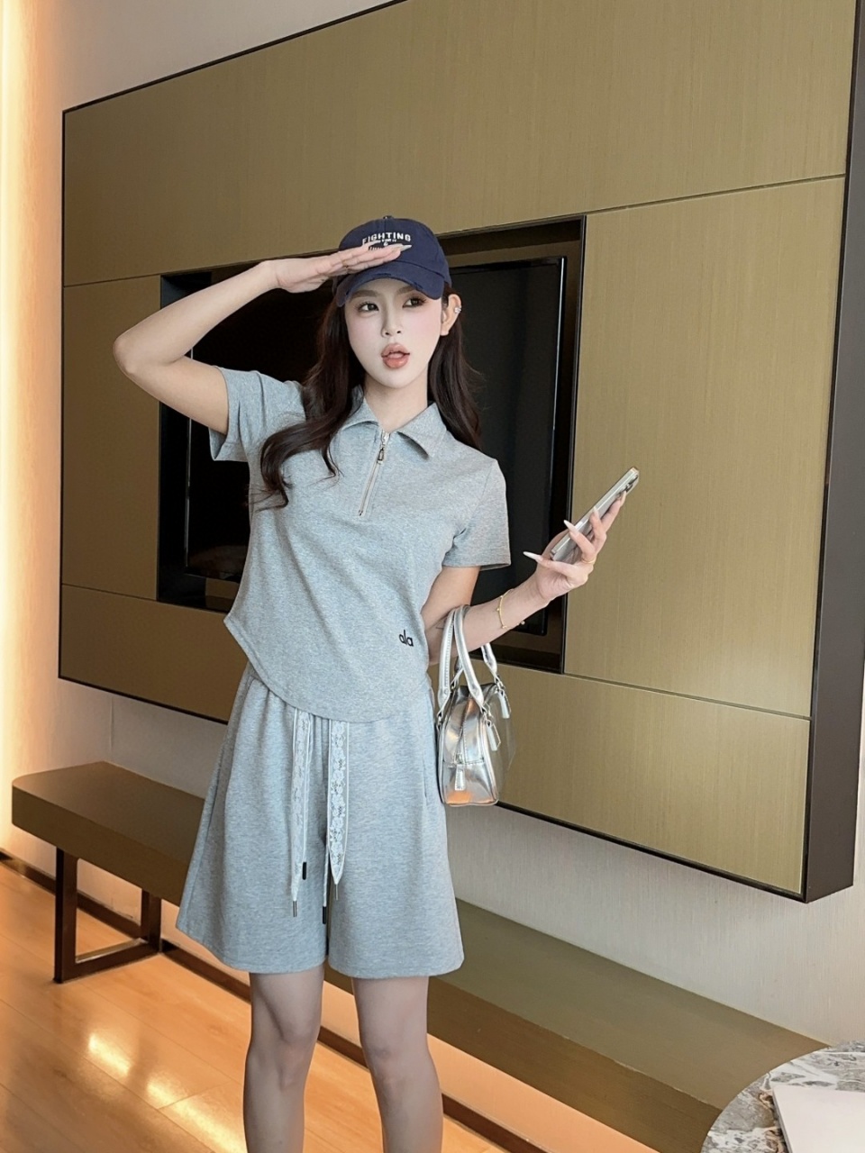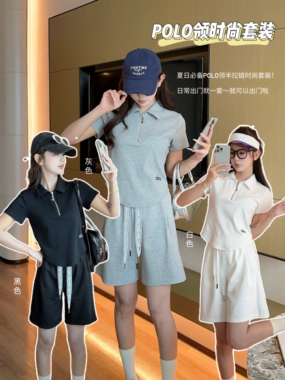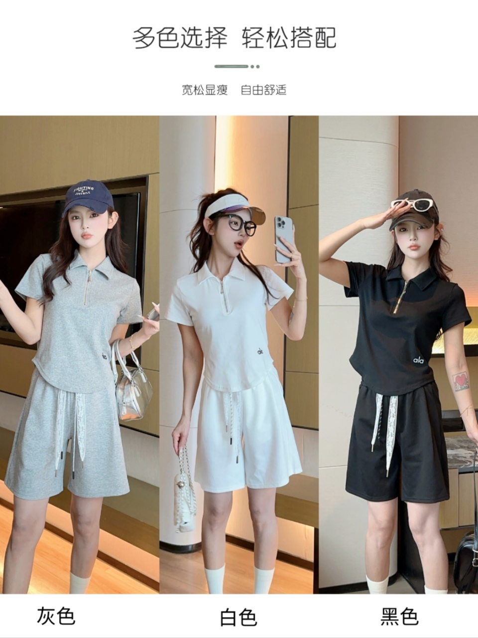 【YW】无忧购韩版修身翻领运动短袖T短裤两件套纯色百搭款610 710(截单后3-5天发货)