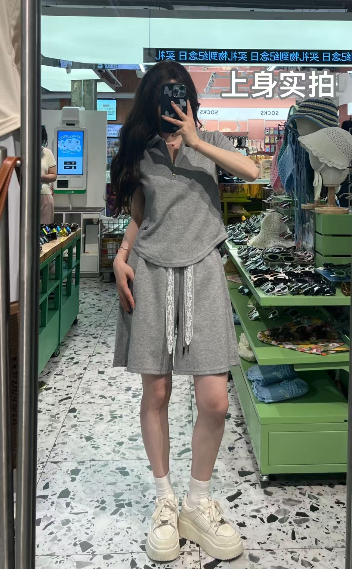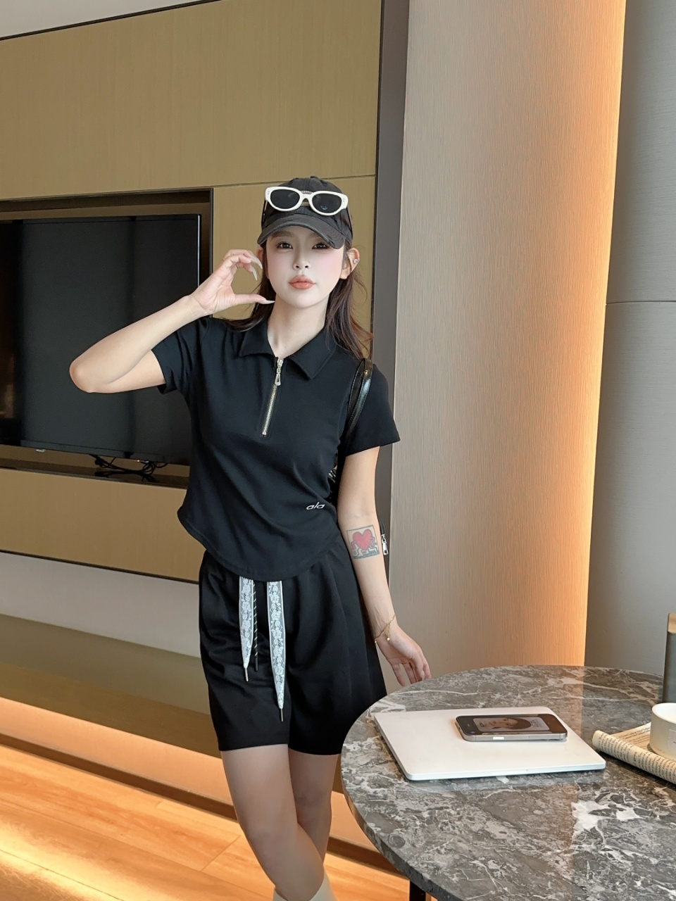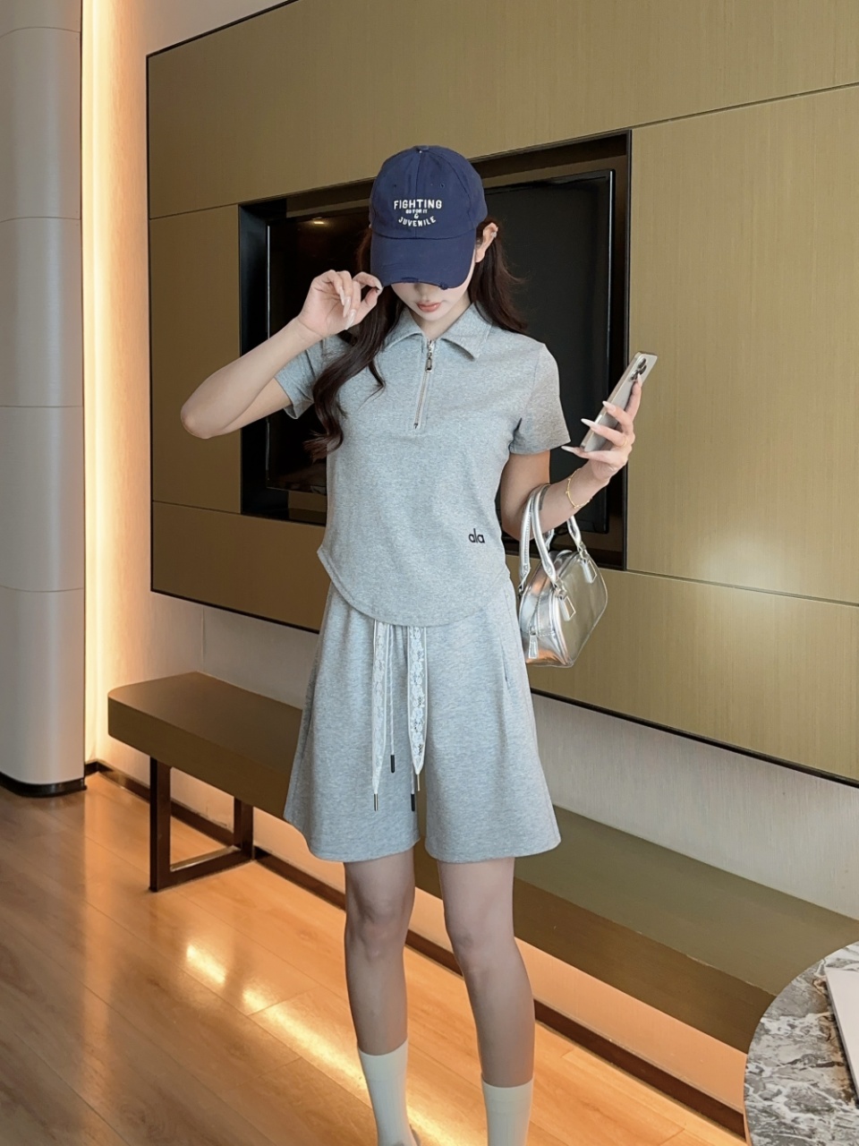 【YW】无忧购韩版修身翻领运动短袖T短裤两件套纯色百搭款610 710(截单后3-5天发货)