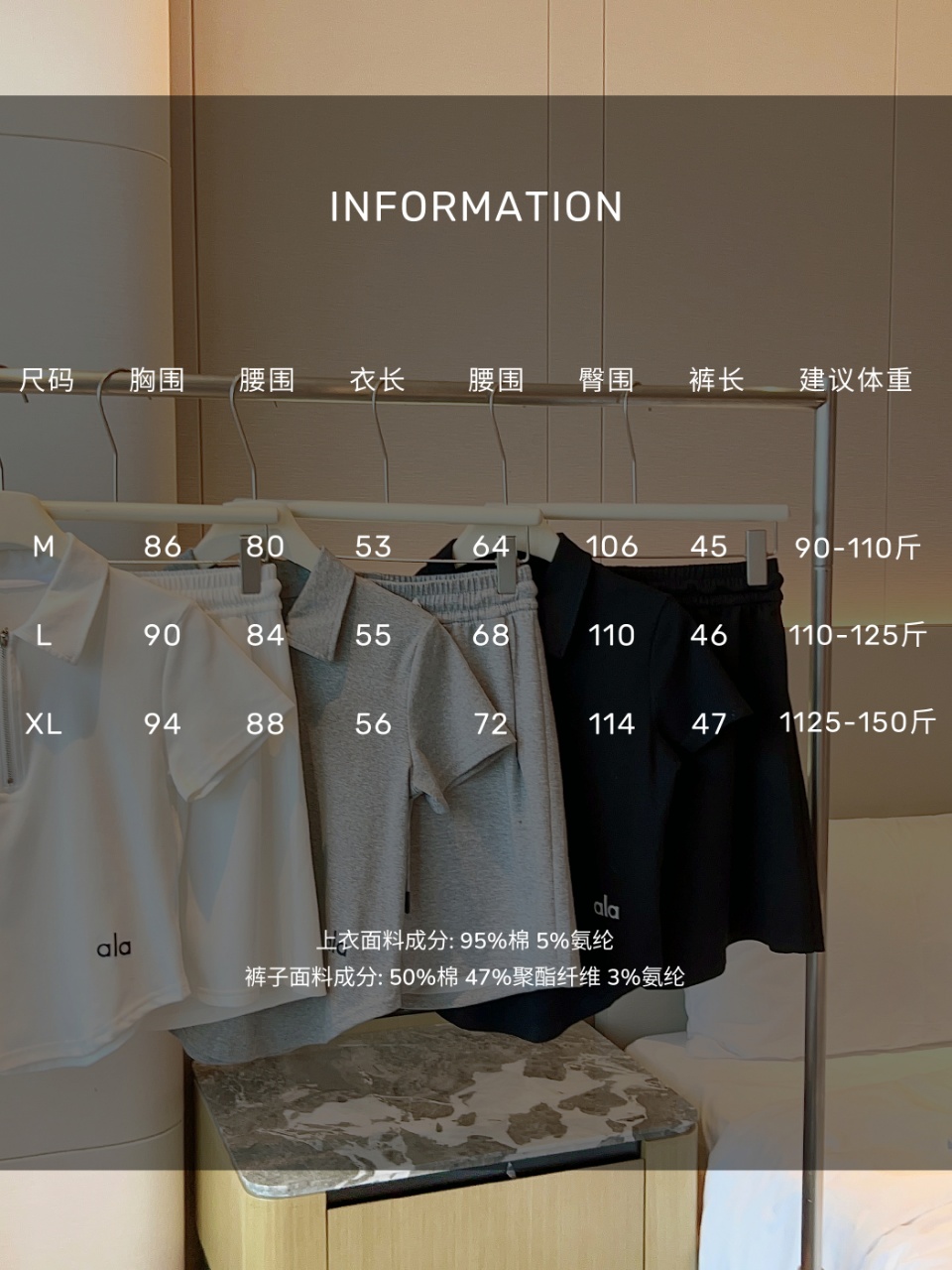 面料:上衣95%棉、5%氨纶 ,短裤50%棉、47%聚酯纤维、3%氨纶