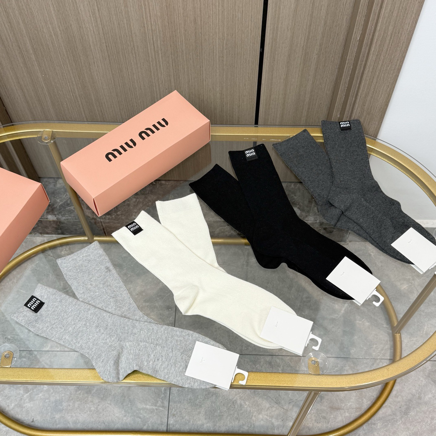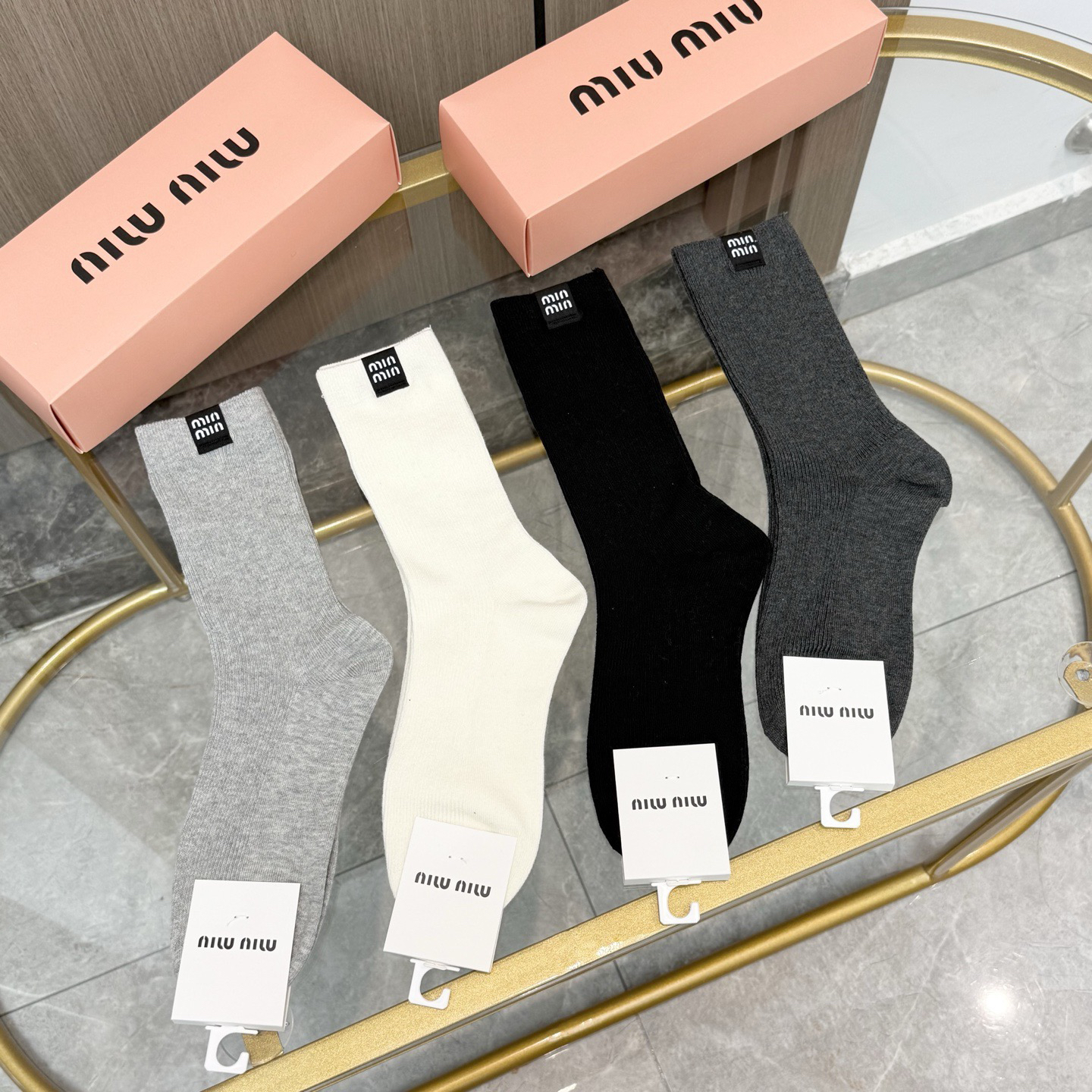 秋冬特惠💰150 缪缪袜子【一盒四双】缪缪高版本 ~好看到爆款袜子 双针烫印中筒袜