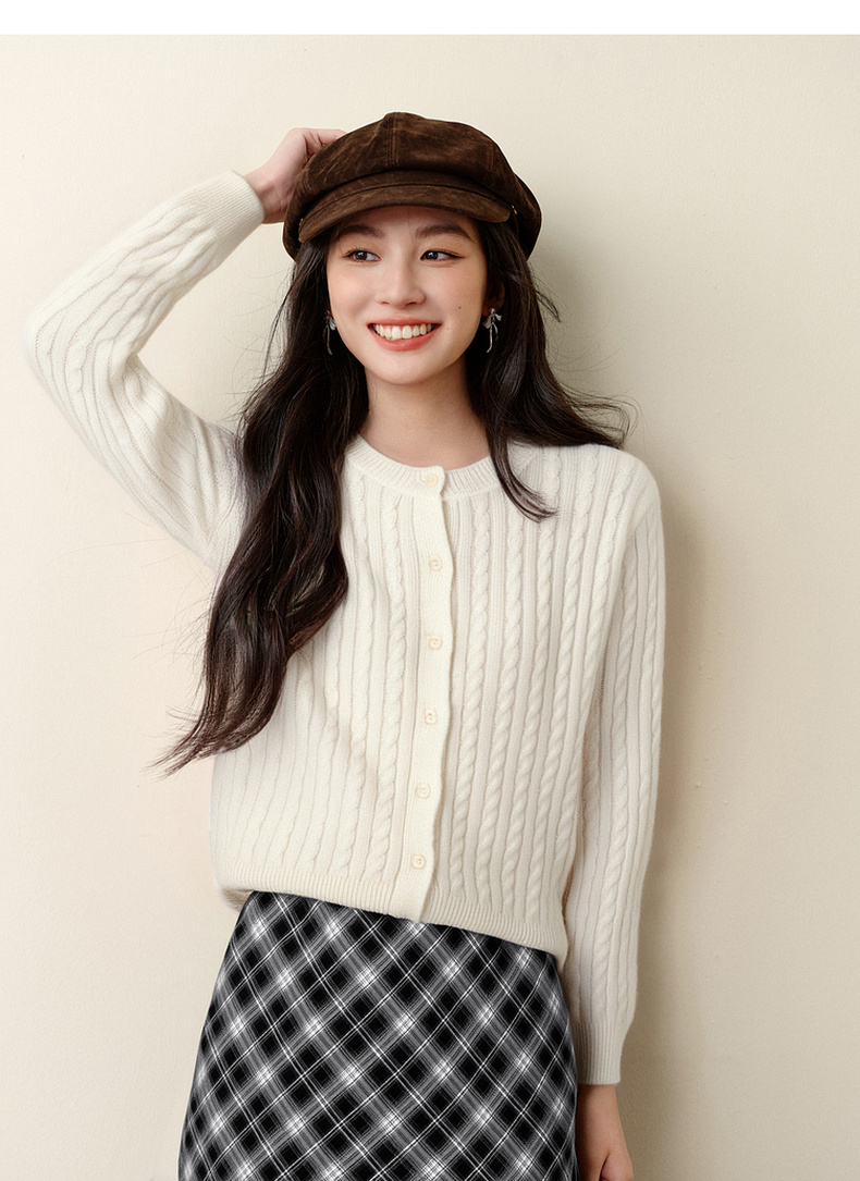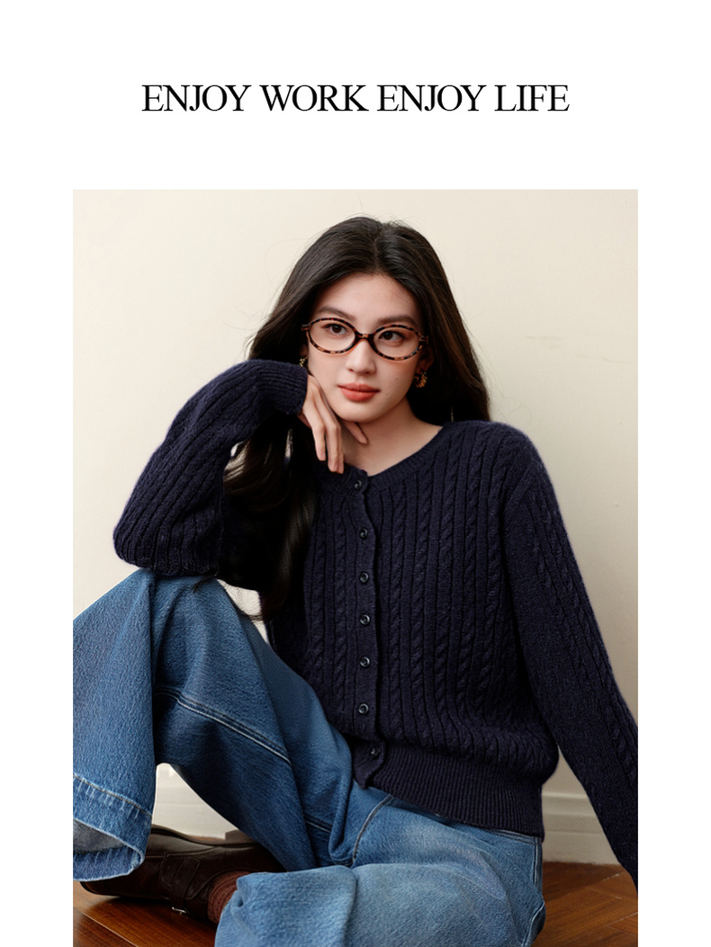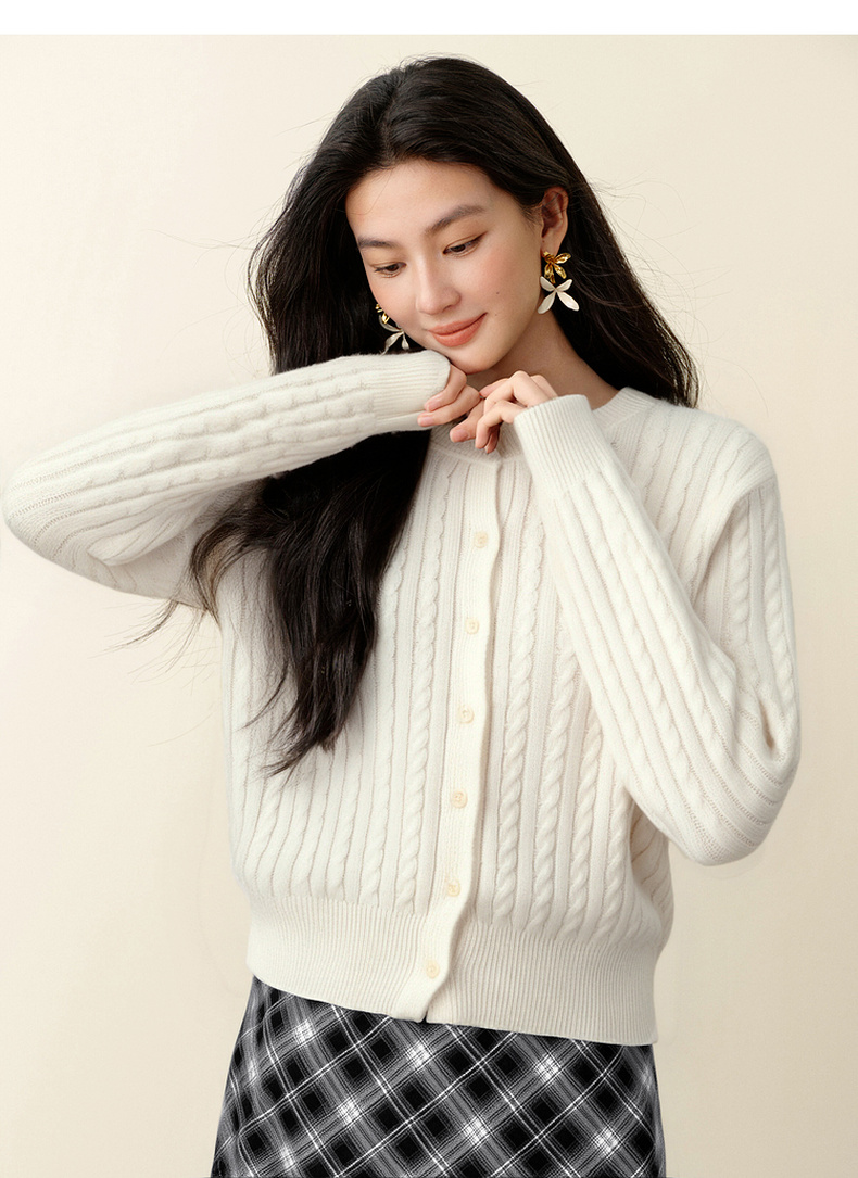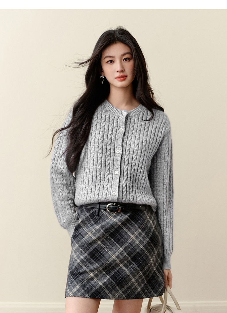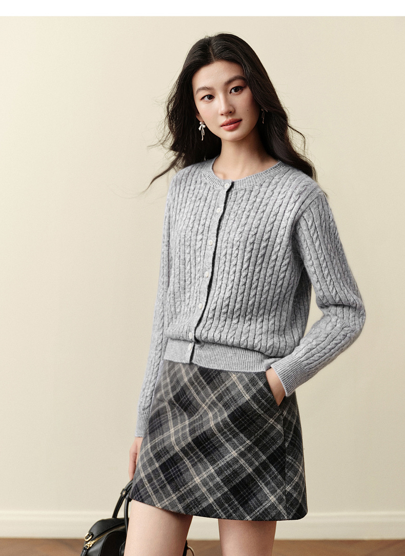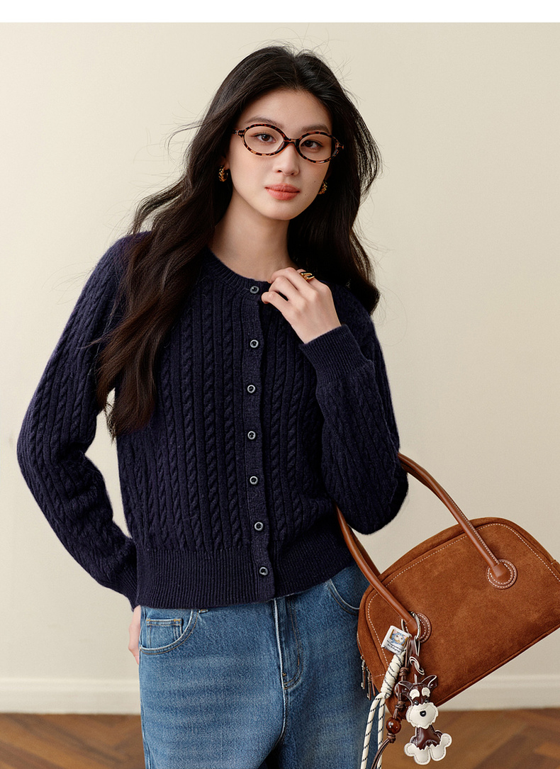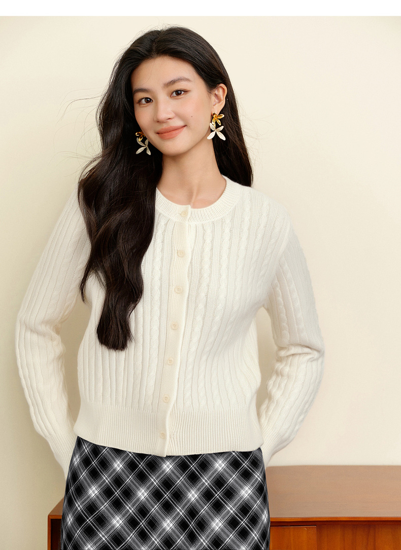 【严选】诗凡黎圆领基础绞花针织开衫2025秋冬新款软糯舒适百搭毛衫外套女7G9433071