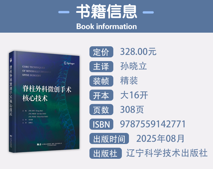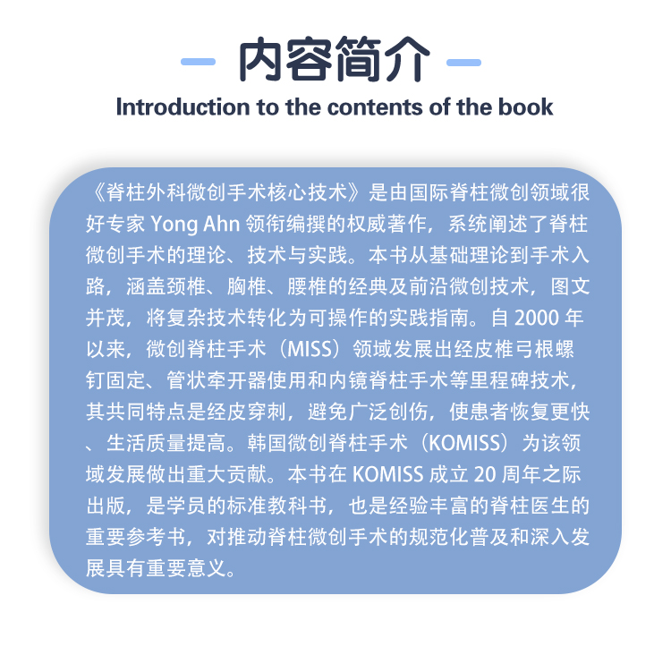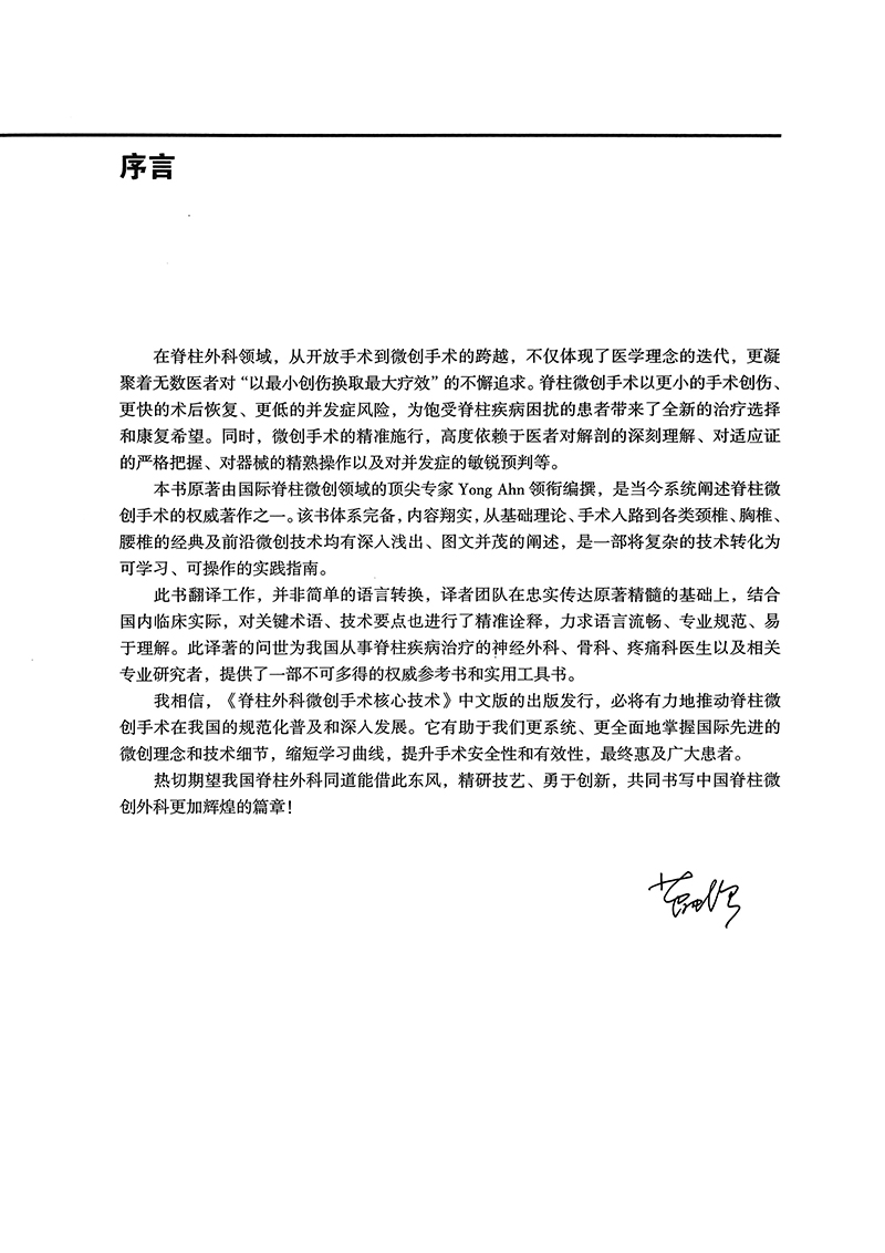 《脊柱外科微创手术核心技术》是由国际脊柱微创领域很好专家 Yong Ahn 领衔编撰的权威著作,系统阐述了脊柱微创手术的理论、技术与实践。本书从基础理论到手术入路,涵盖颈椎、胸椎、腰椎的经典及前沿微创技术,图文并茂,将复杂技术转化为可操作的实践指南。自 2000 年以来,微创脊柱手术(MISS)领域发展出经皮椎弓根螺钉固定、管状牵开器使用和内镜脊柱手术等里程碑技术,其共同特点是经皮穿刺,避免广泛创伤,使患者恢复更快、生活质量提高。韩国微创脊柱手术(KOMISS)为该领域发展做出重大贡献。本书在 KOMISS 成立 20 周年之际出版,是学员的标准教科书,也是经验丰富的脊柱医生的重要参考书,对推动脊柱微创手术的规范化普及和深入发展具有重要意义。