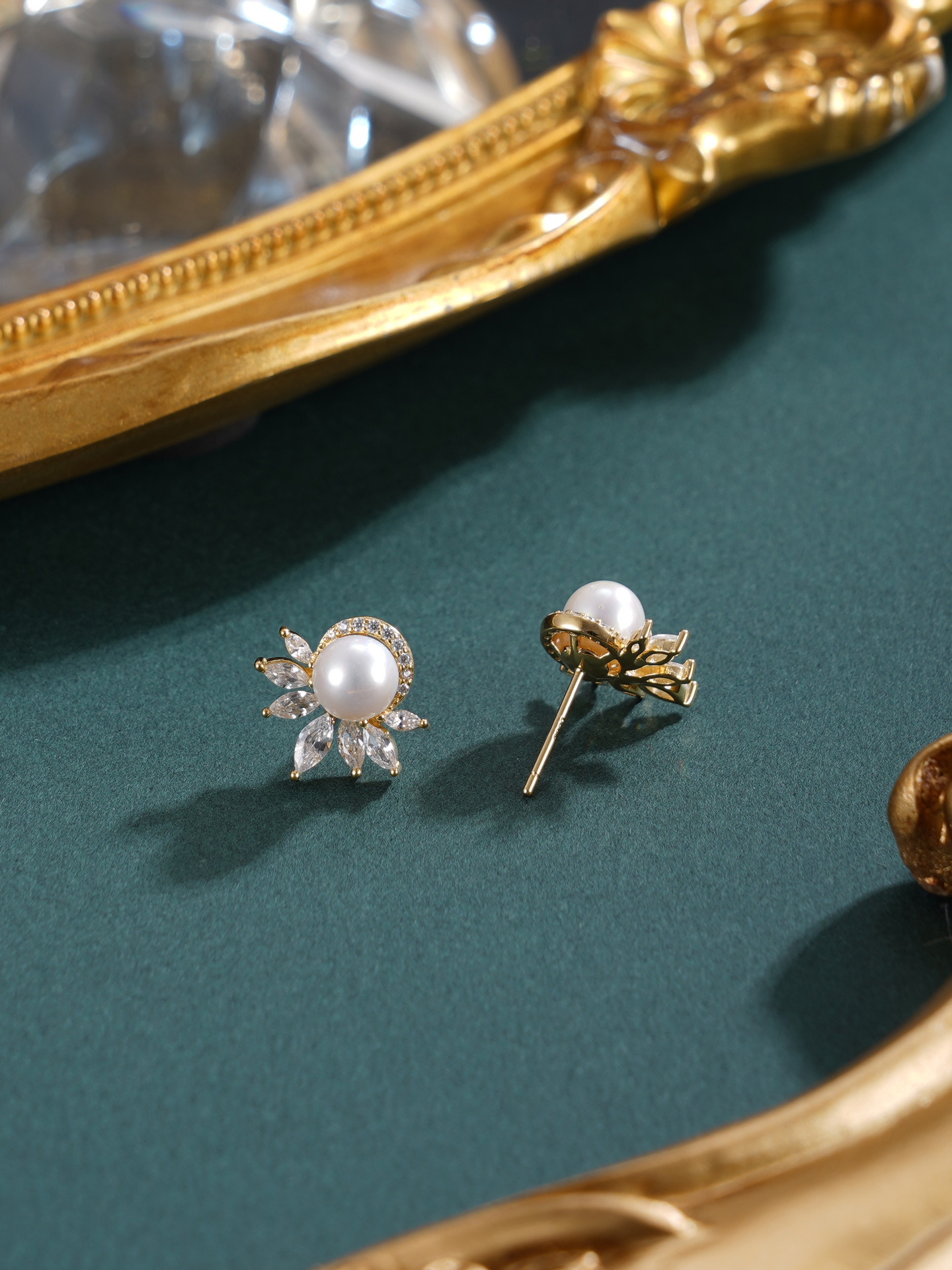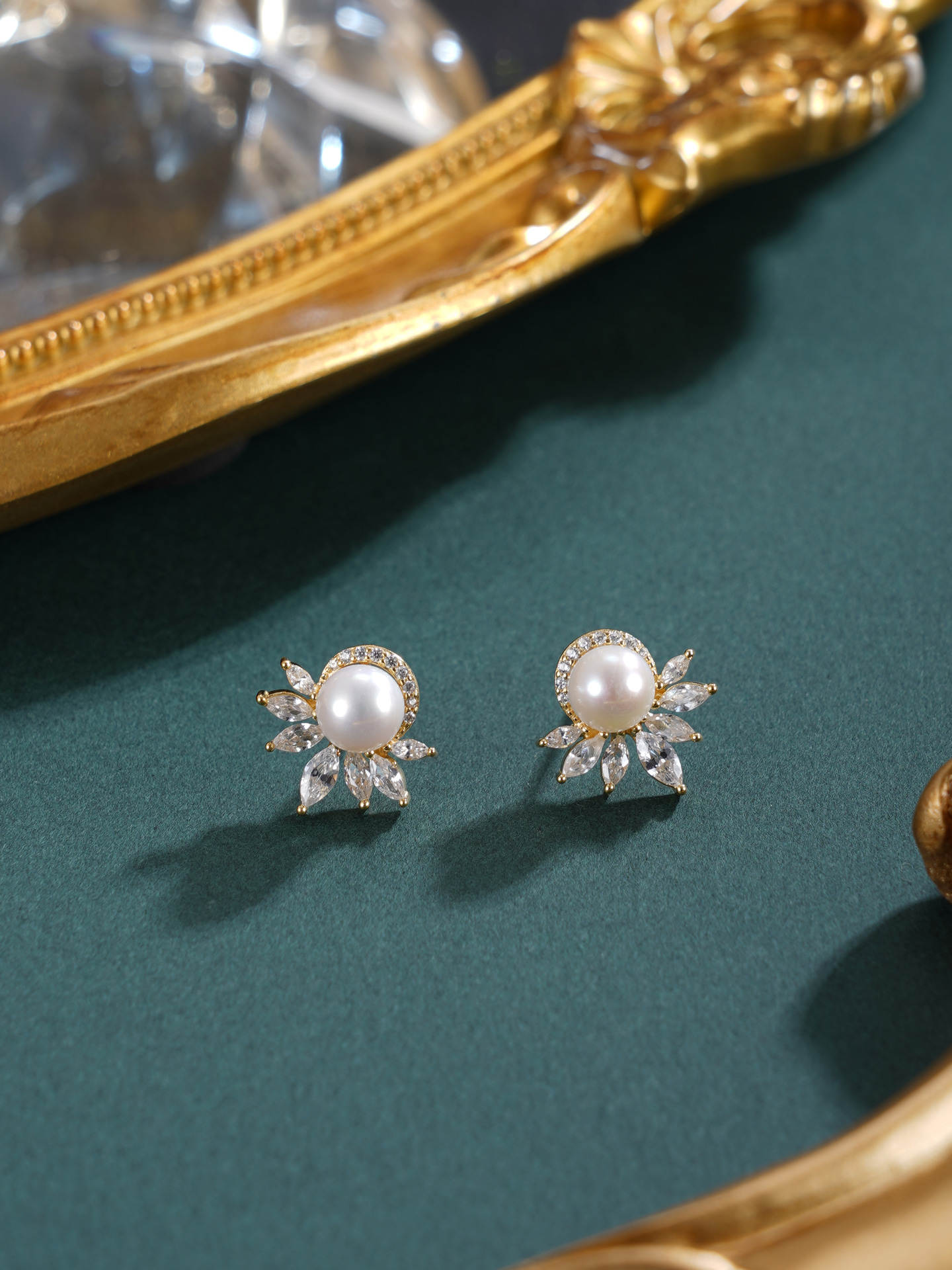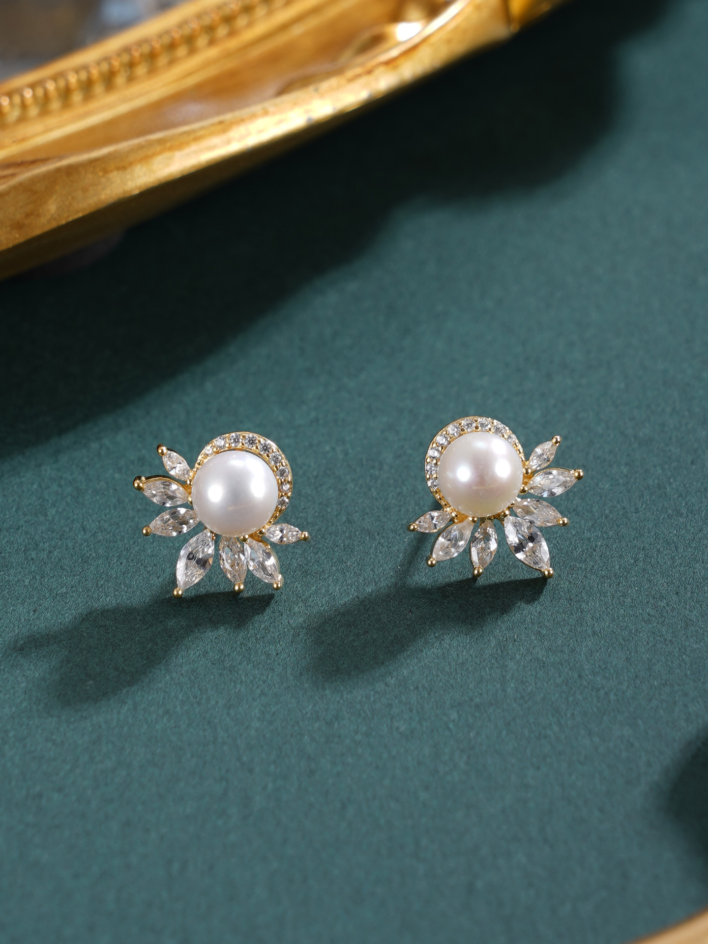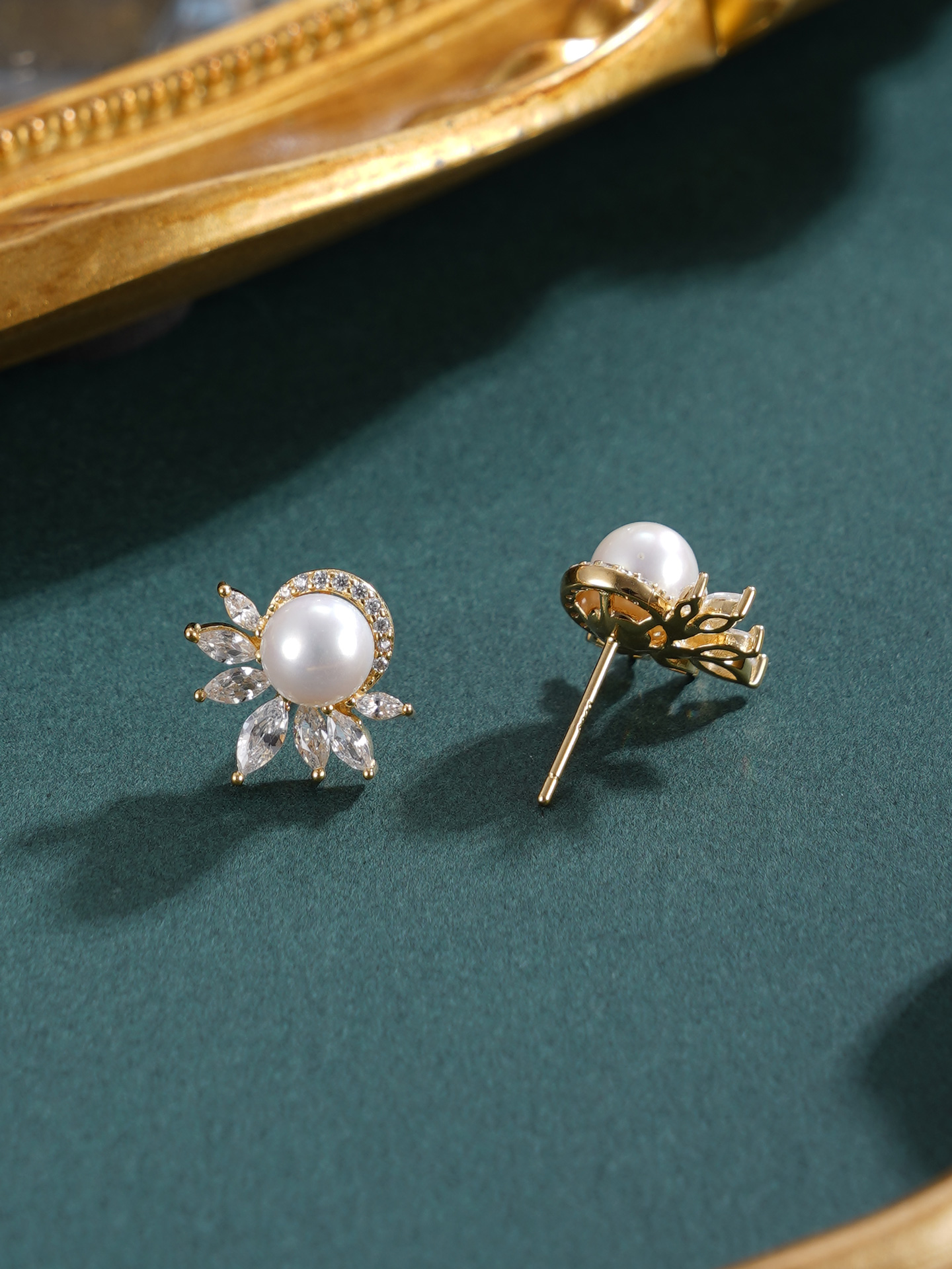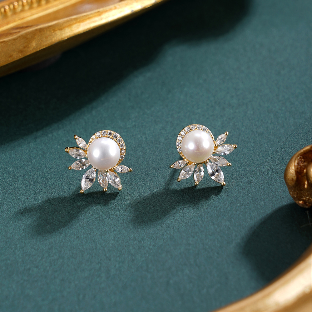 子佩集【花涧寻梦】银S925珍珠惜王妃耳钉【E4038】6mm珠镀金半花星芒2601
