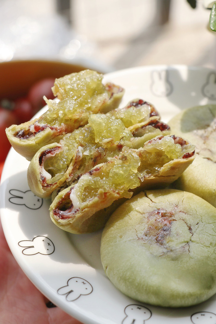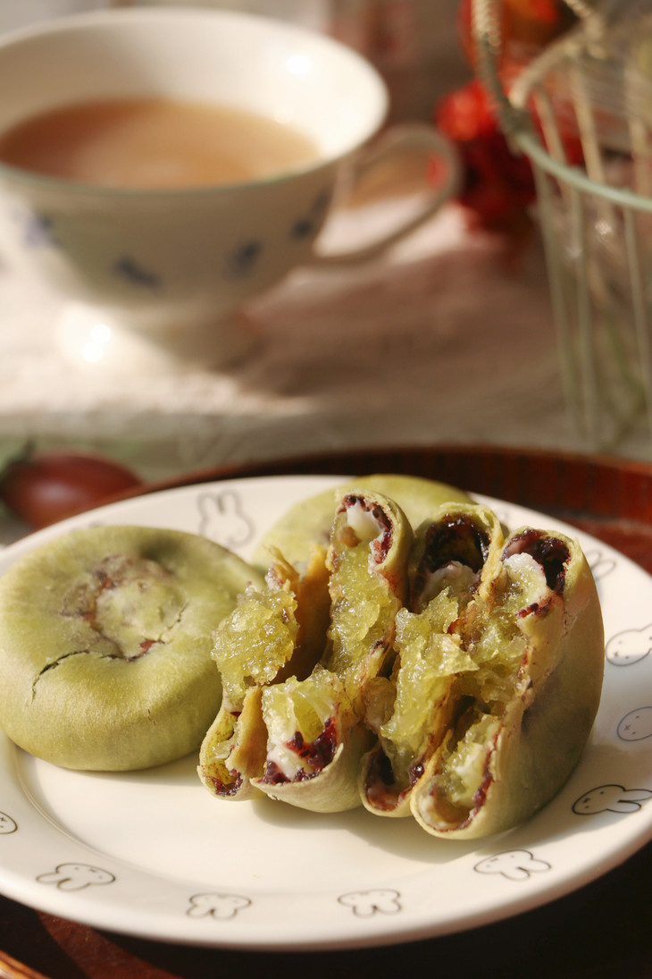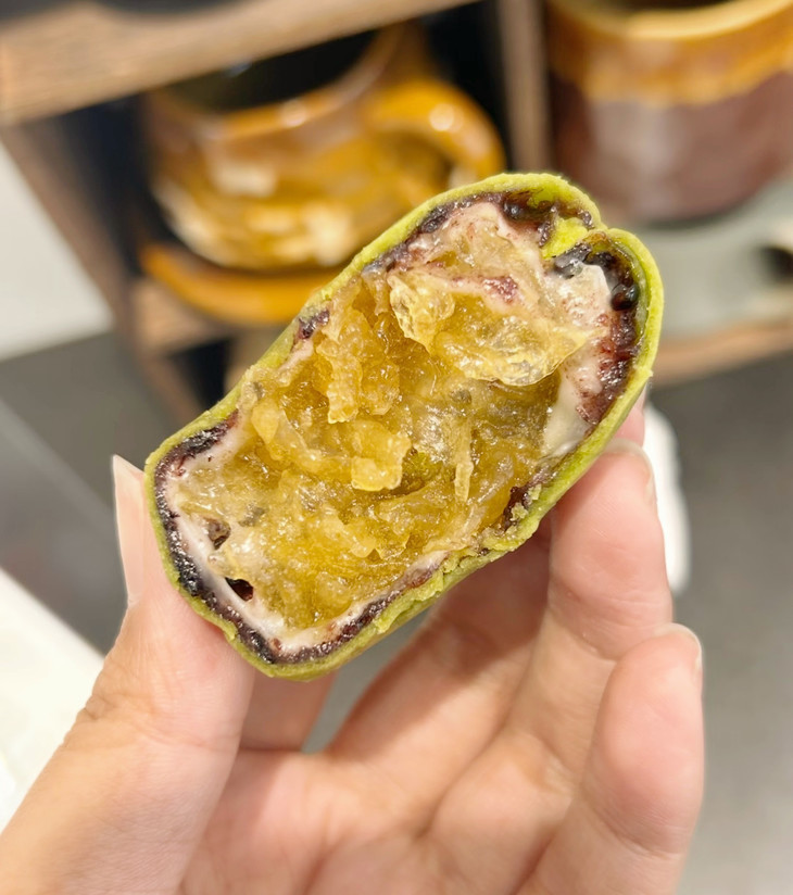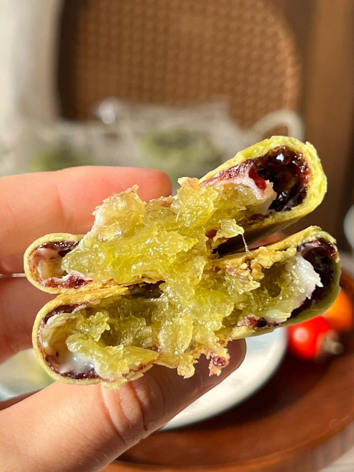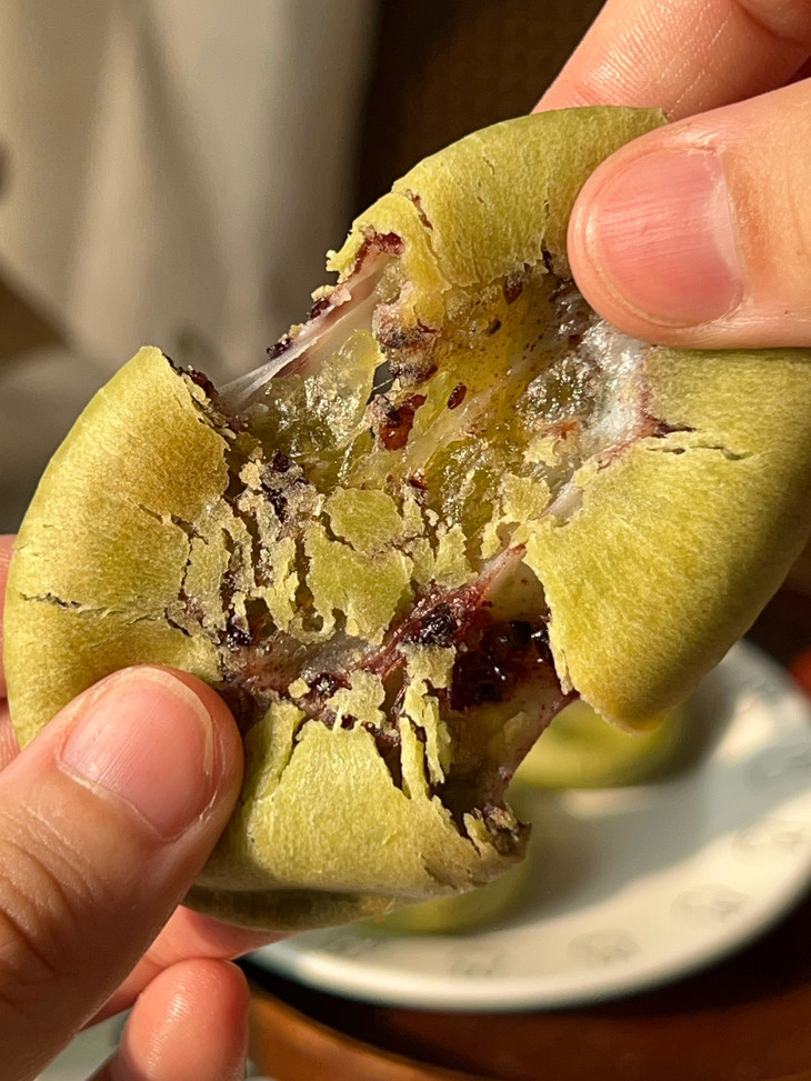 ✅特调四重內馅 外层小麦酥皮,二层裹着抹茶豆沙 三层夹着会拉丝的雪媚娘最内满满的龙井茶馅 轻咬一口,茶香与酥香层层递进,缓缓迸发