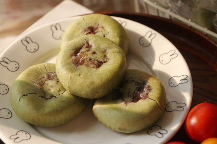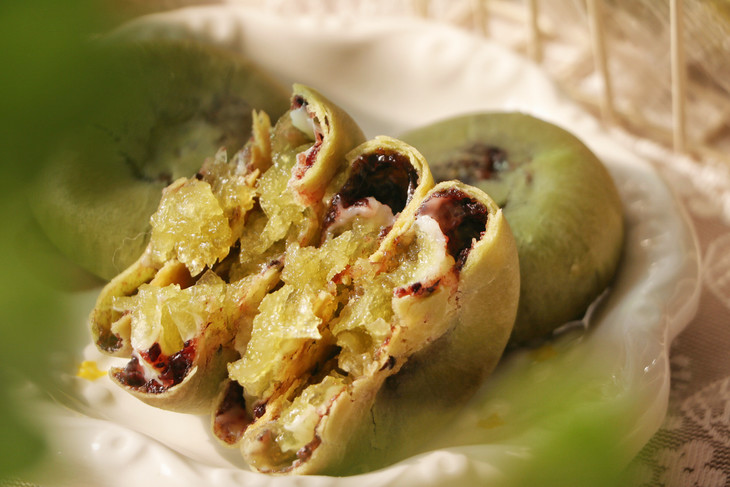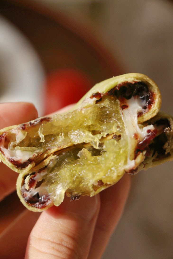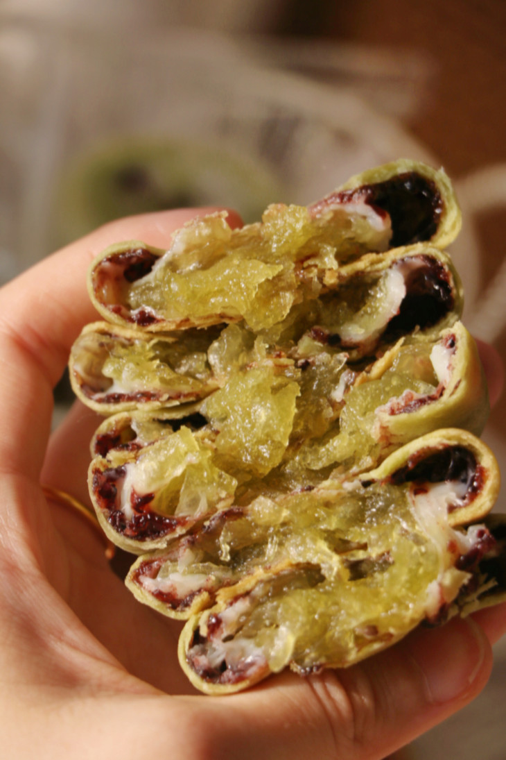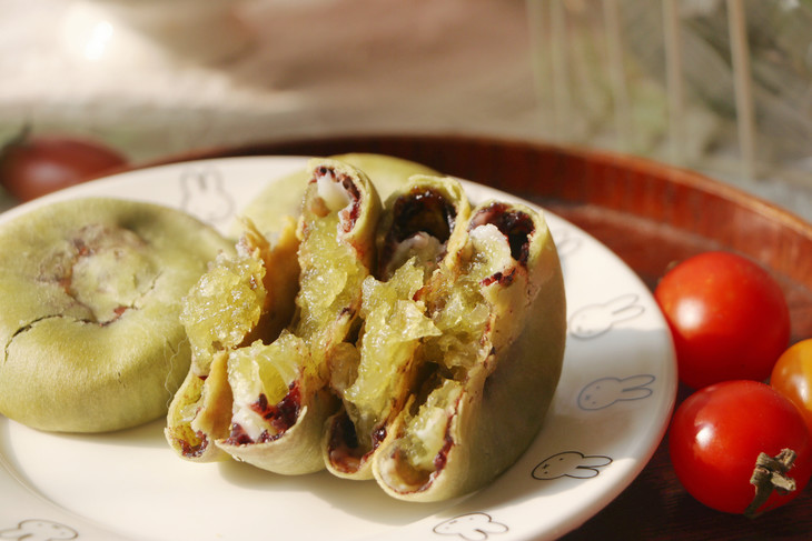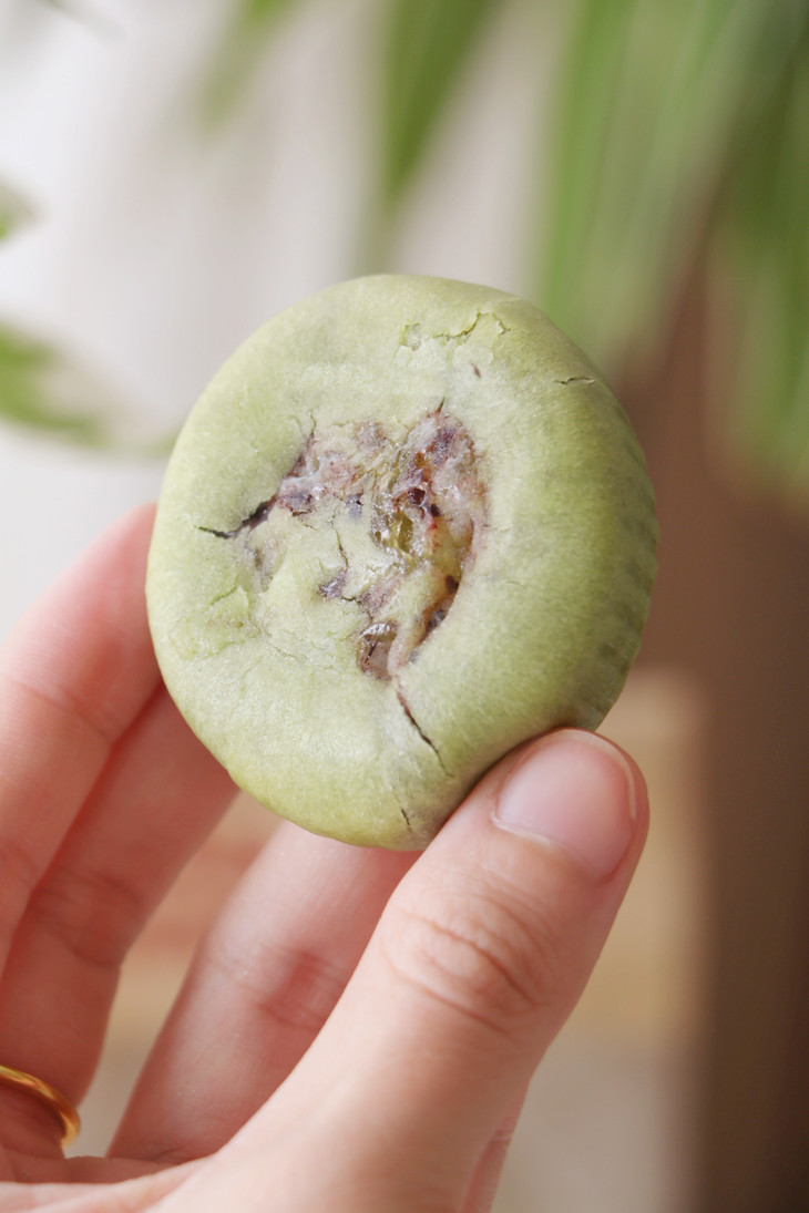 真的好吃到无语‼️ 别看它绿不拉几的 这是龙井八珍饼🍵馅料超丰富✅ 一口就入魂~真材实料扎实的很 龙井八珍馅+紫米馅+麻薯 最外面是抹茶酥皮,甜度刚刚好💗 很清甜,巨巨巨能拉丝~ 龙井的清、八珍的润~ 像在舌尖下了一场江南的春雨💕