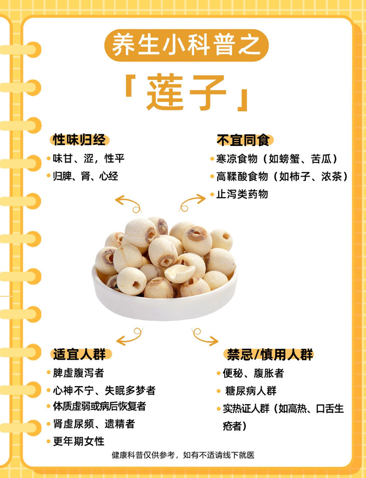 🔆莲子 莲子性味甘平 兼具补脾止泻与养心安神的双重功效 它的口感清甜粉糯,既能调和龙八珍饼的整体风味 又能在饱腹之余舒缓身心,助力改善睡眠质量 对于脾胃虚弱、睡眠不佳的人群来说 是十分友好的食材~