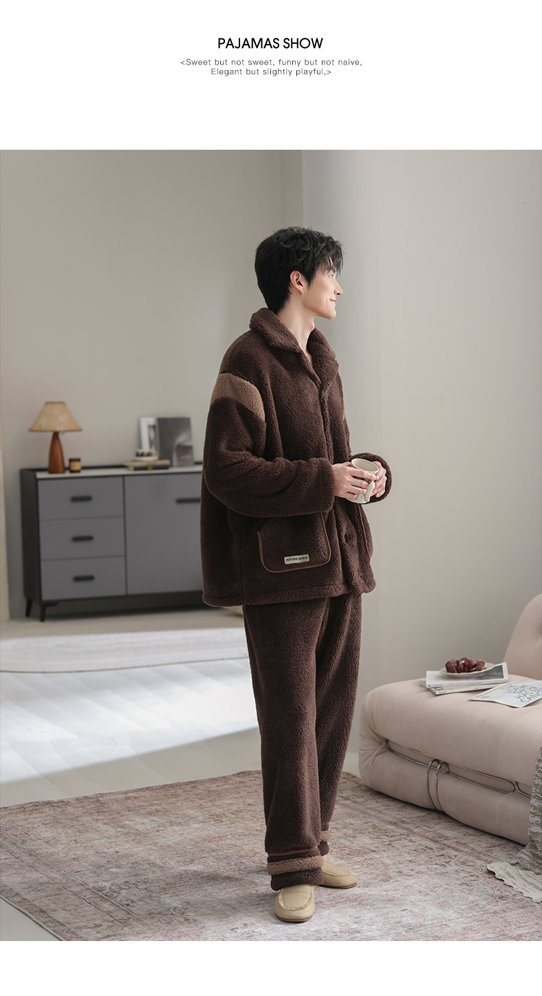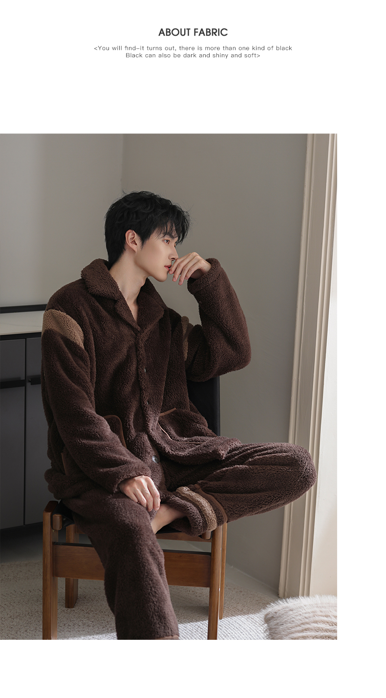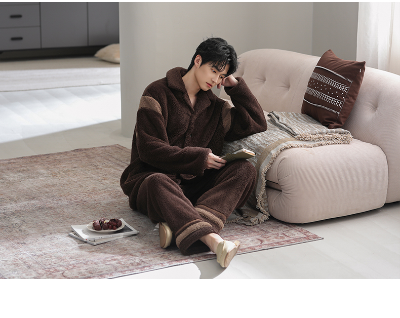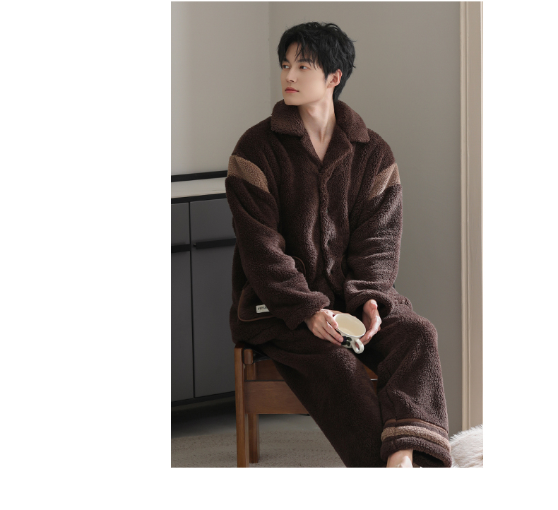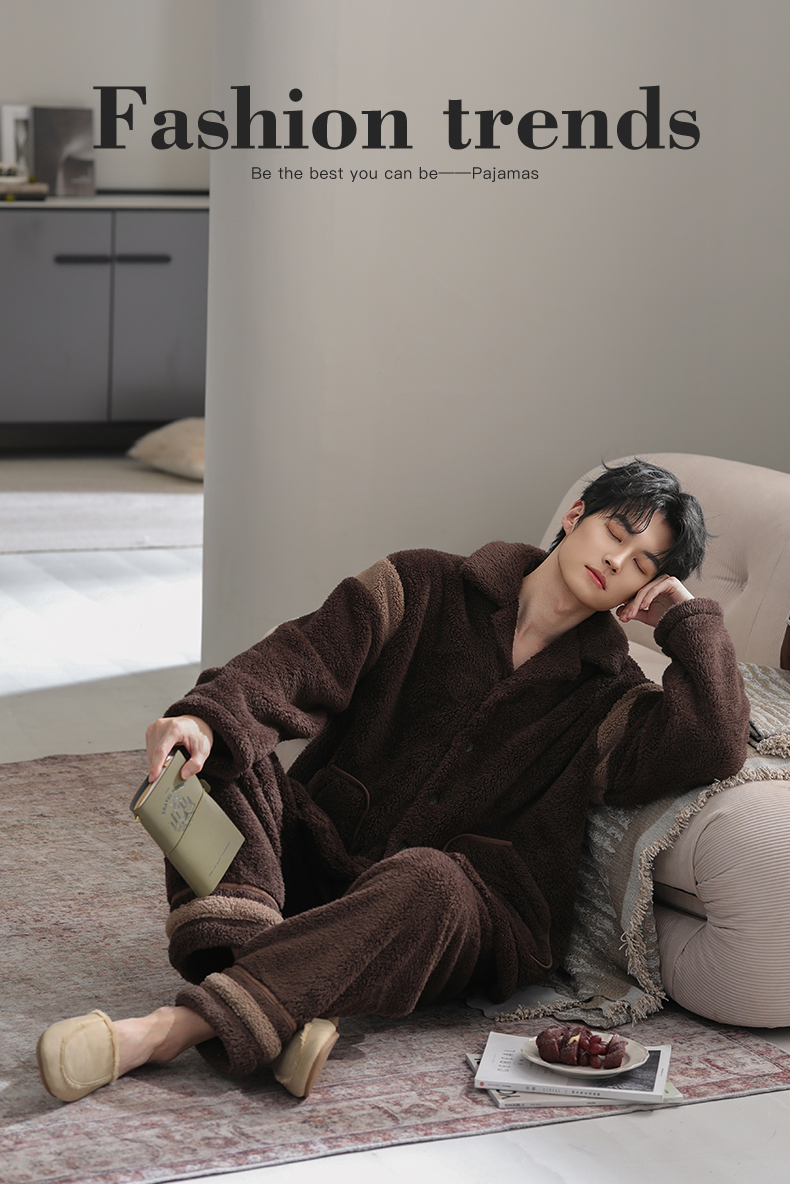 可人儿冬季男士保暖舒棉绒睡衣秋冬休闲翻领男款加厚珊瑚绒家居服