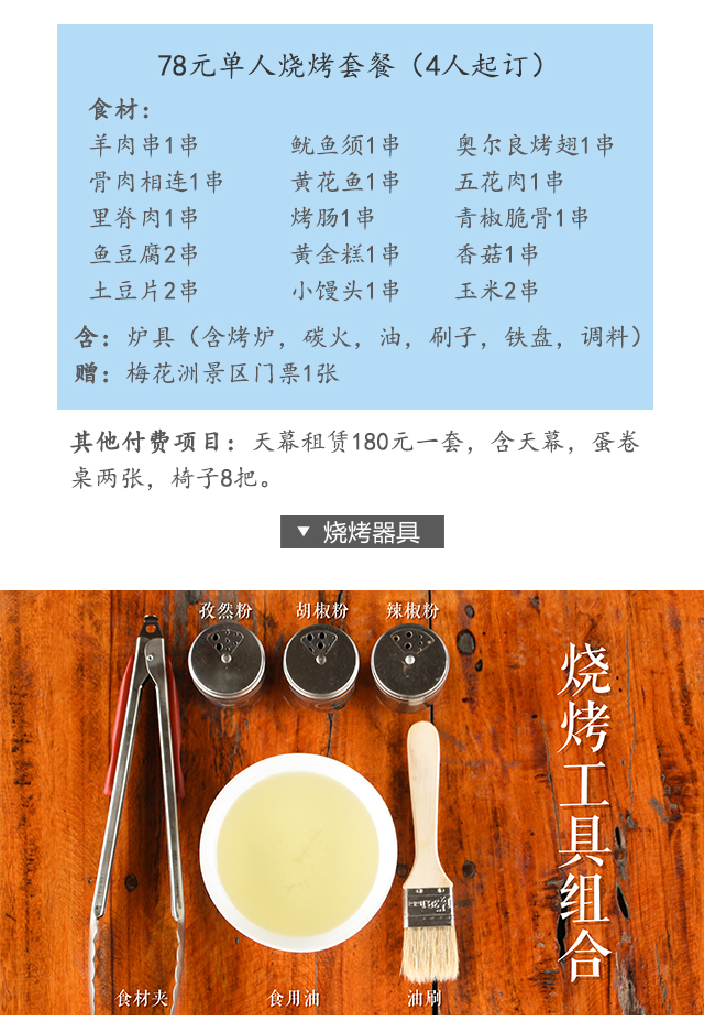 【烧烤套餐】78元/人,4人起订,预定烧烤套餐赠景区门票,需提前一天预约!