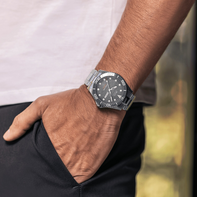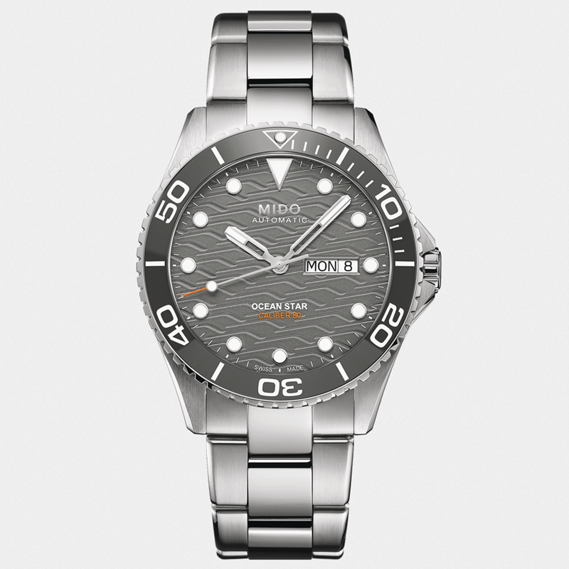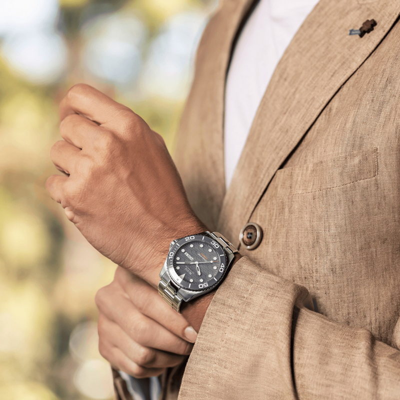 镜面 材质 | 蓝宝石水晶玻璃 | 表盘 | 丝光打磨不锈钢表壳 搭配陶瓷环丝光打磨单向旋转表圈 灰色表盘饰以波浪花纹,刻度经Super-LumiNova®白色夜光涂层处理 日期 星期显示 表壳背面清晰地饰有抛光海星 |