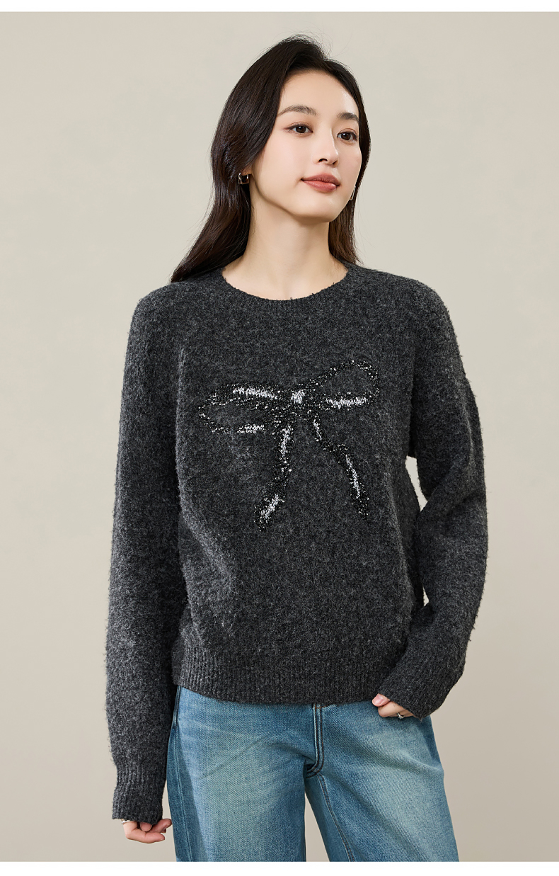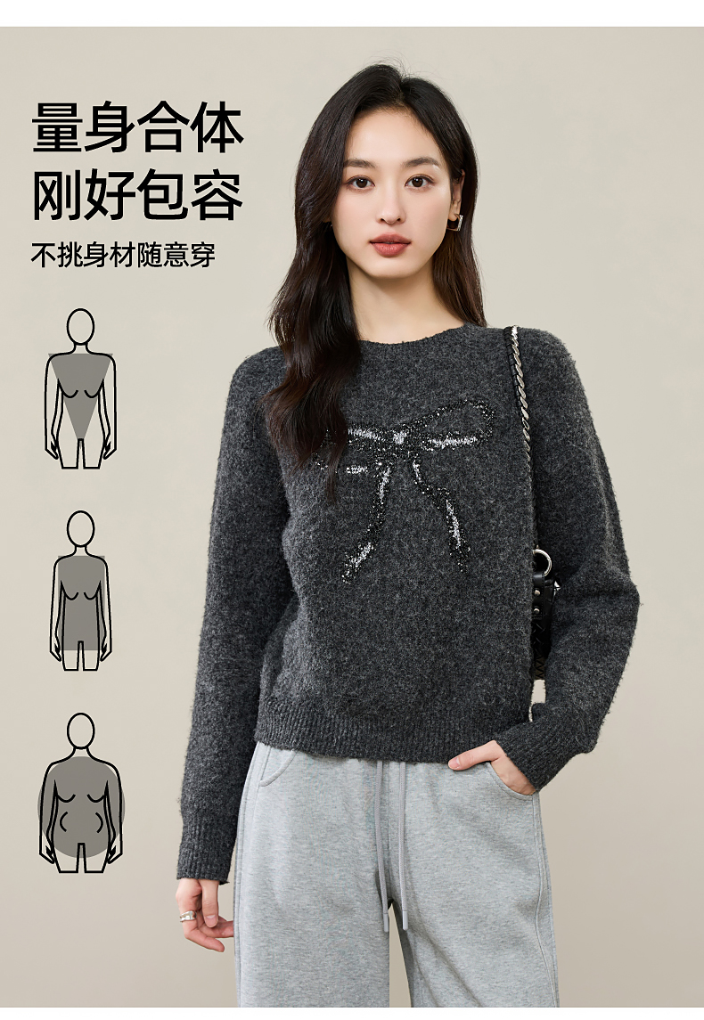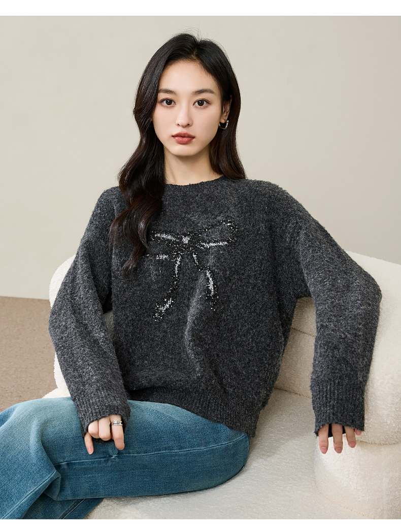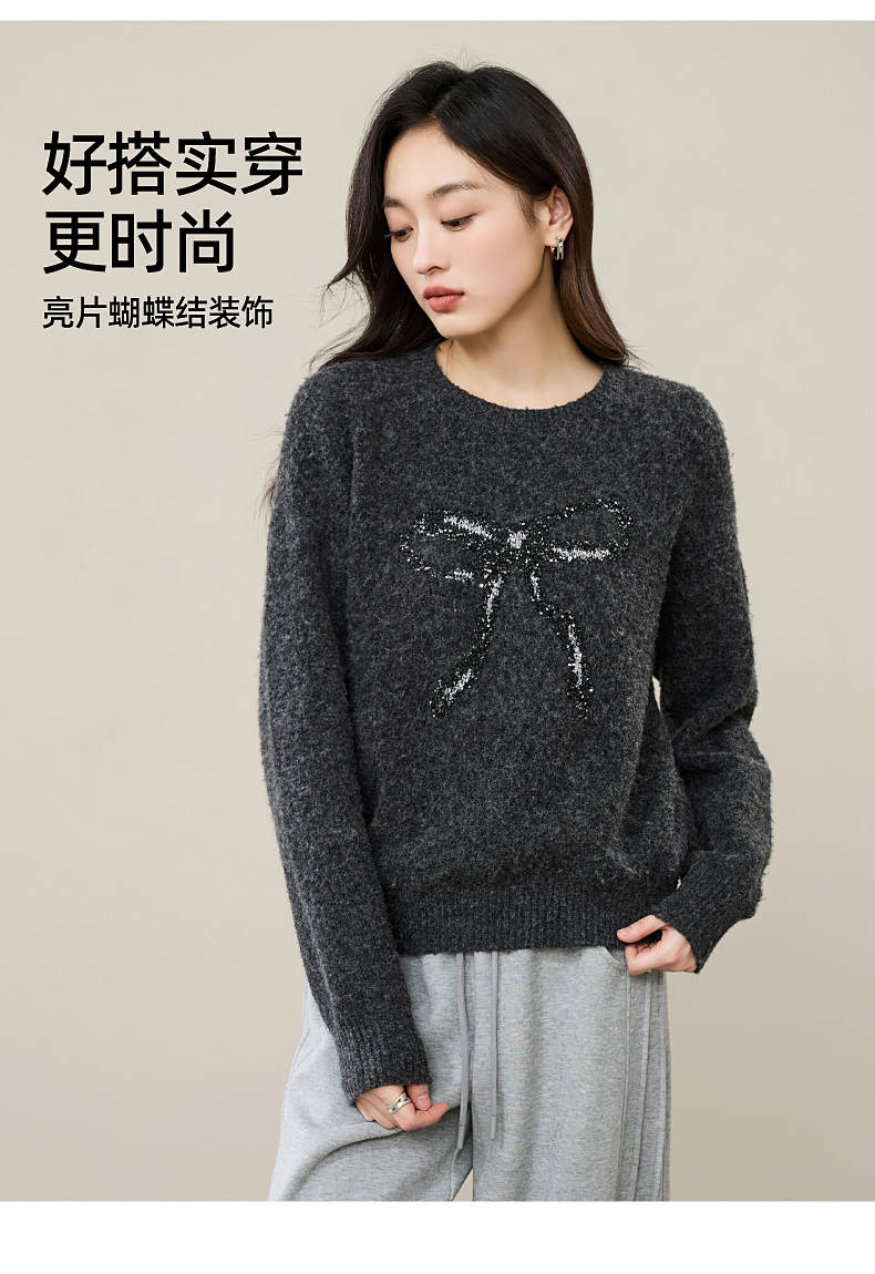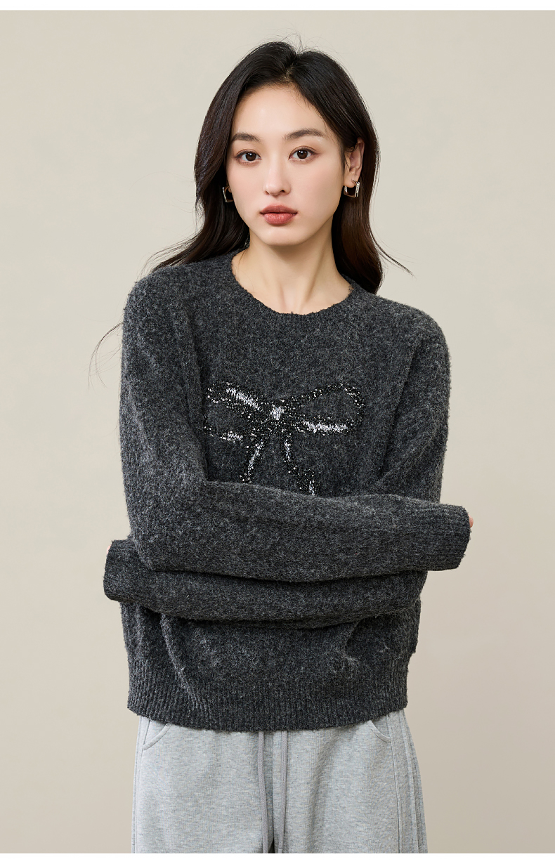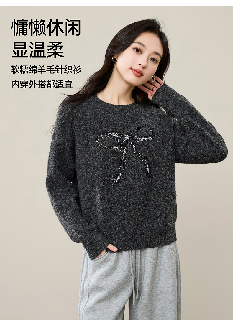 【蝴蝶结毛衣】逸阳冬新品时尚圆领宽松显瘦休闲加厚打底套头毛衣5323