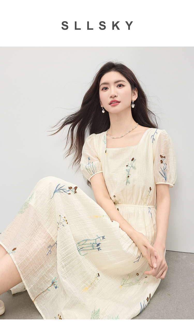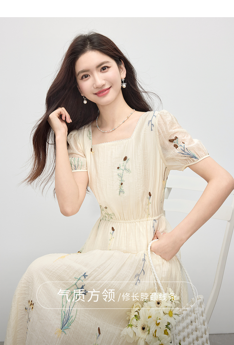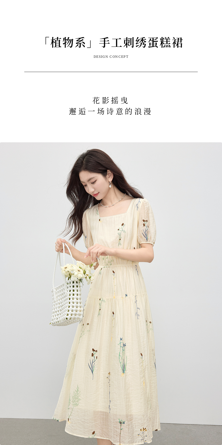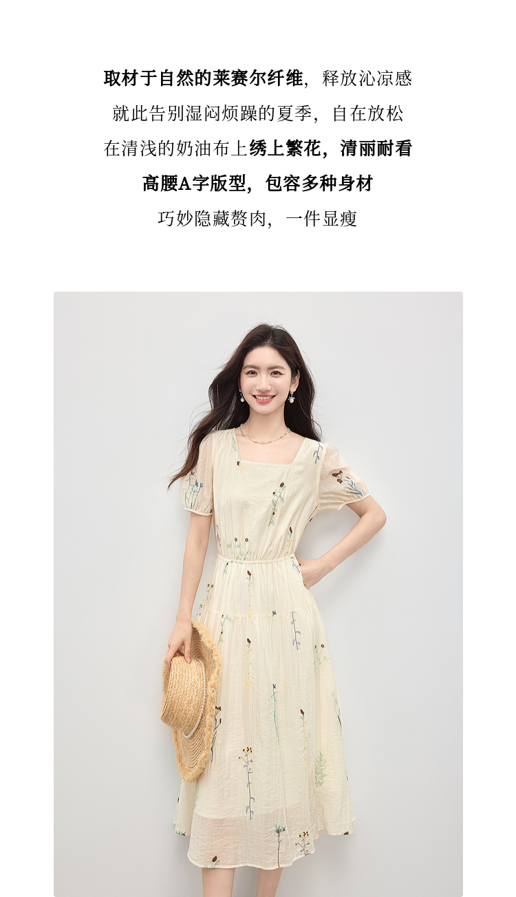 【专属特价】熙世界植物花卉刺绣天丝连衣裙女2025夏日新款法式方领莱赛尔裙子