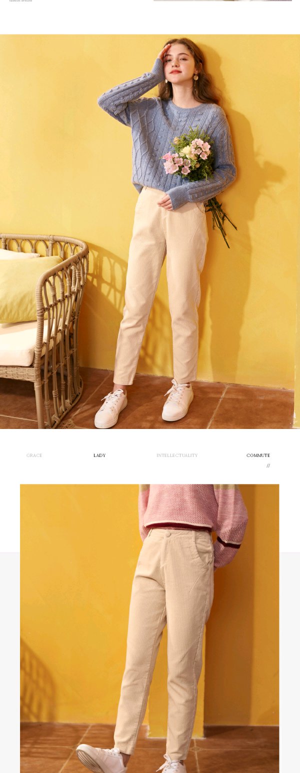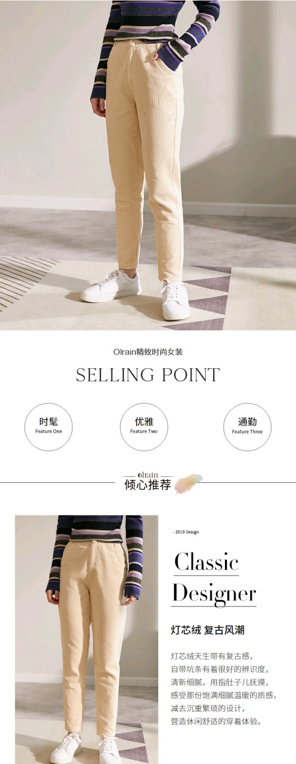 欧芮儿 新款中高腰简约纯色直筒灯芯绒长裤子休闲裤女
