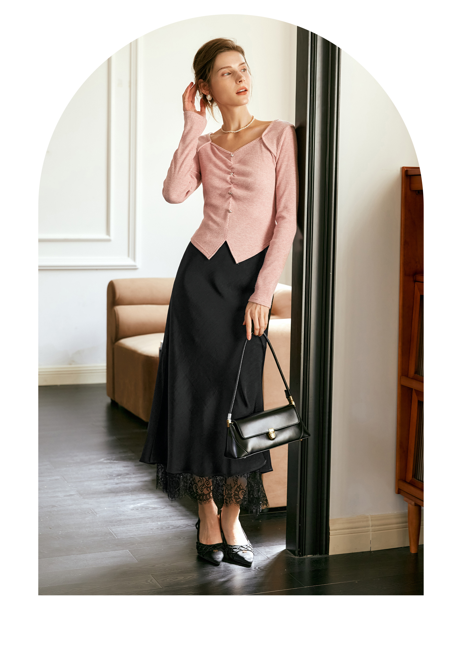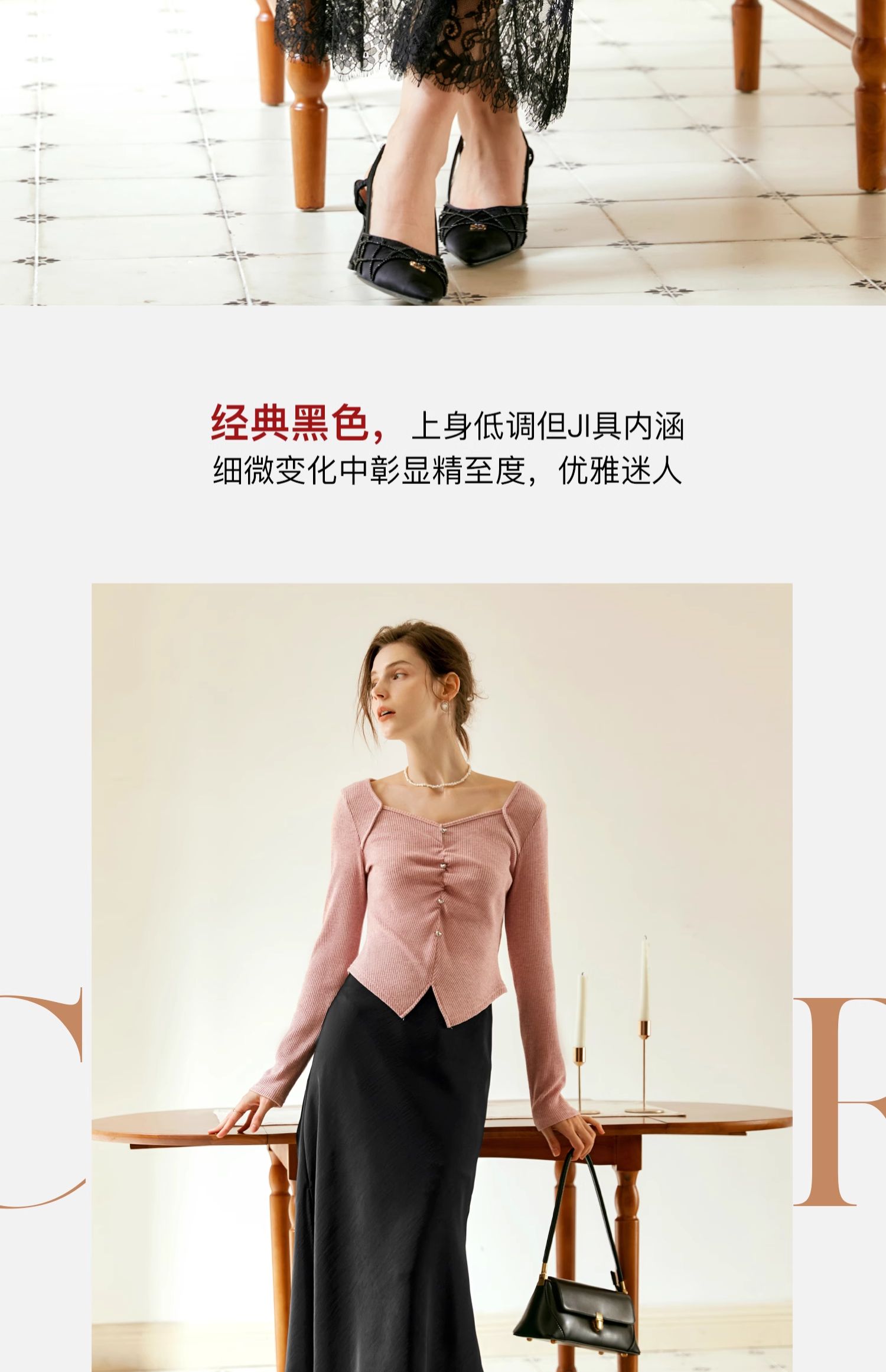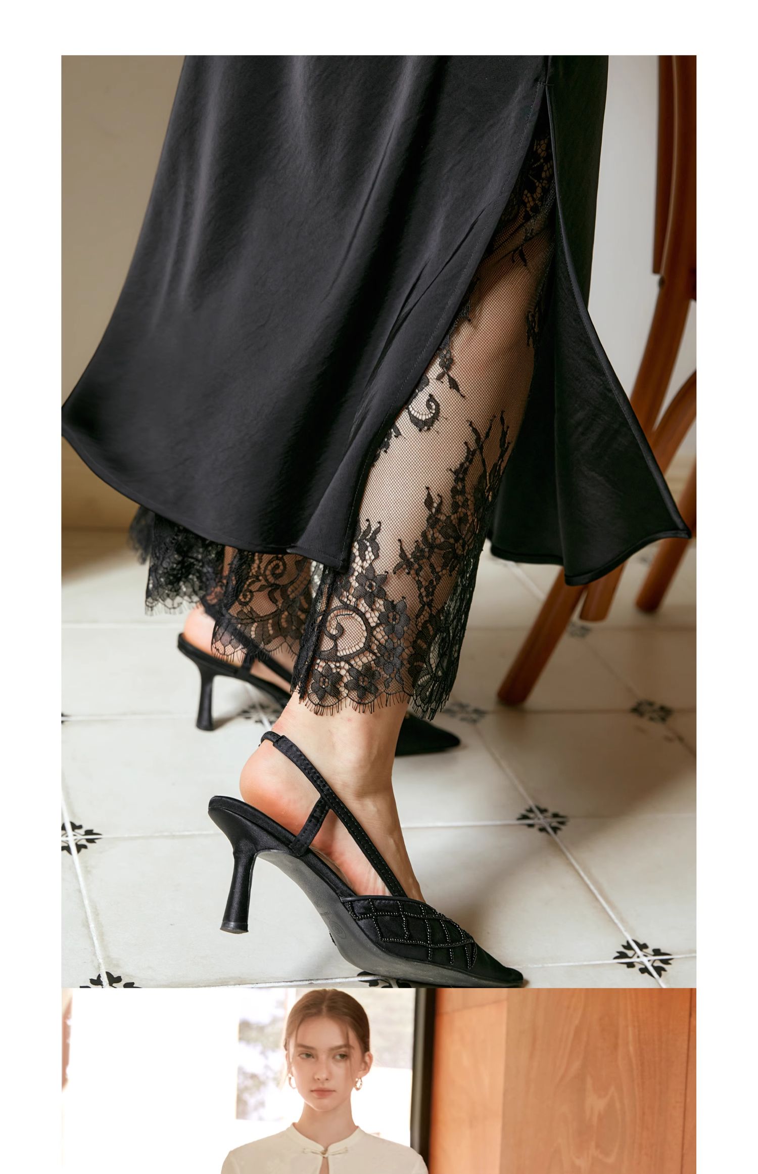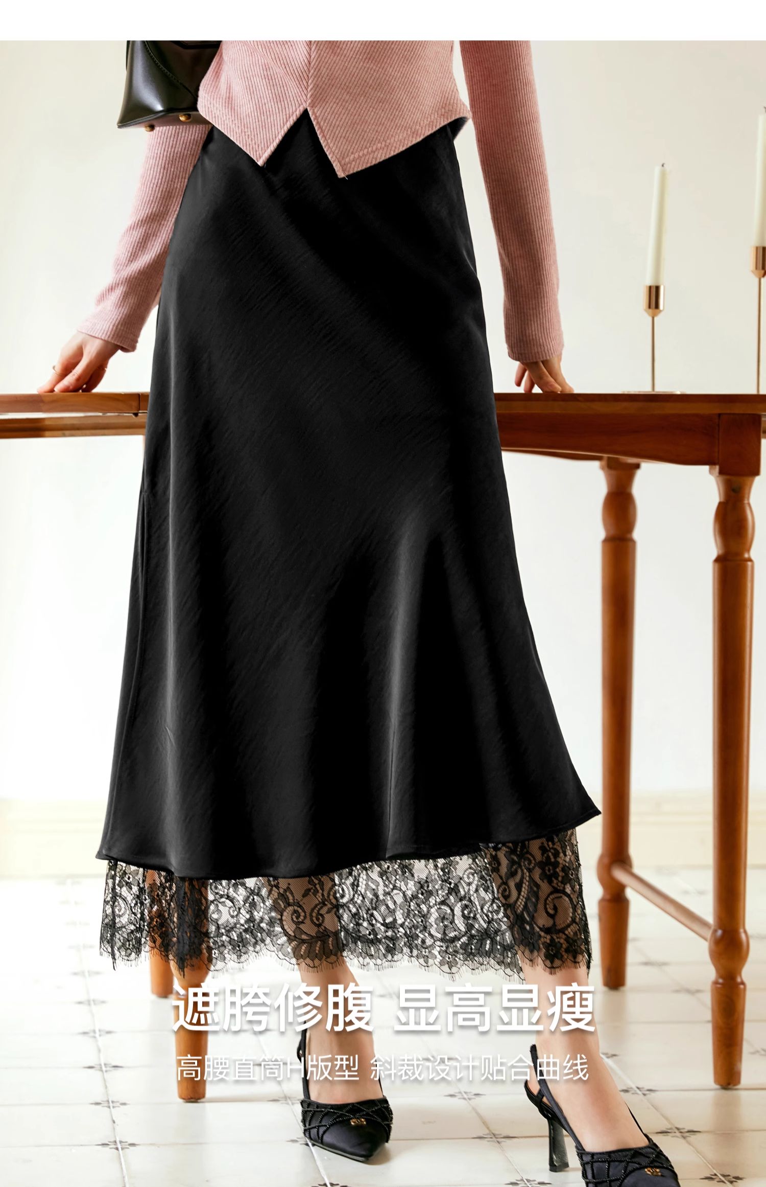 OLrain欧芮儿黑色鱼尾半身裙女早秋2024新款轻奢缎面蕾丝国风半裙