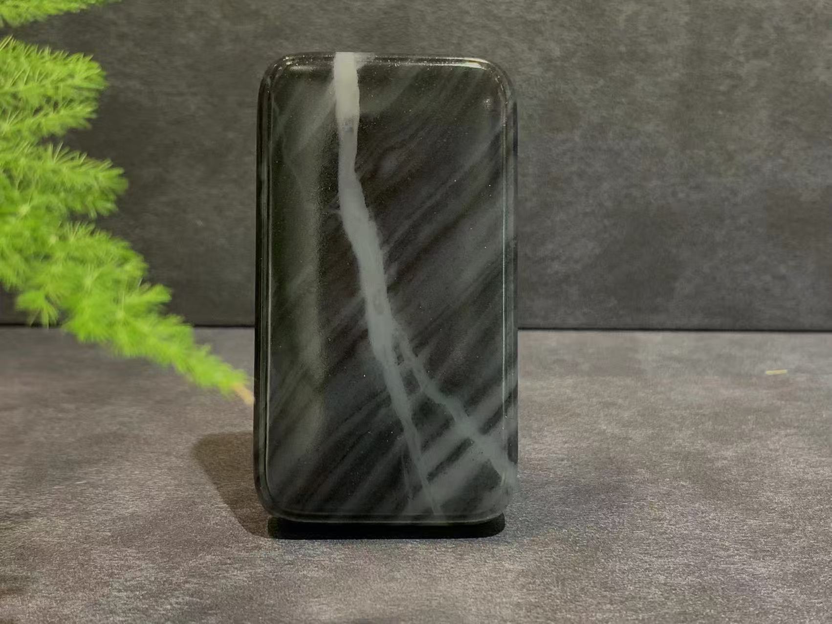 这款作品取材于优质的新疆和田青花子料原料,牌型厚实大气,颜色黑白分明,玉质温润细腻,过灯几无结构,油性一流。俗话说,好玉不琢,人世间最好的雕刻大师也比不上大自然的鬼斧神工。该款无事牌虽然没有任何雕工,但是在玉牌上,一道纯天然的羊脂白肉从上至下贯穿玉牌的黑色部分,像小溪也像闪电,意境万千,令人爱不释手。同时辅以顶级的打磨抛光工艺,完美呈现和田玉的特质,是一款可以自戴收藏的精品。