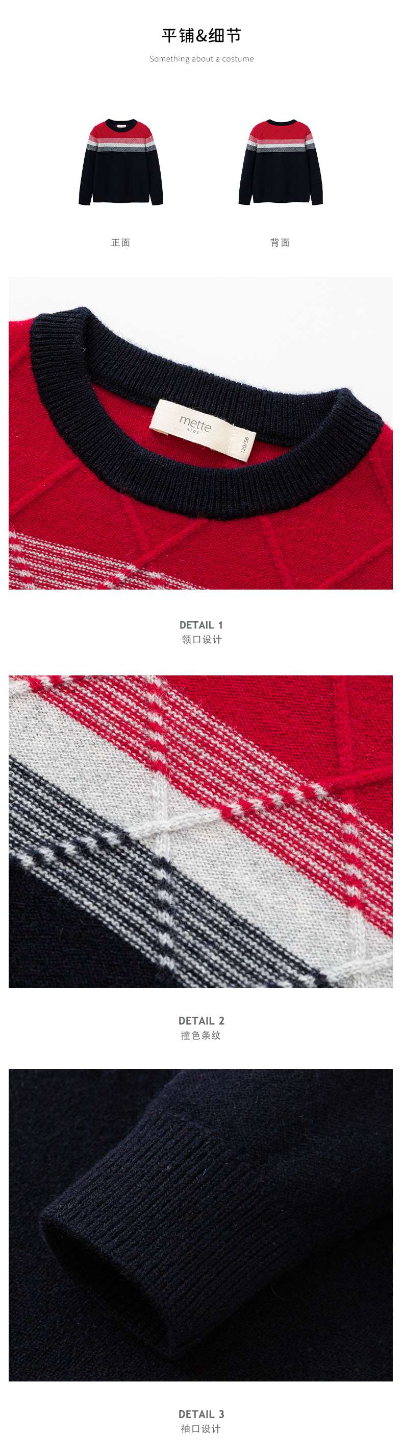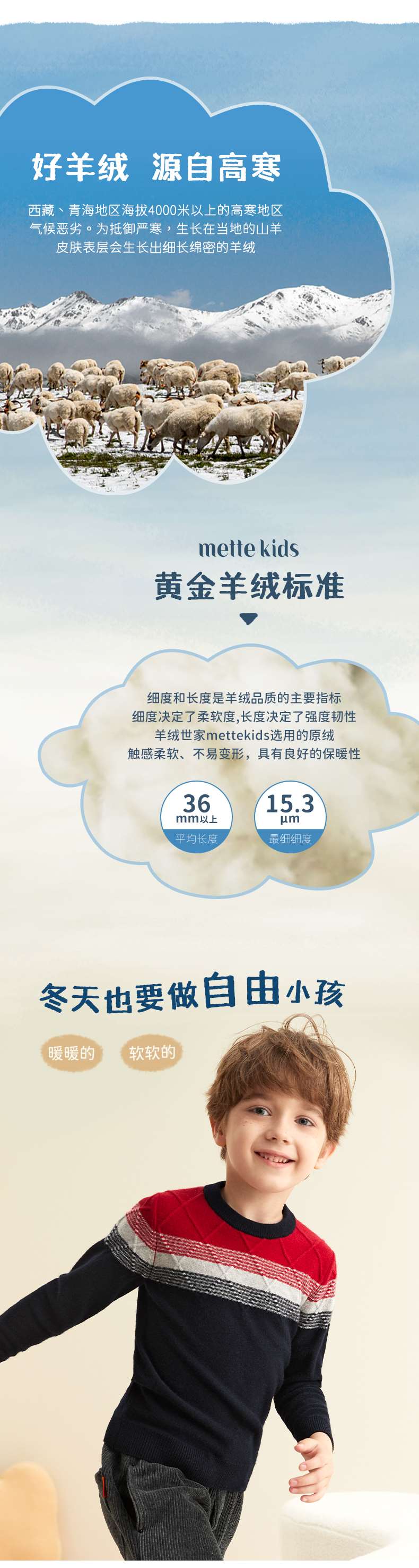 METTE羊绒世家童装100%山羊绒衫中大童中性高领混色绞花内搭毛衣