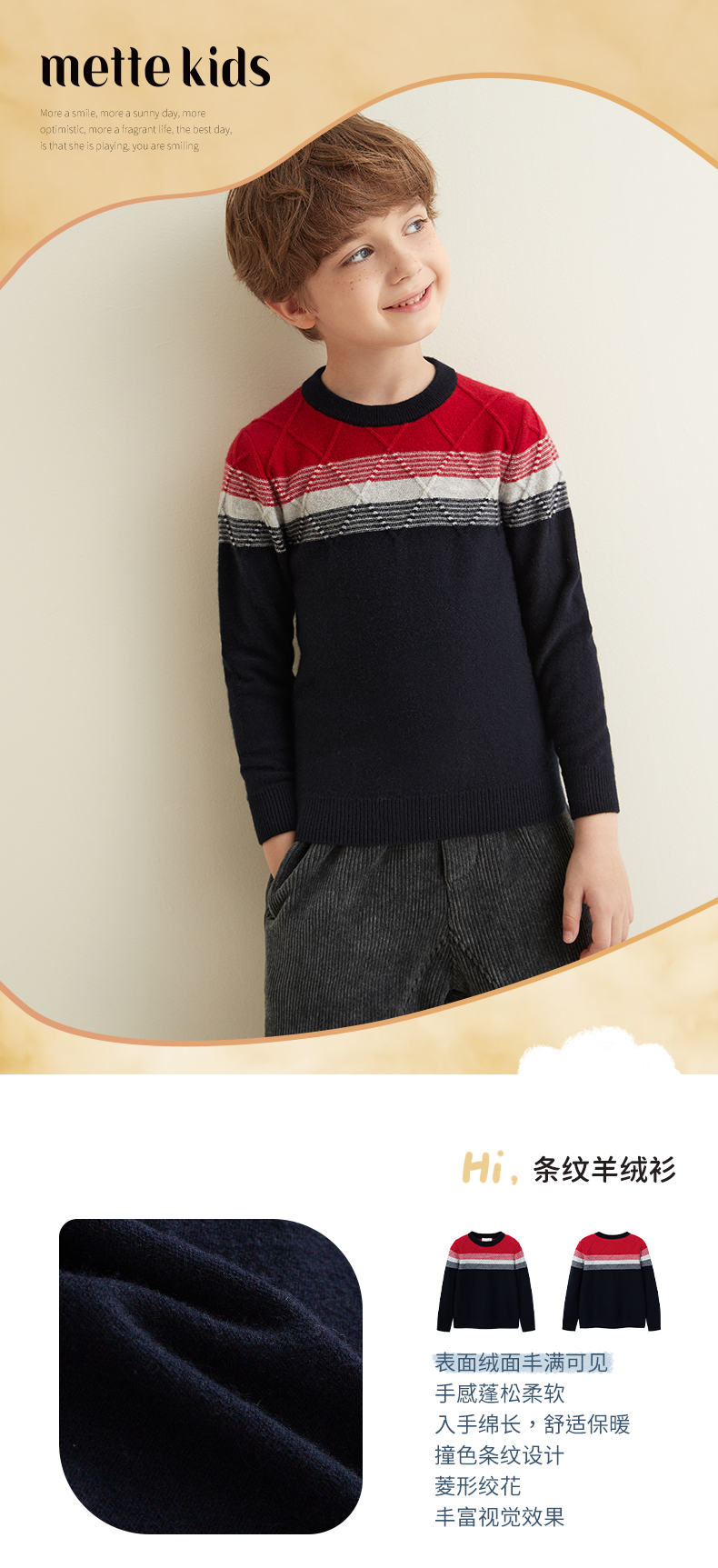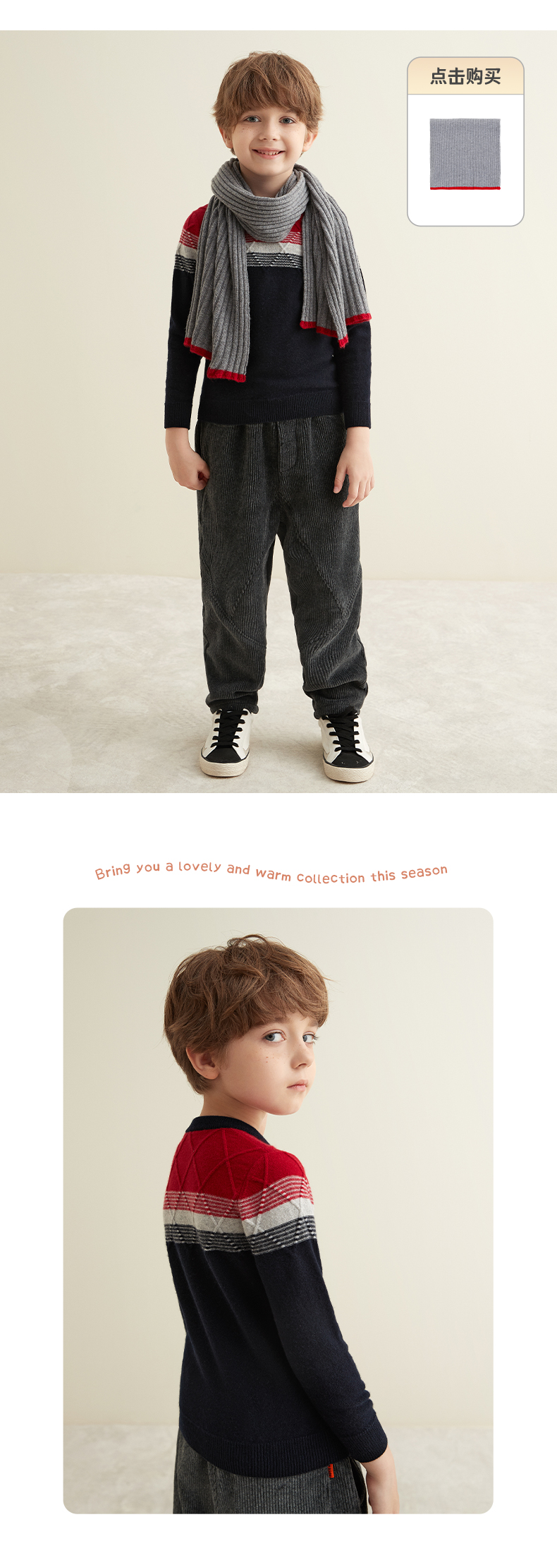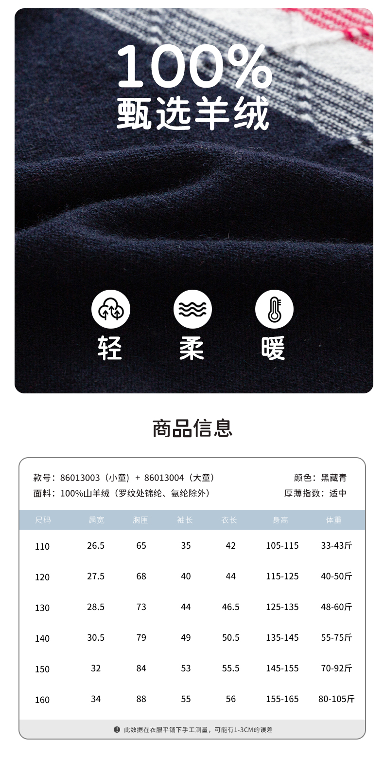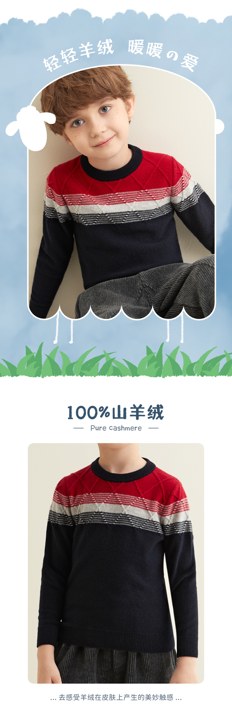 【男童夹花条纹撞色羊绒衫】羊绒世家秋冬童装男宝100%山羊绒内搭保暖毛衣