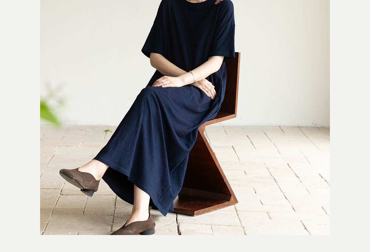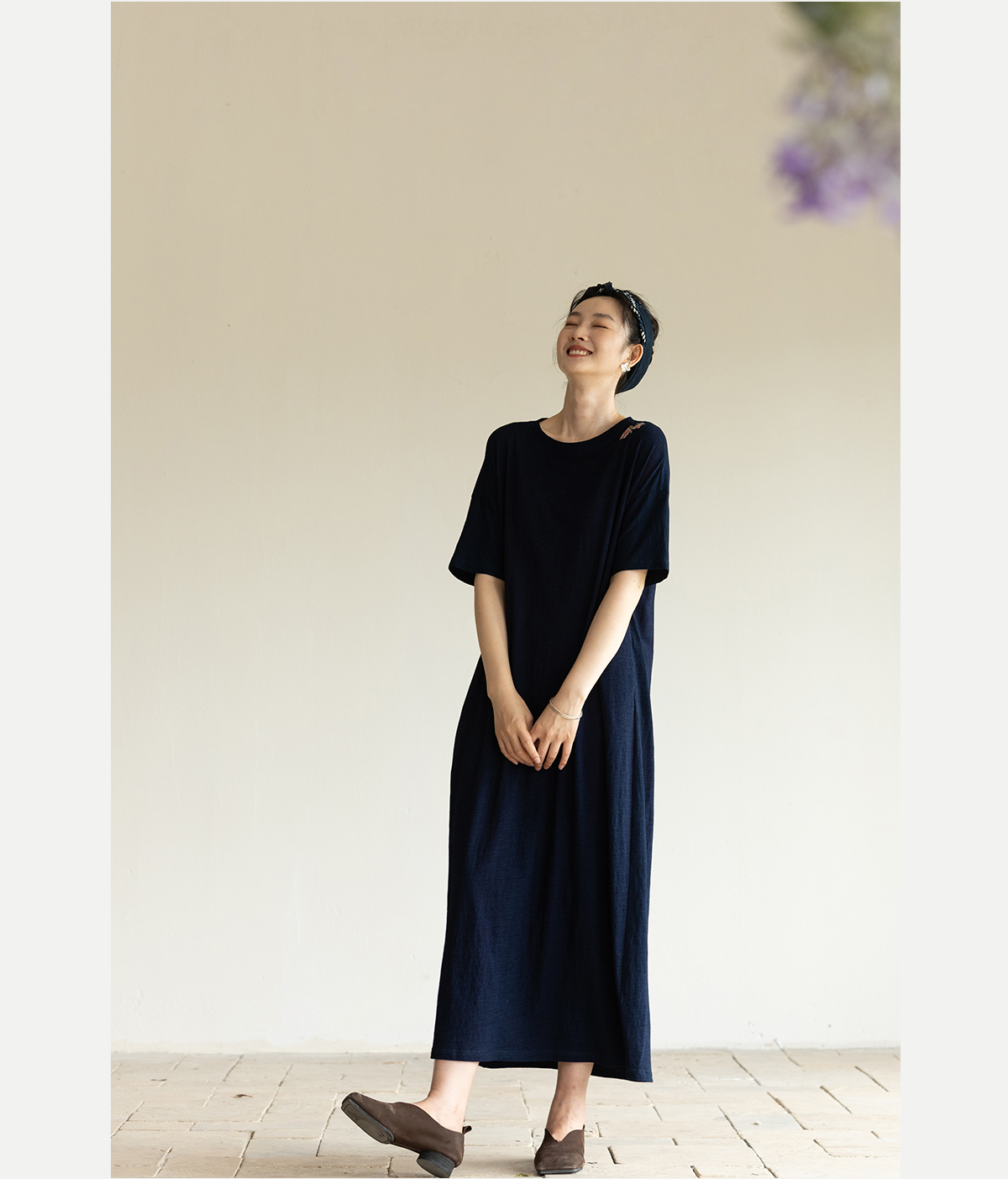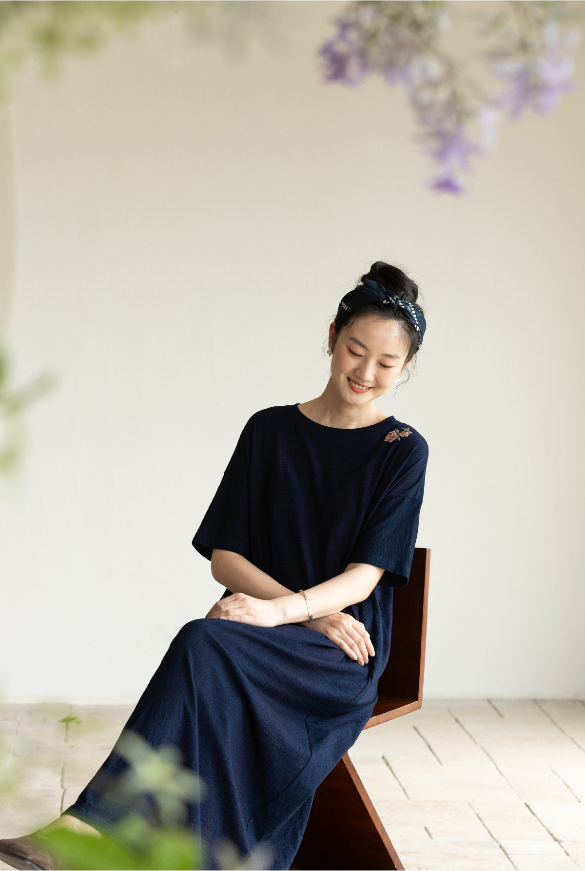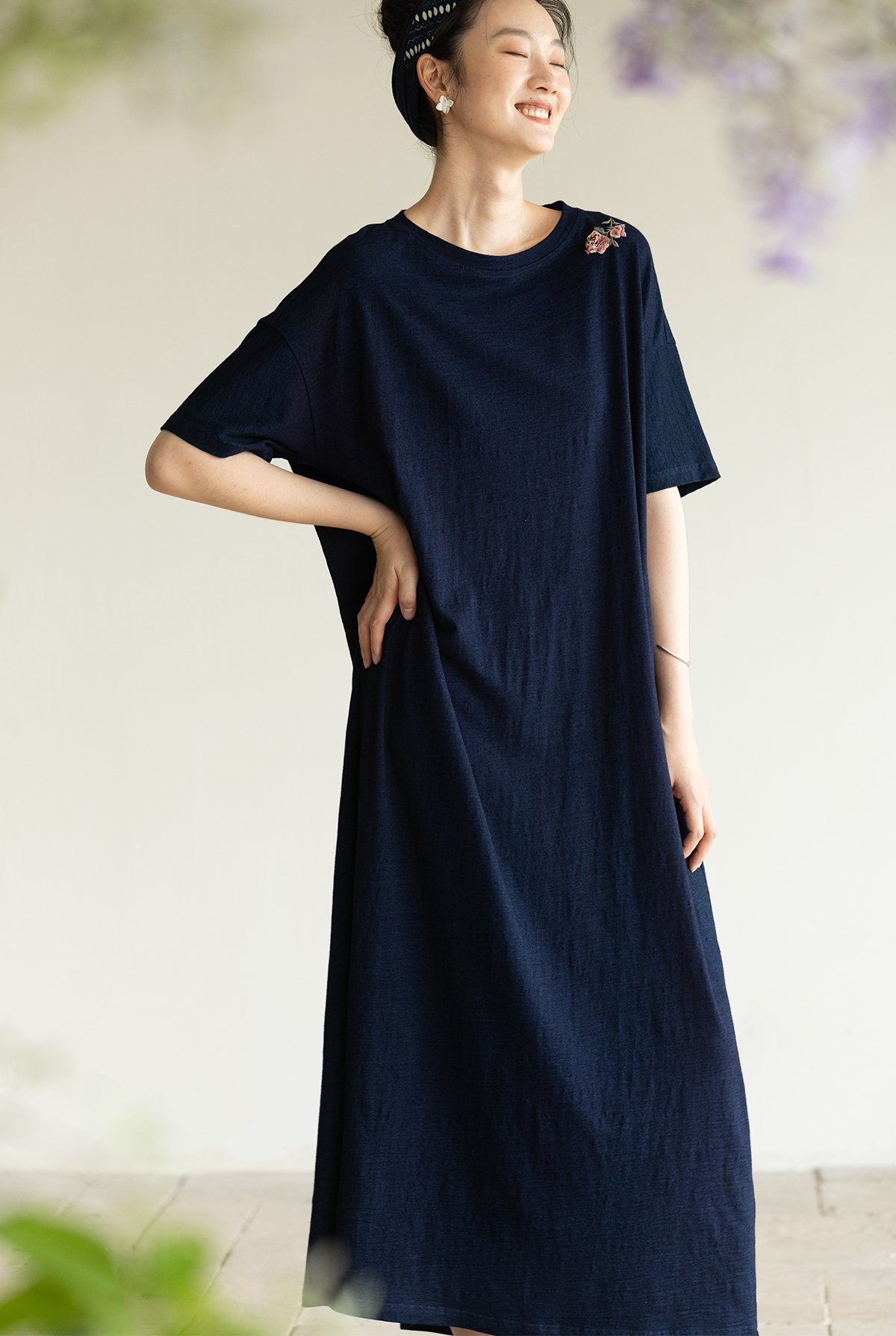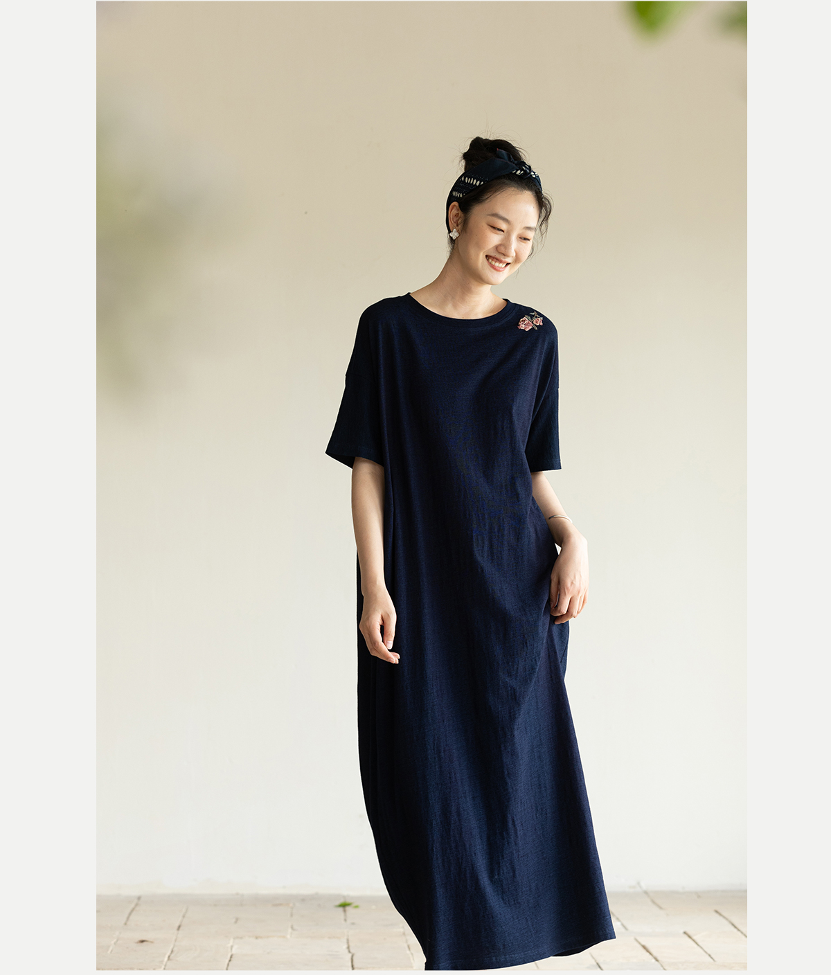 牧衣游原创 手工刺绣酵洗32支纯棉连衣裙靛蓝色随性宽松长裙 朝暮