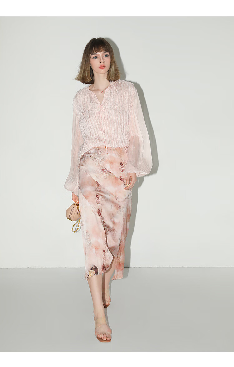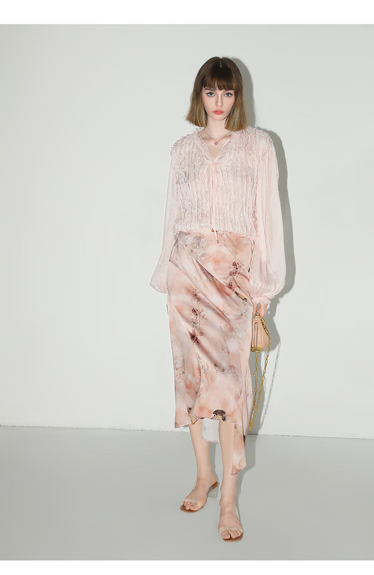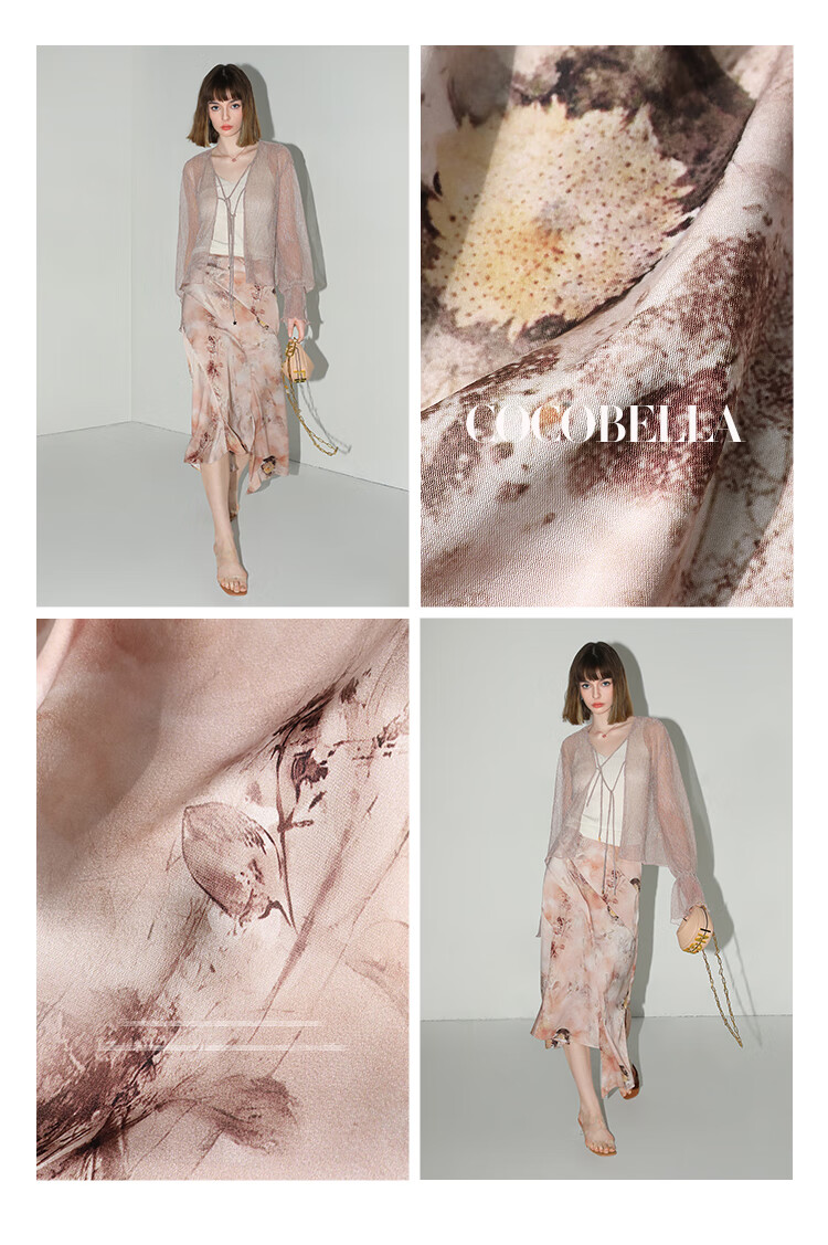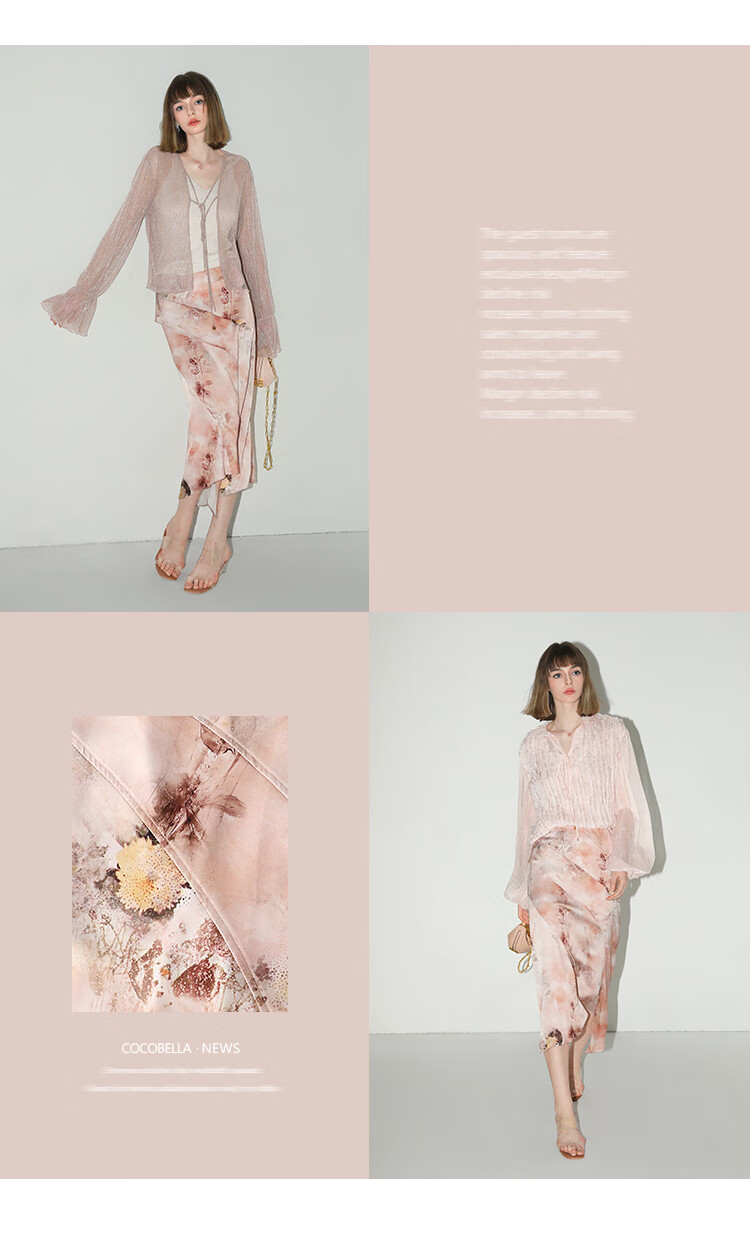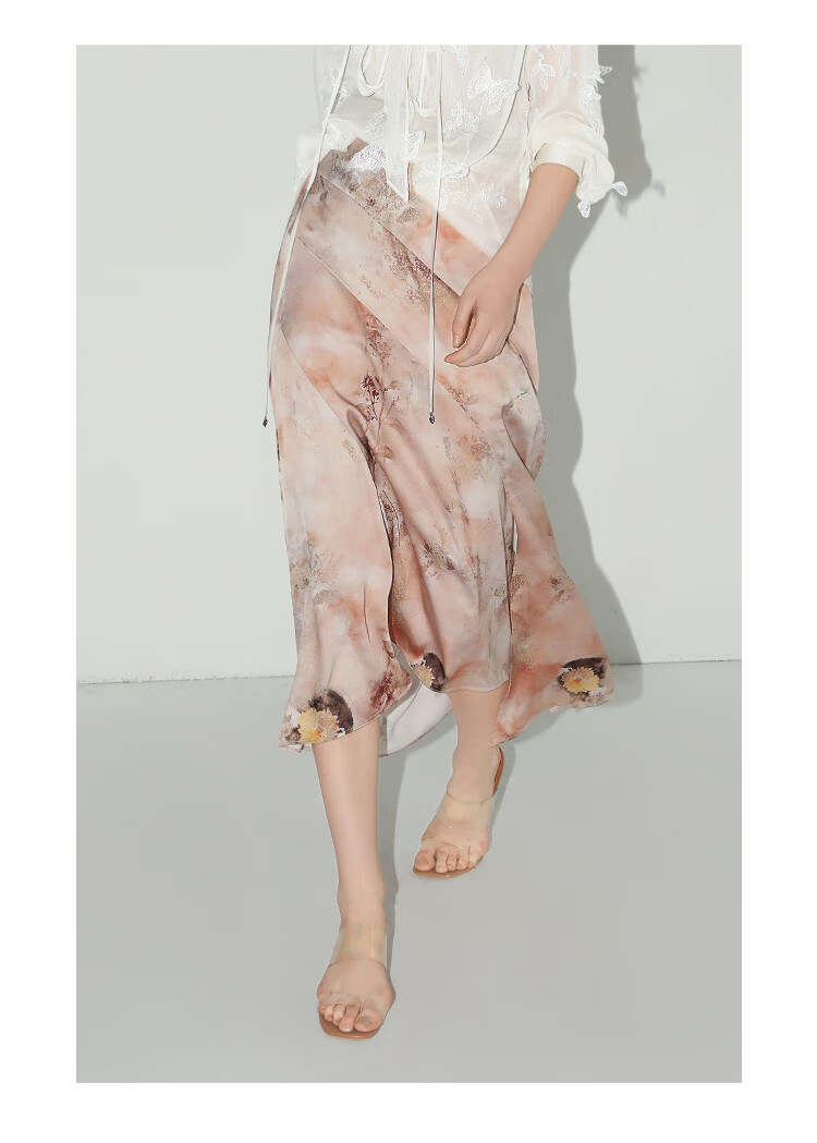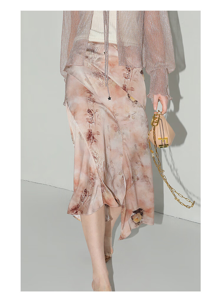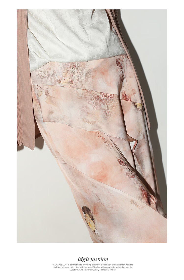 【有赞】COCOBELLA设计感拼接晕染印花缎面半身裙不规则下摆长裙HS7003