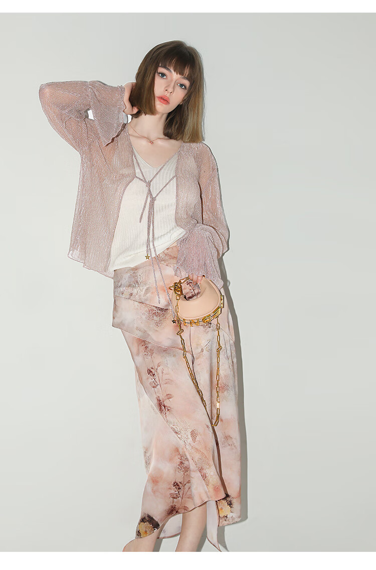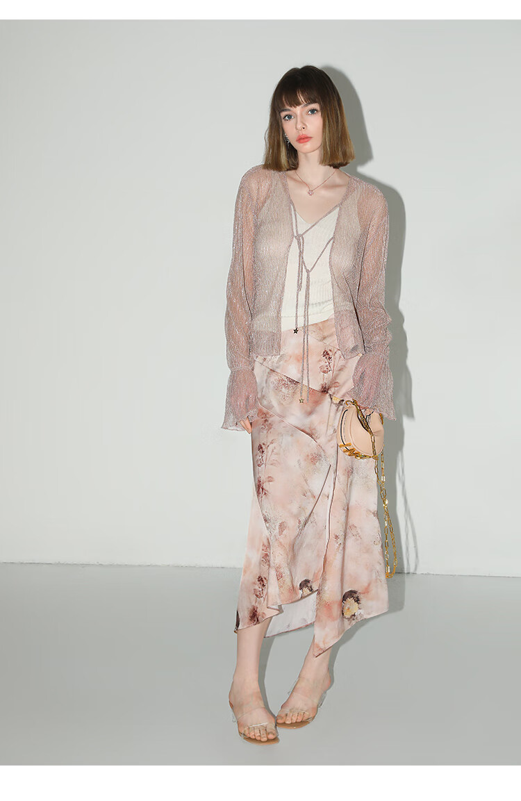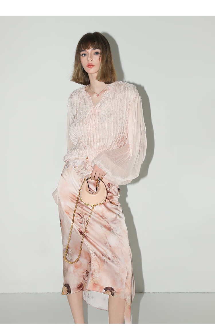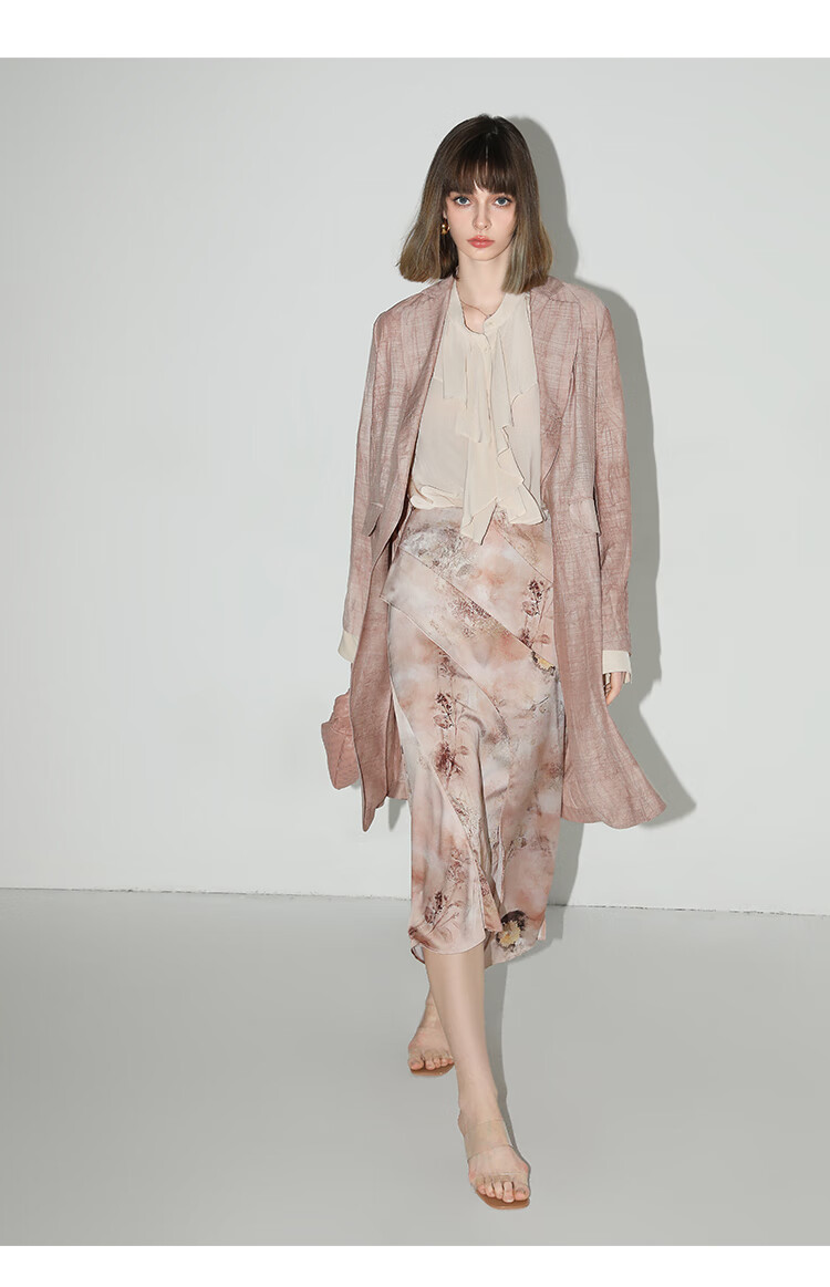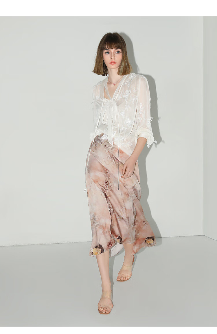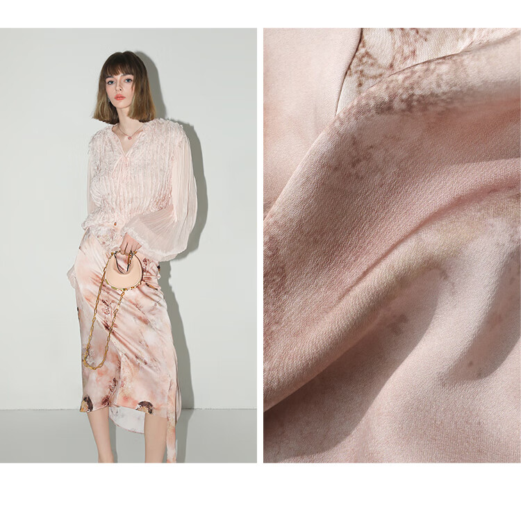 【有赞】COCOBELLA设计感拼接晕染印花缎面半身裙不规则下摆长裙HS7003