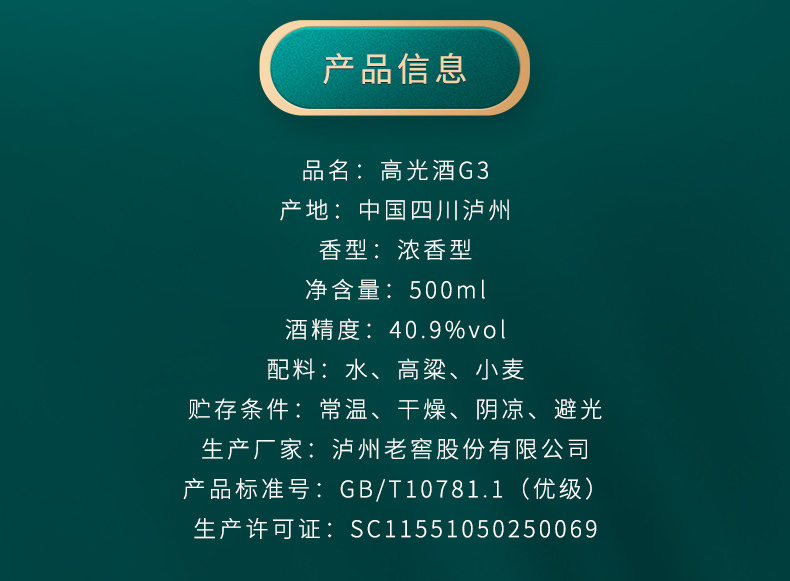 【酒厂直营】泸州老窖 高光G3 40.9度浓香型白酒整箱 轻奢高端光瓶酒 泸州老窖官方旗舰店