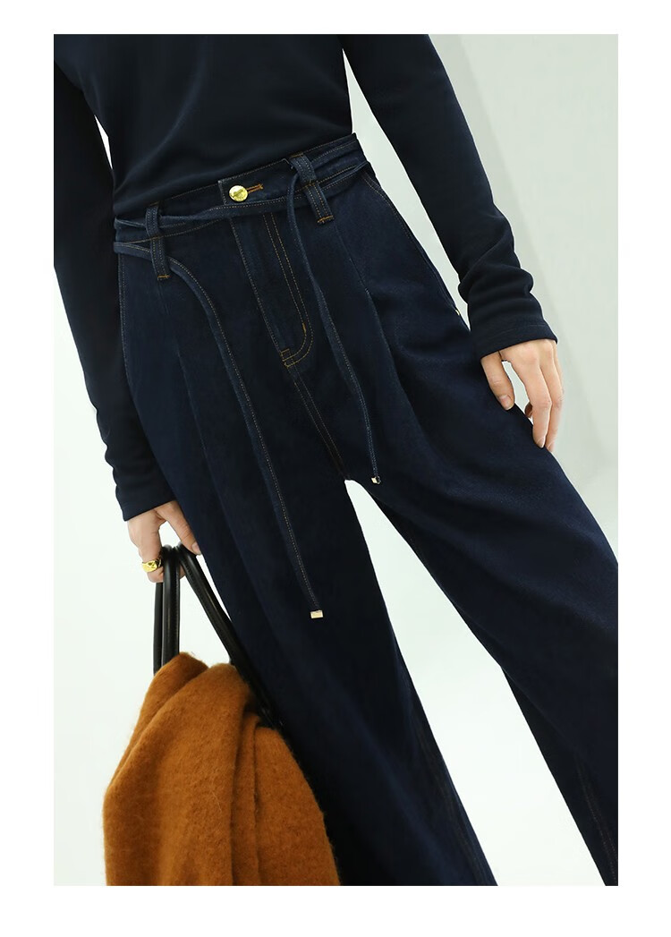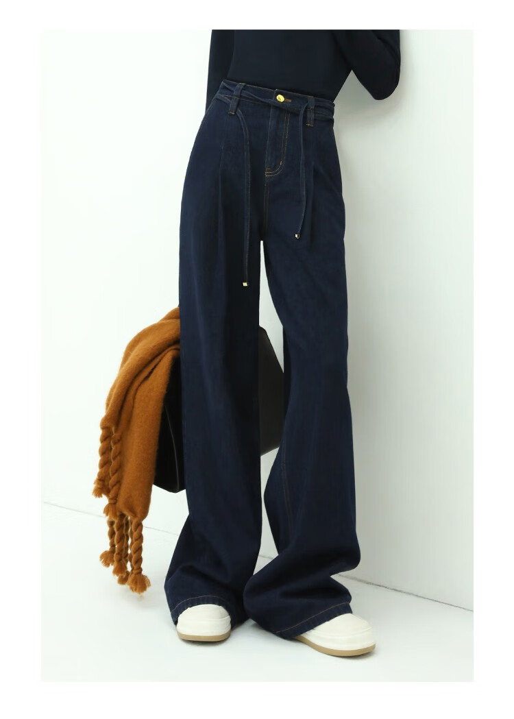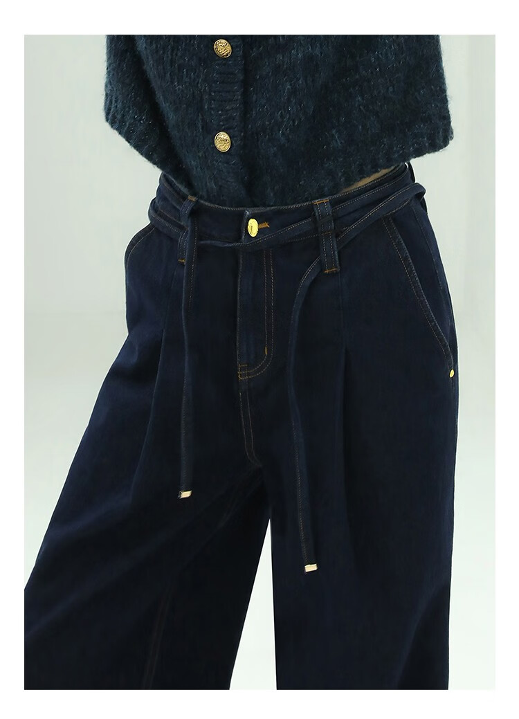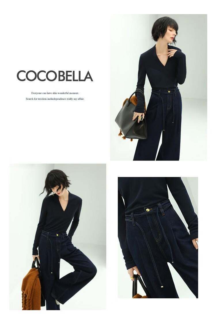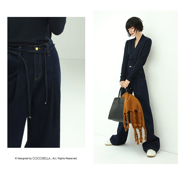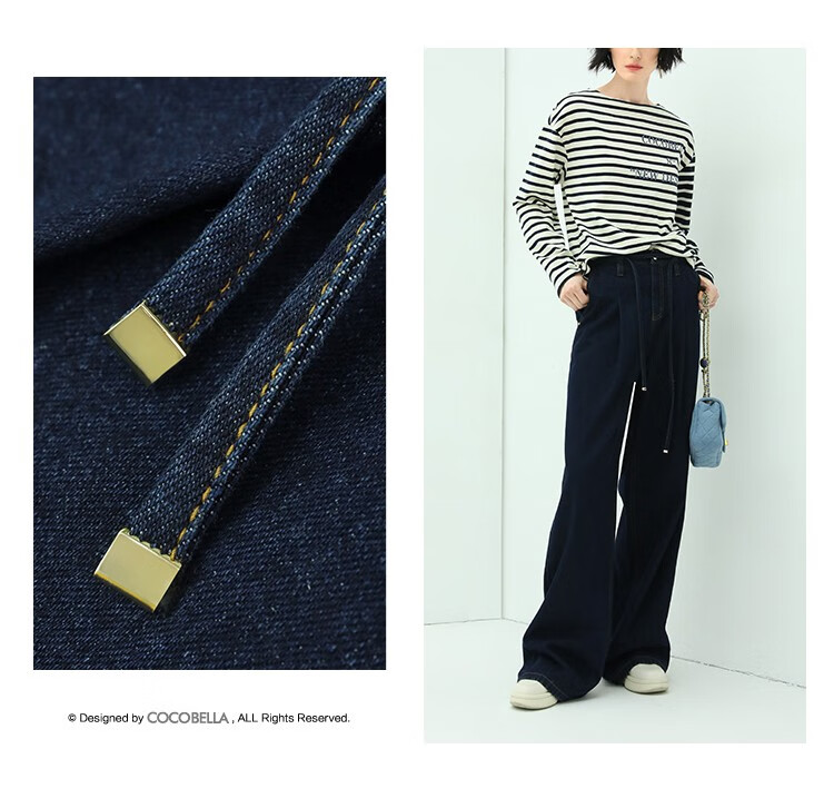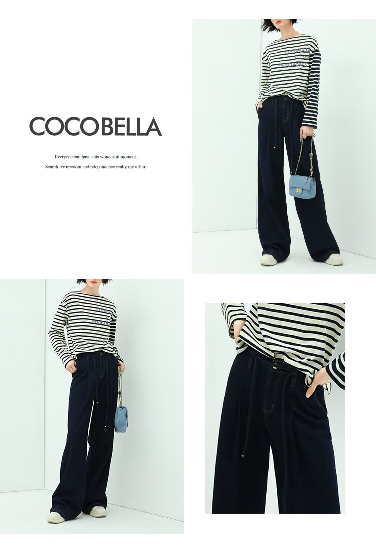 COCOBELLA设计感腰带直筒牛仔裤宽松休闲高腰打褶阔腿裤DN626
