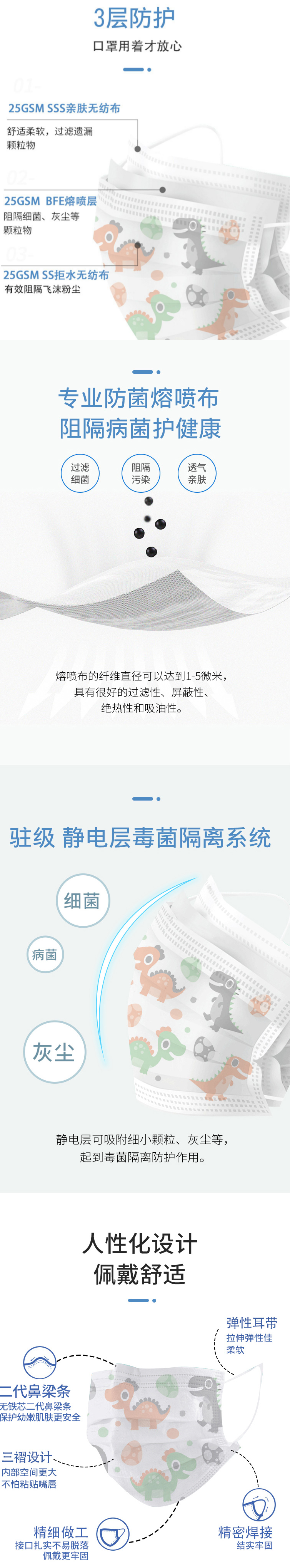 儿童口罩三层防尘透气薄款熔喷深蓝色款及恐龙款50个