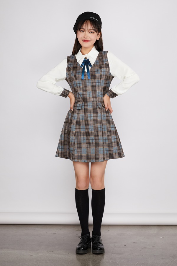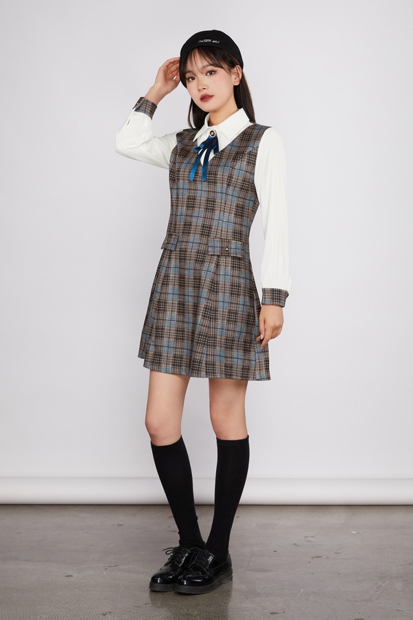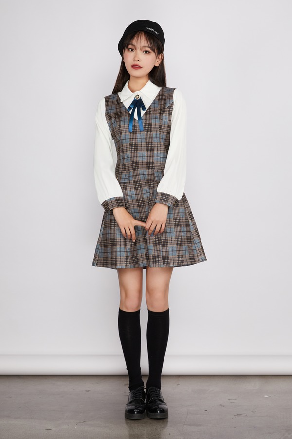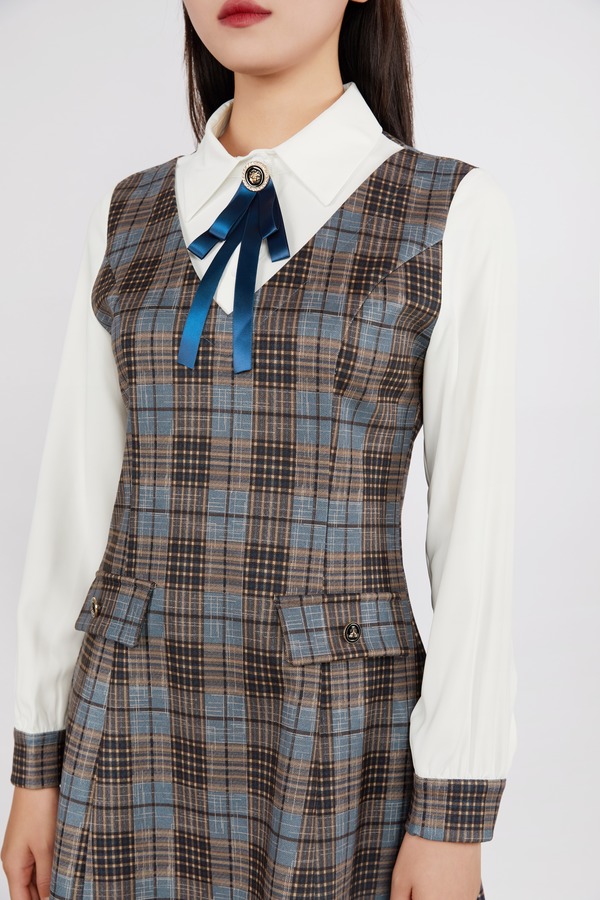 Le Malene 格纹拼接假两件式连衣裙(无胸针) 11534