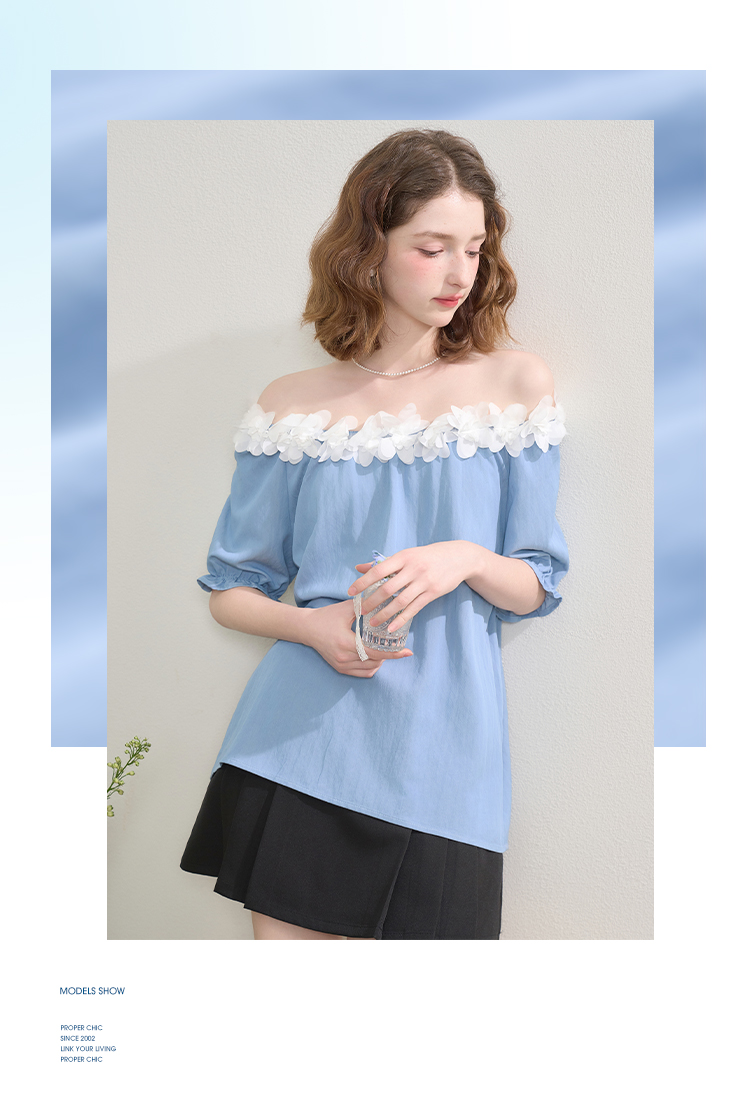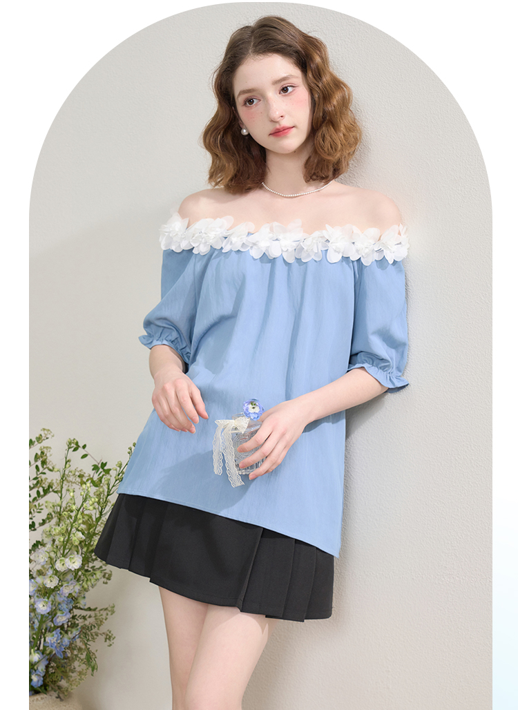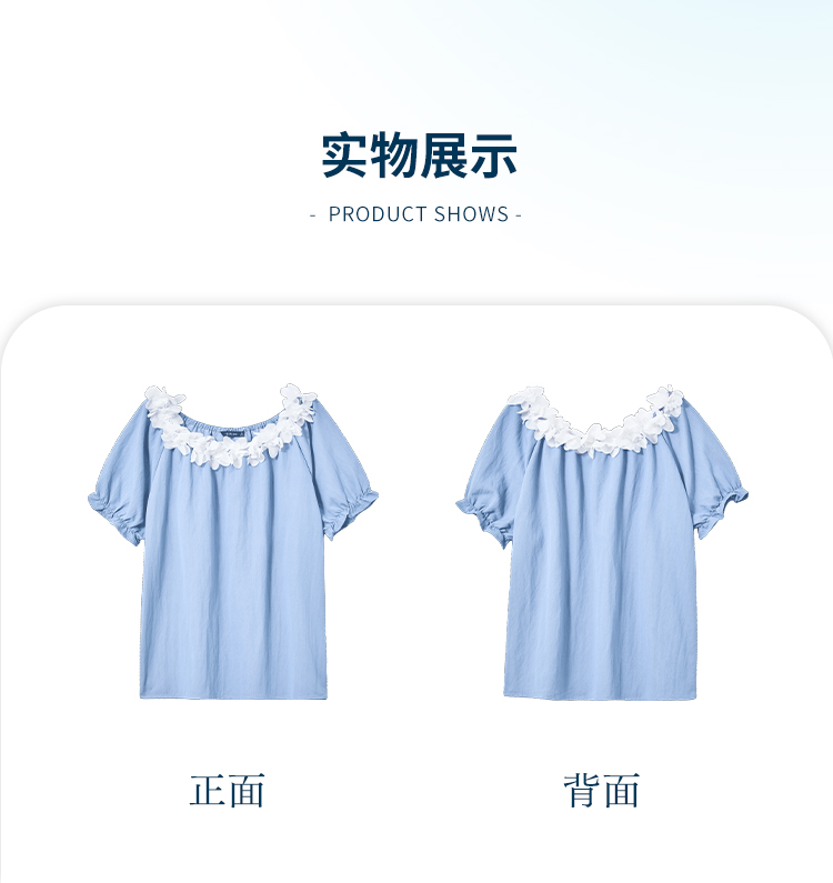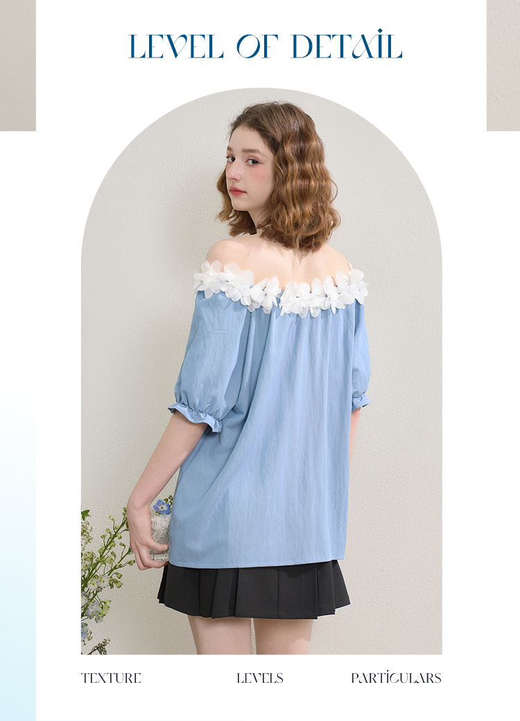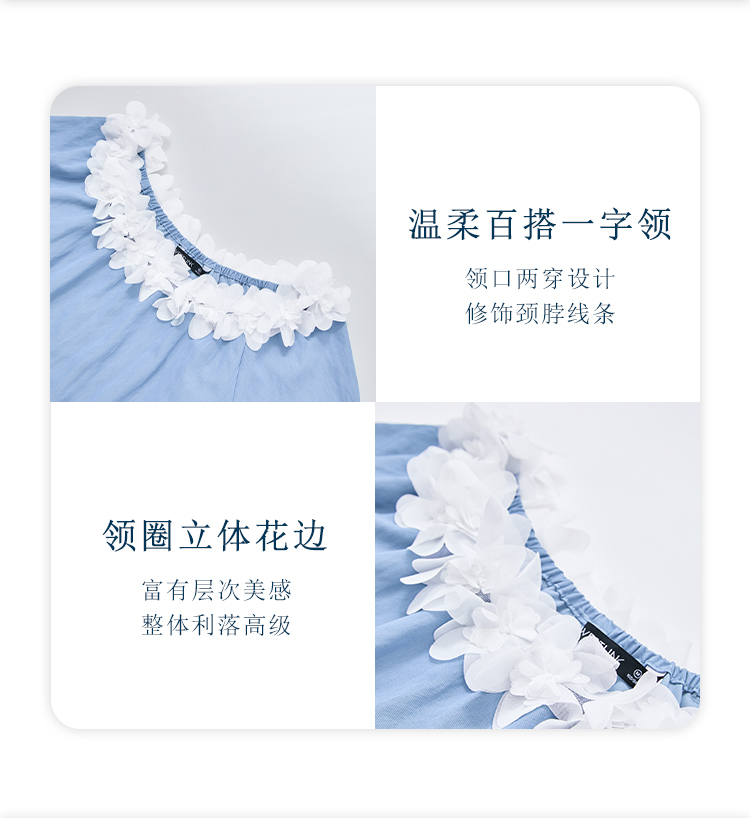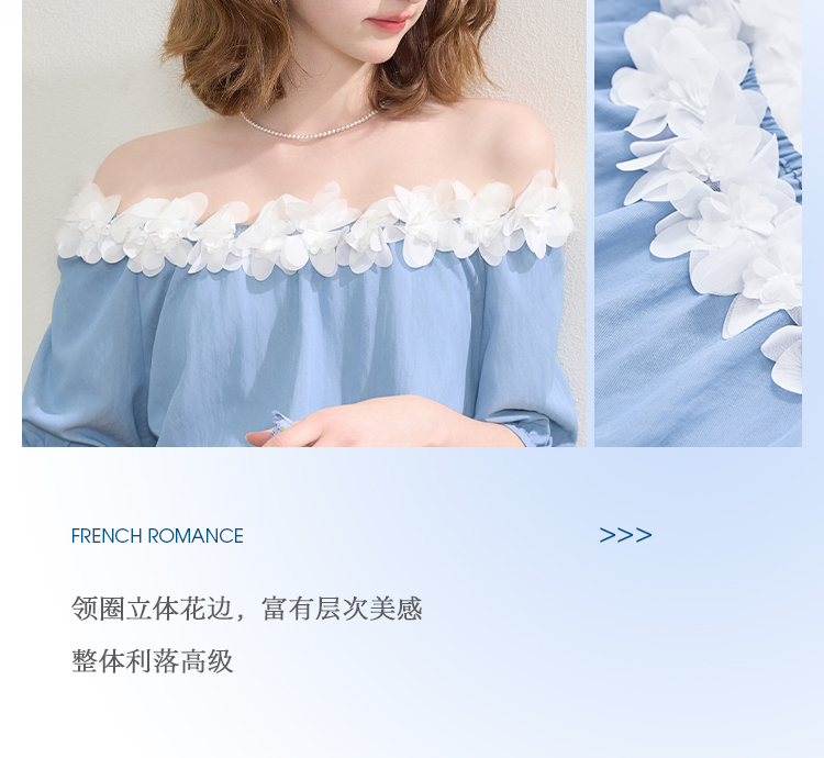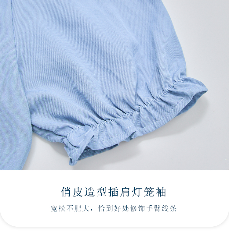 法式浪漫田园花瓣领插肩袖软牛仔衬衫女夏季宽松衬衣V1350837