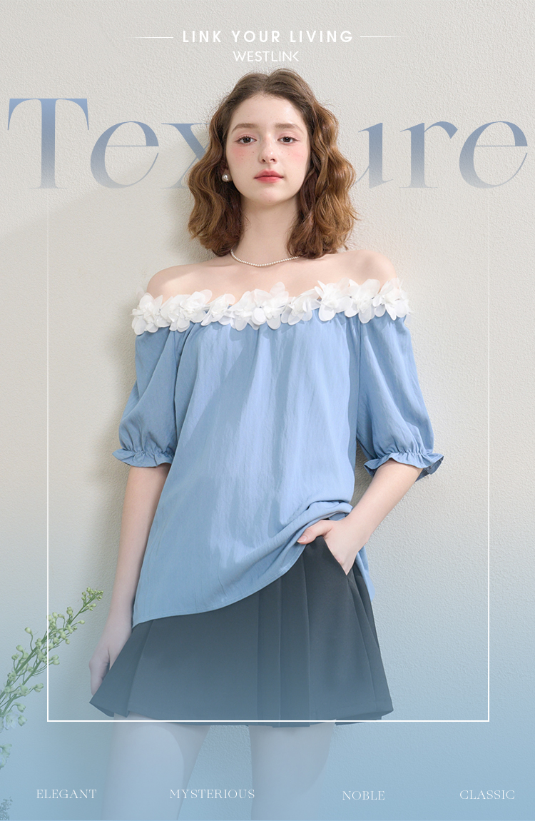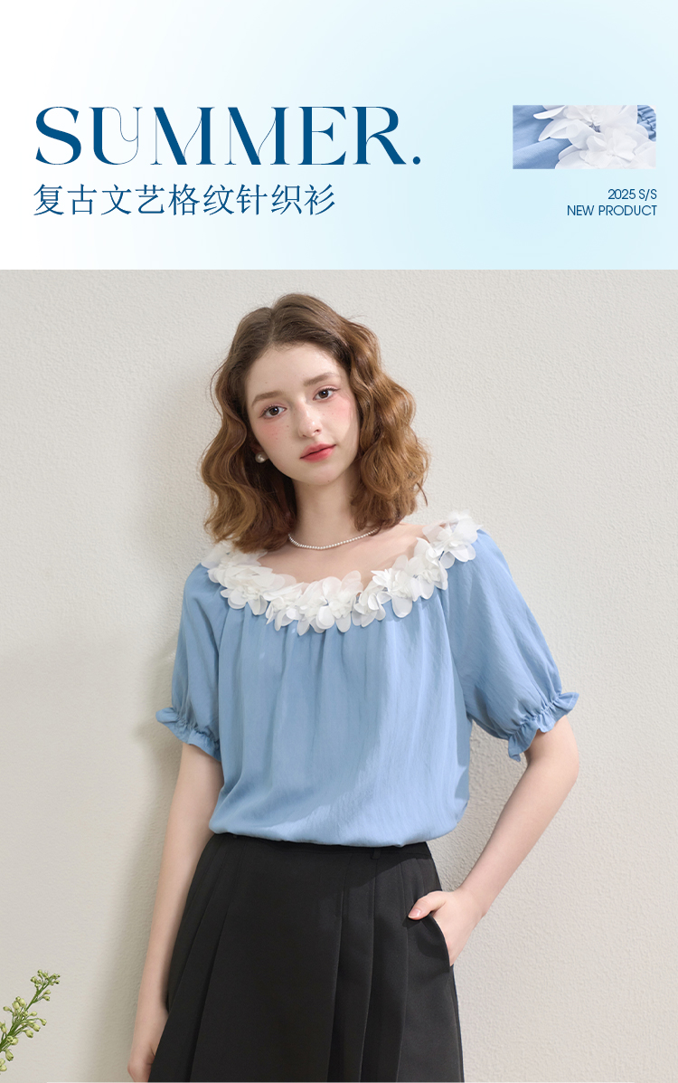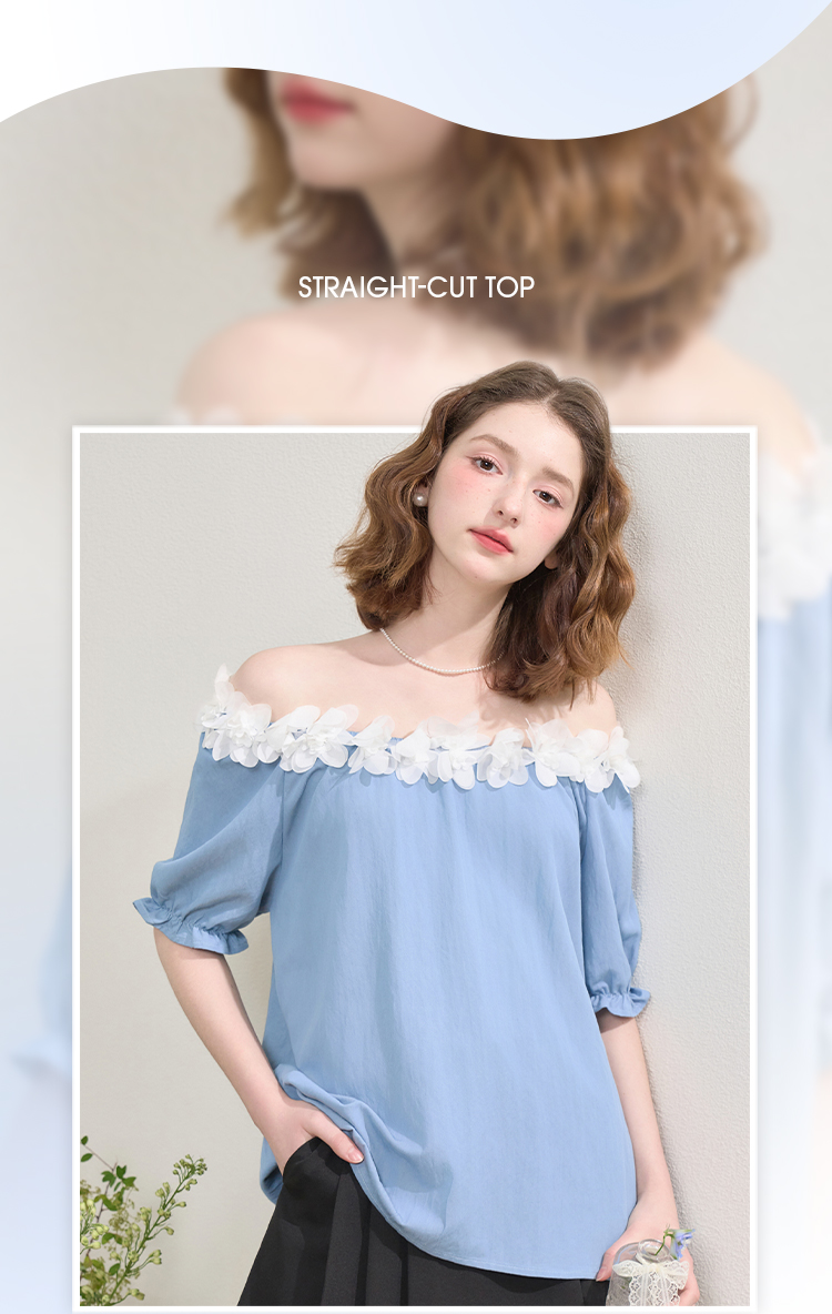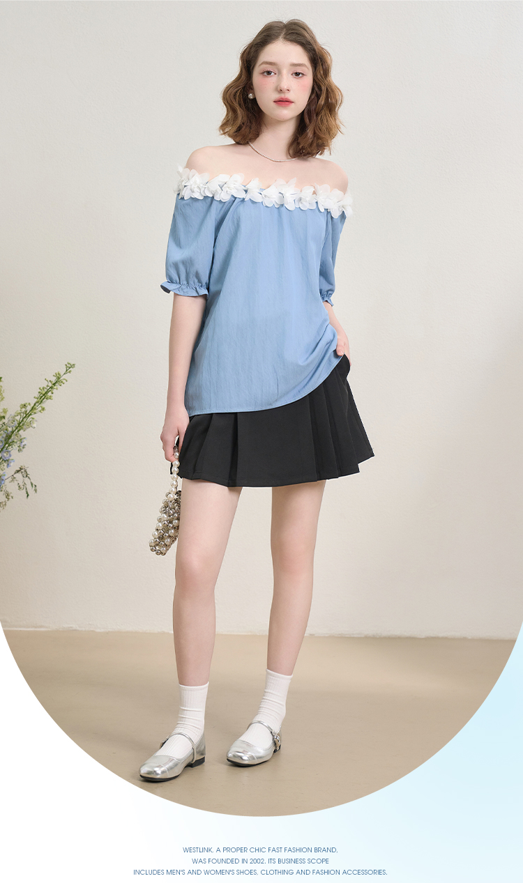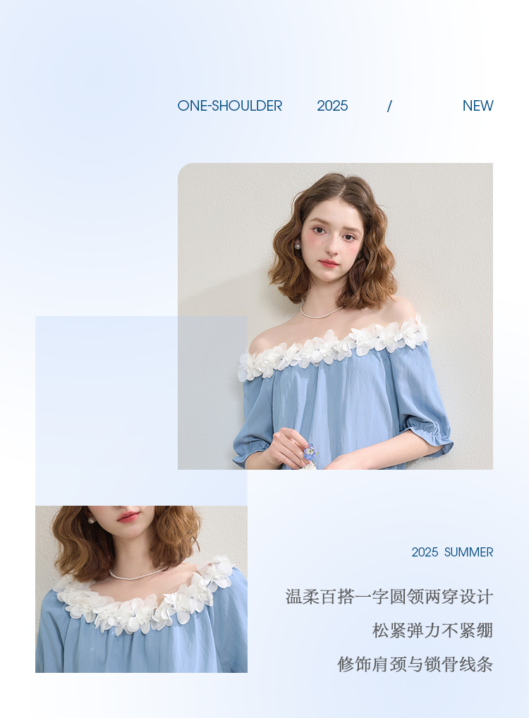 法式浪漫田园花瓣领插肩袖软牛仔衬衫女夏季宽松衬衣V1350837