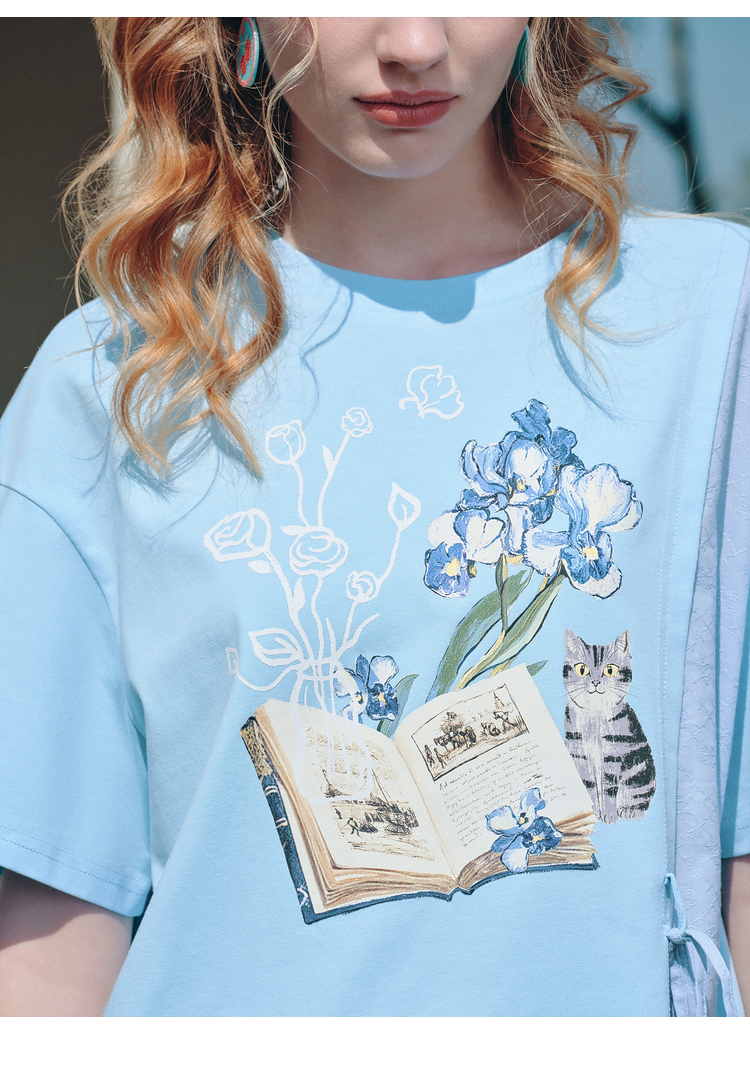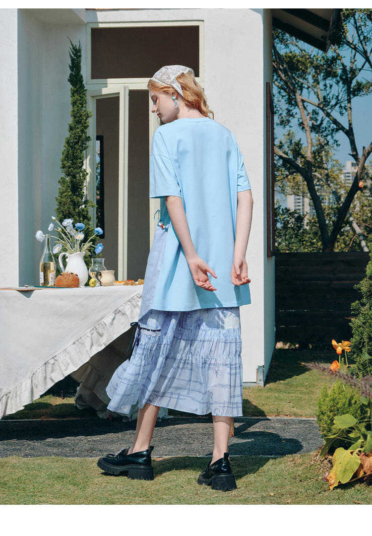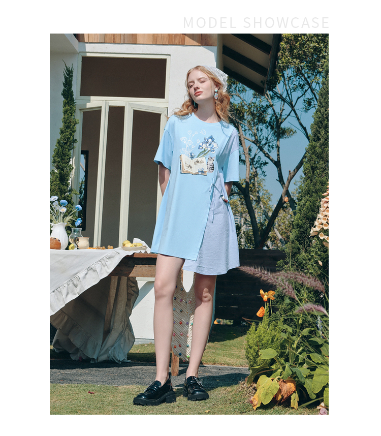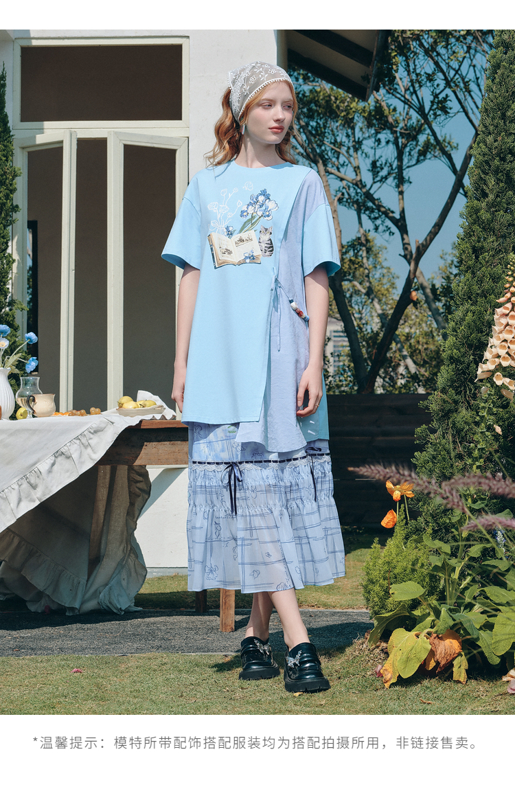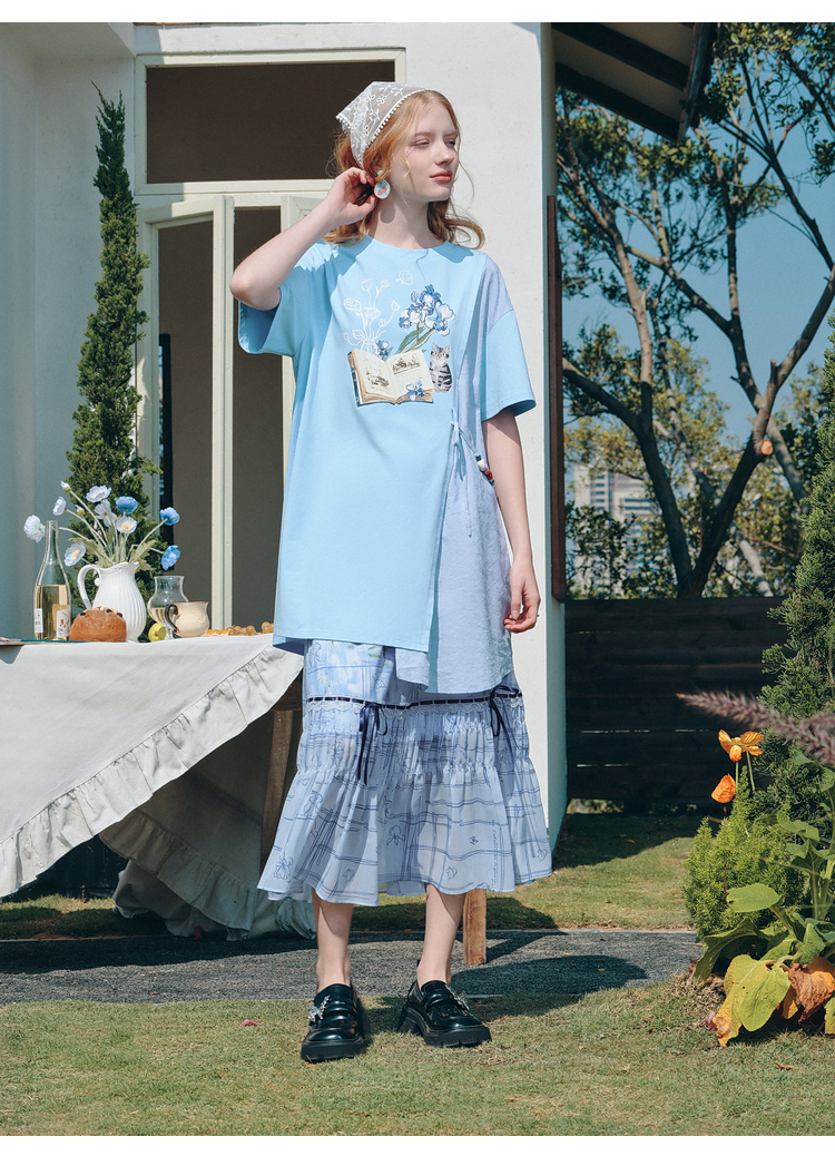 两三事梵高文艺星垂素野2026夏季新款印花拼布不对称t恤裙连衣裙