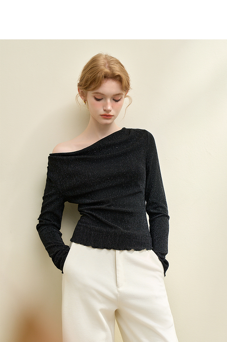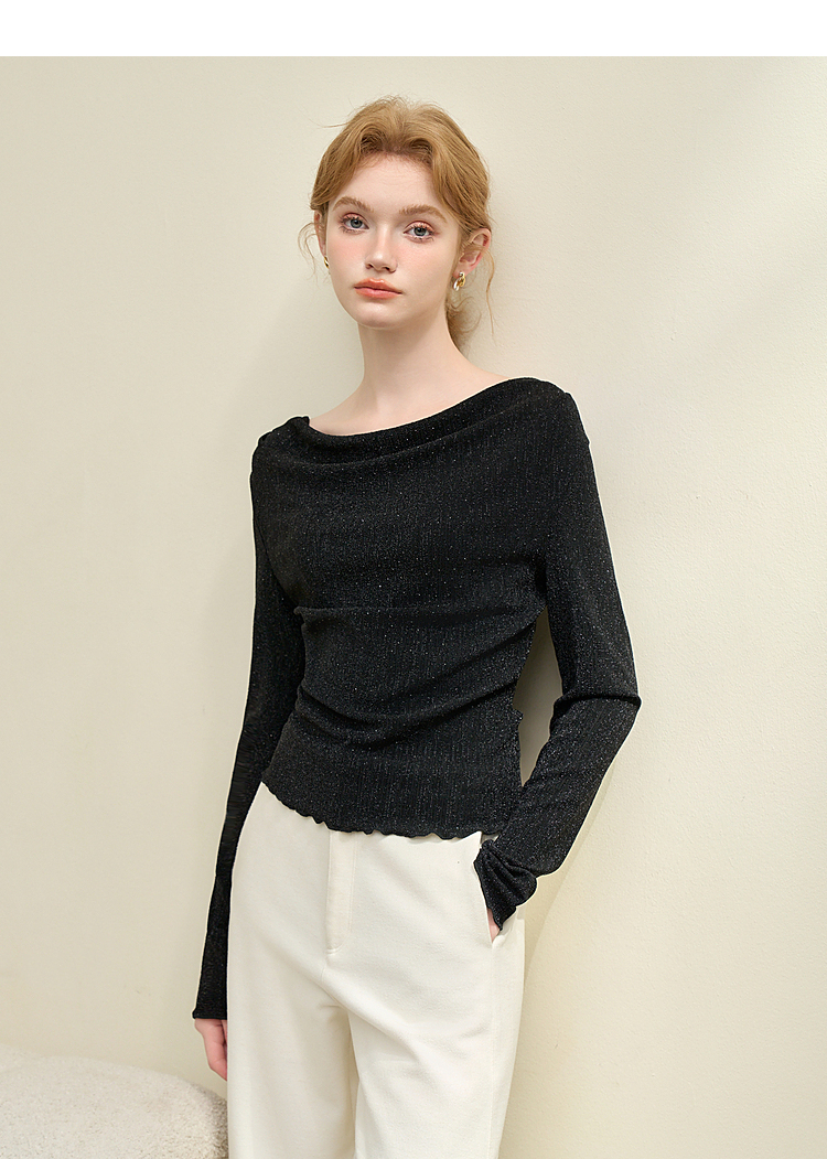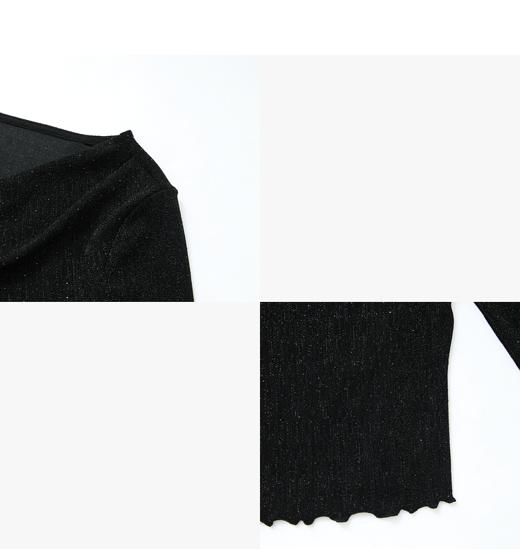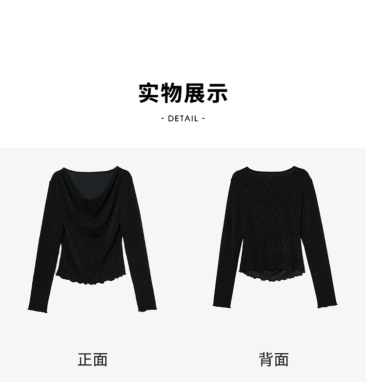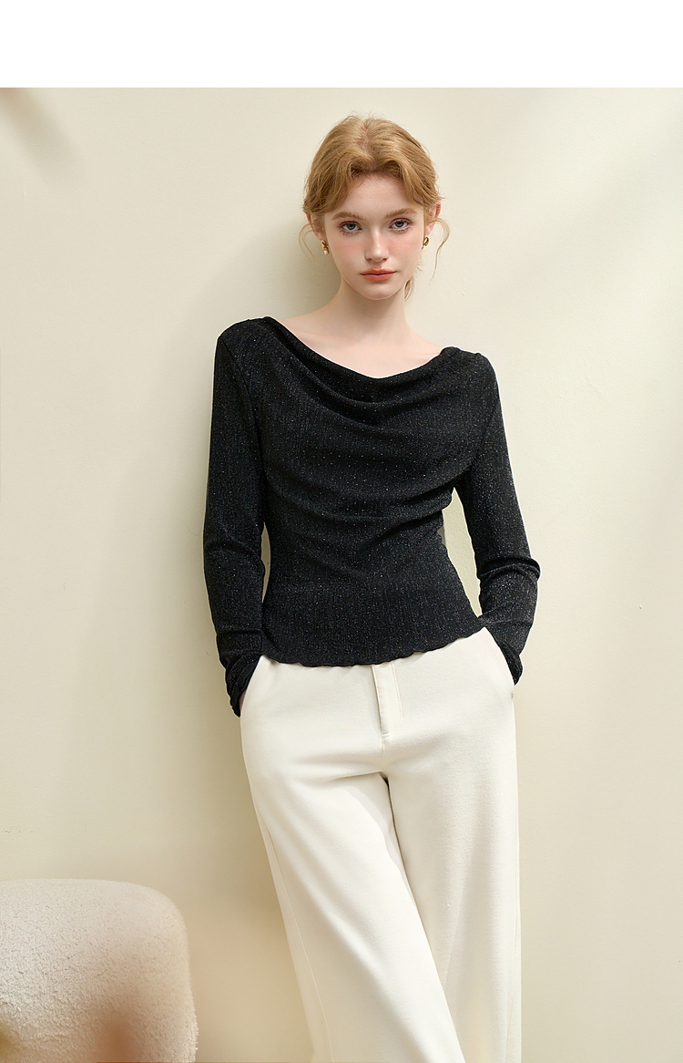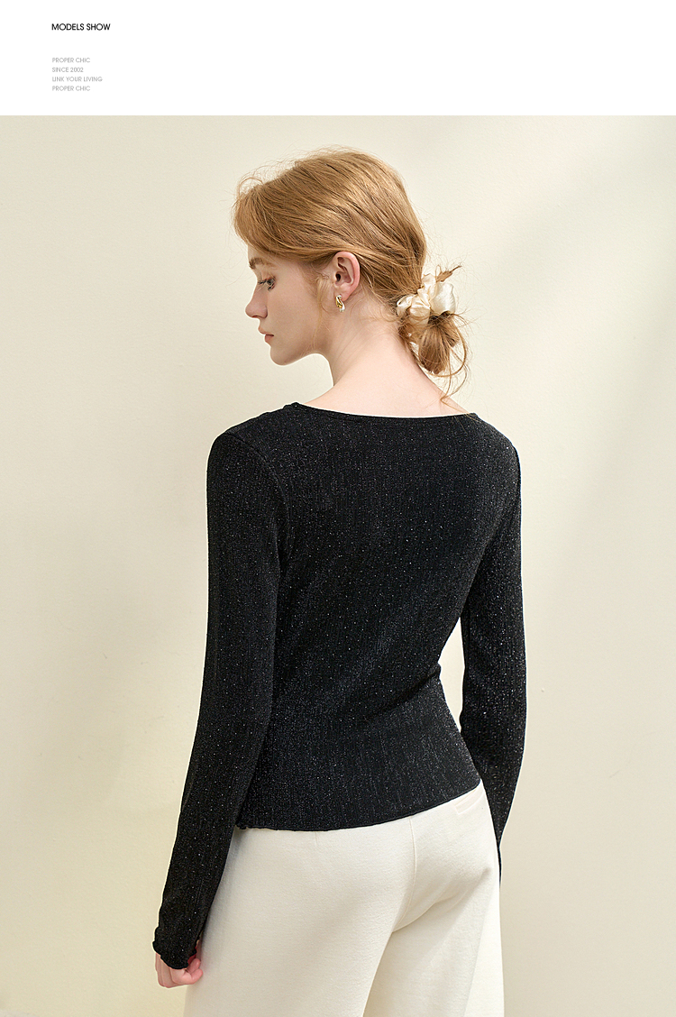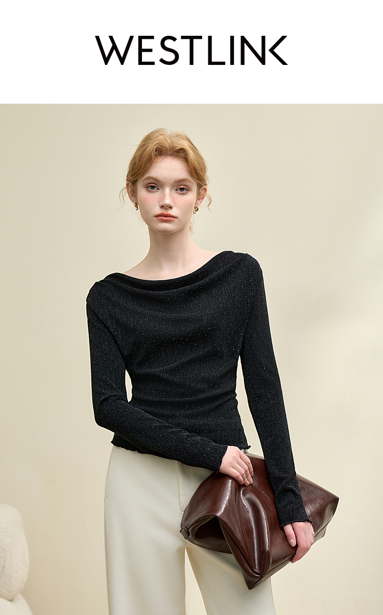 复古摩登设计感亮丝烫钻荡领长袖T恤女针织上衣V4243199