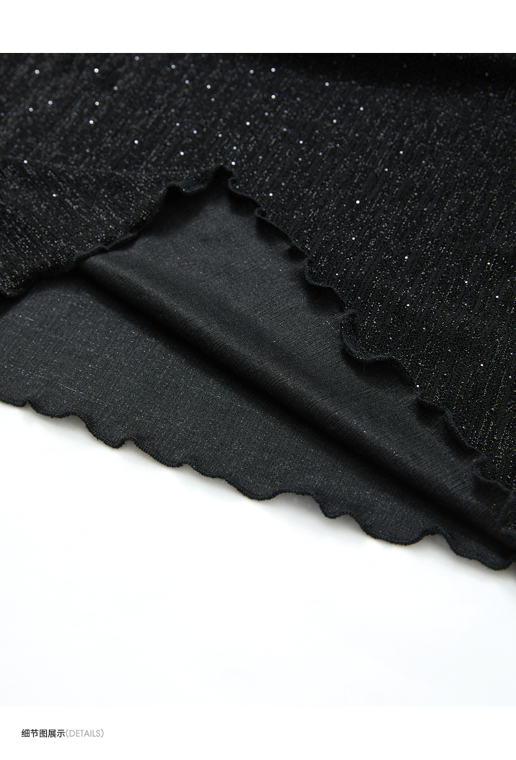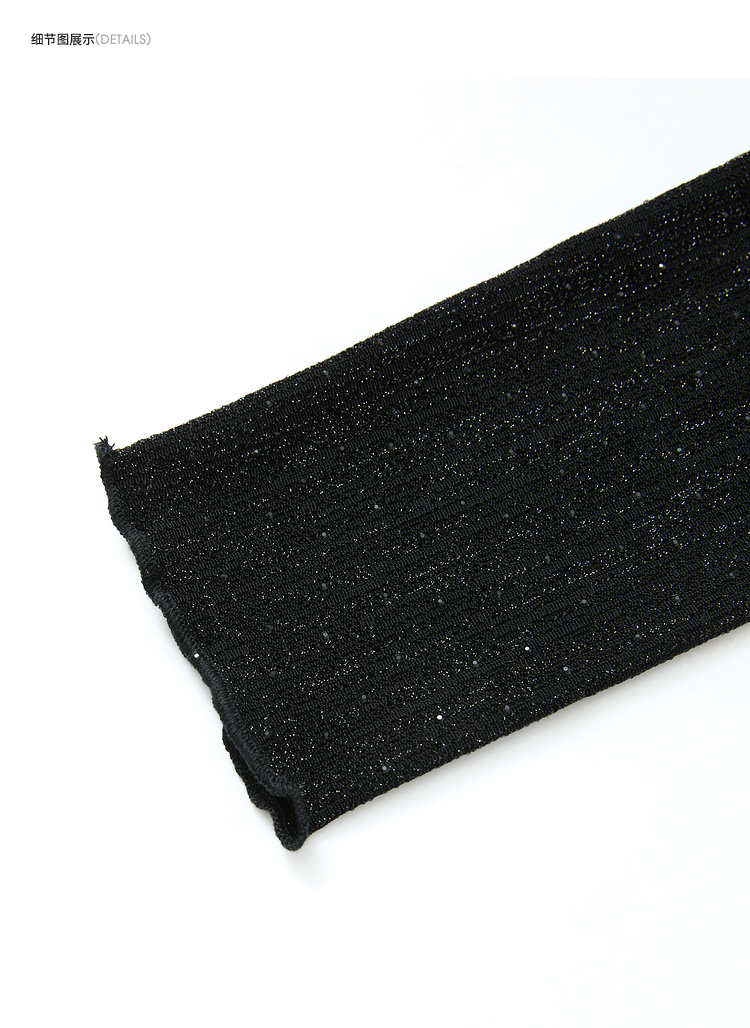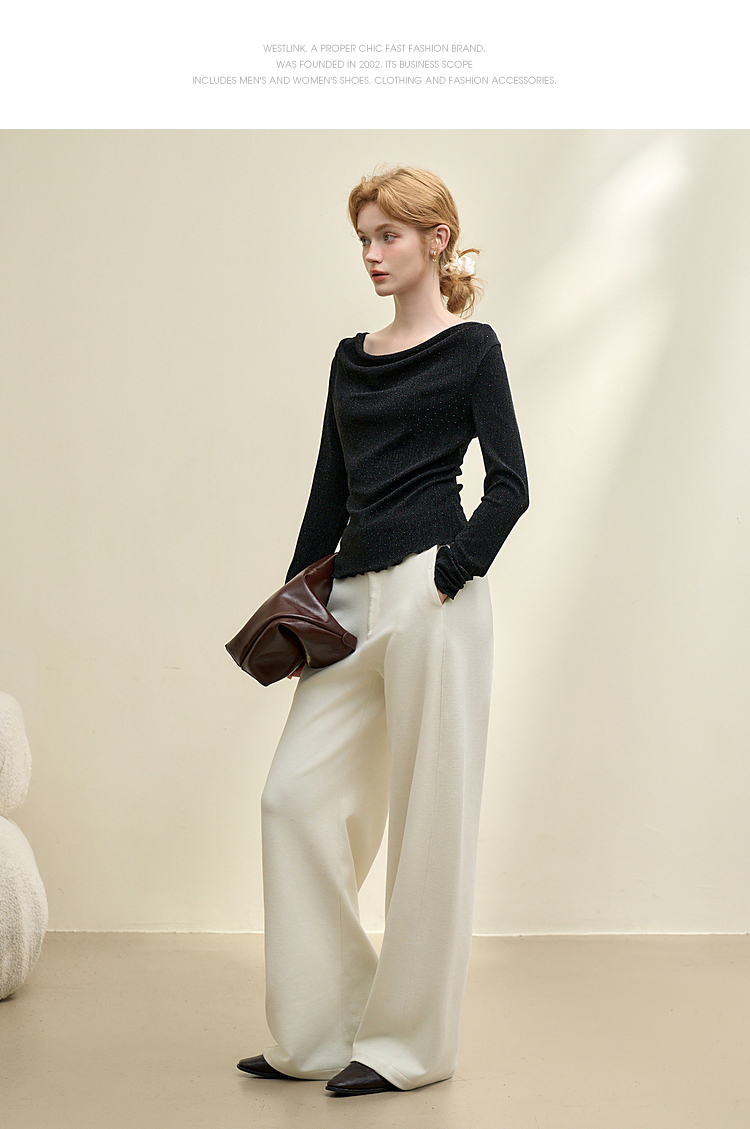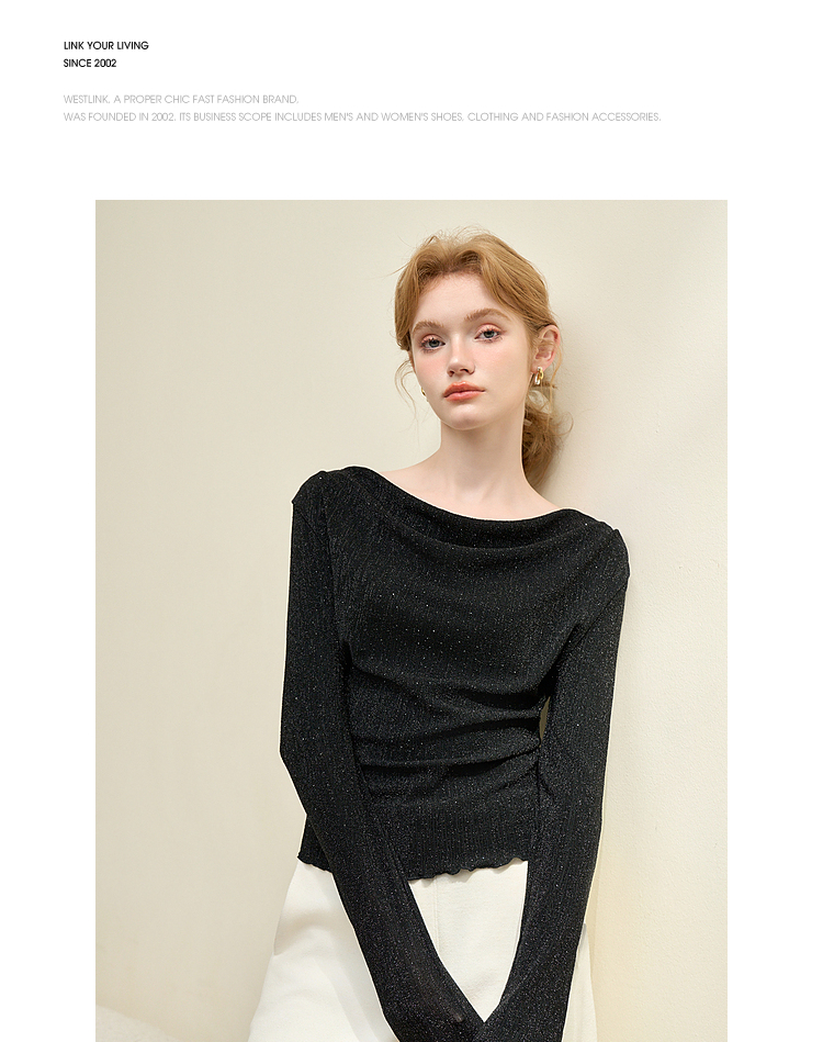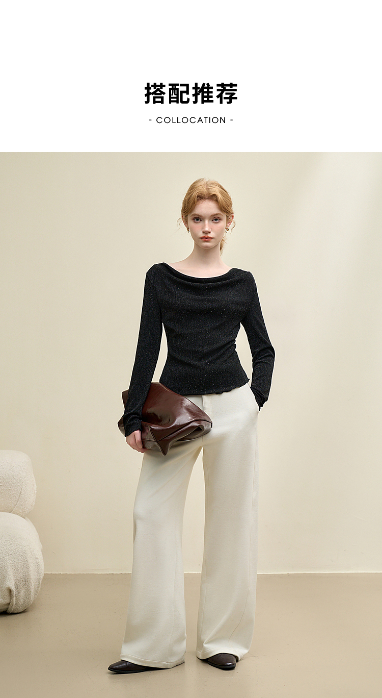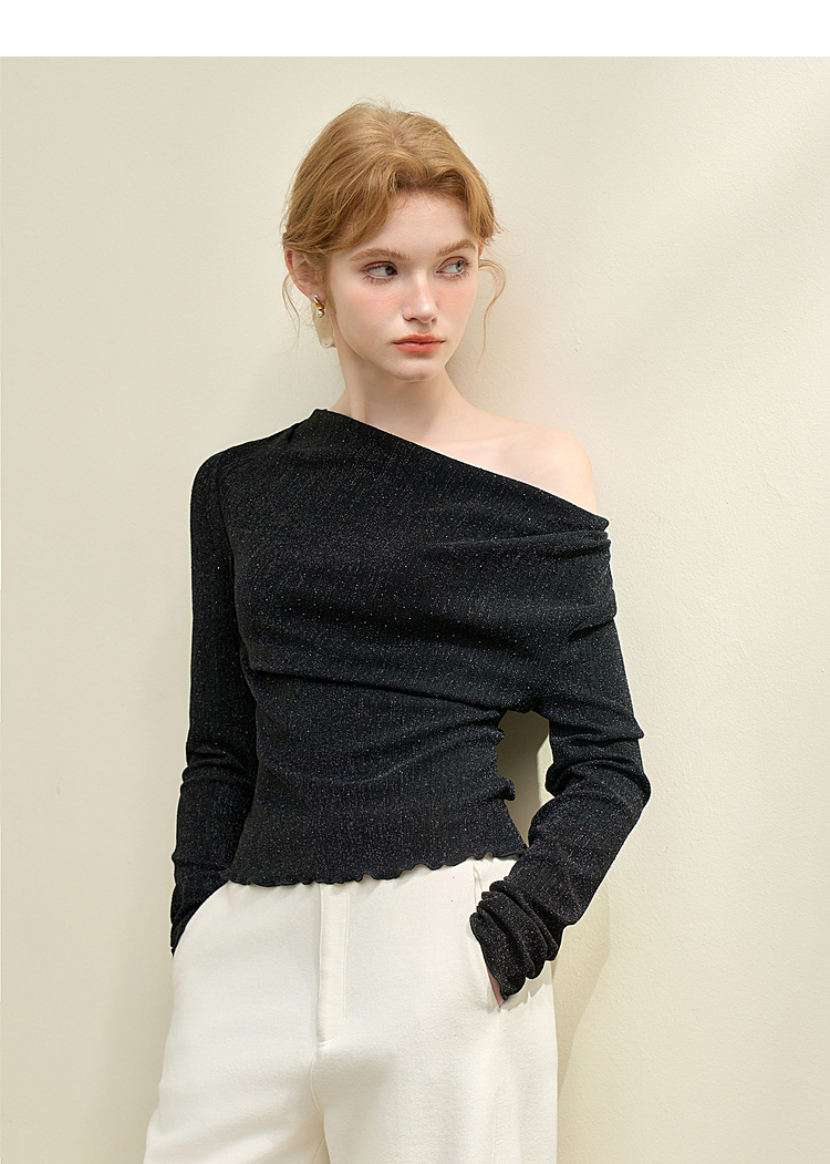 复古摩登设计感亮丝烫钻荡领长袖T恤女针织上衣V4243199