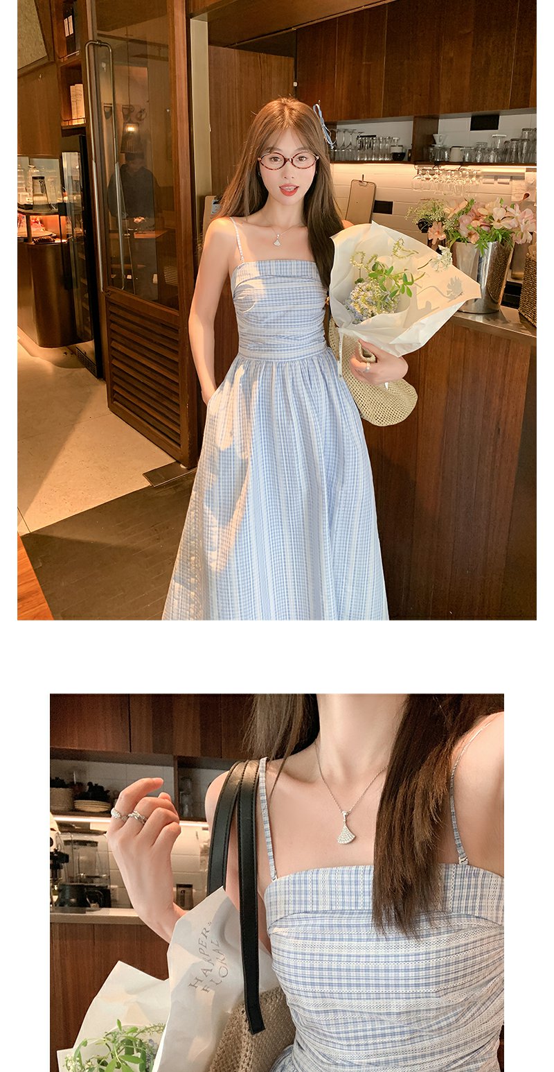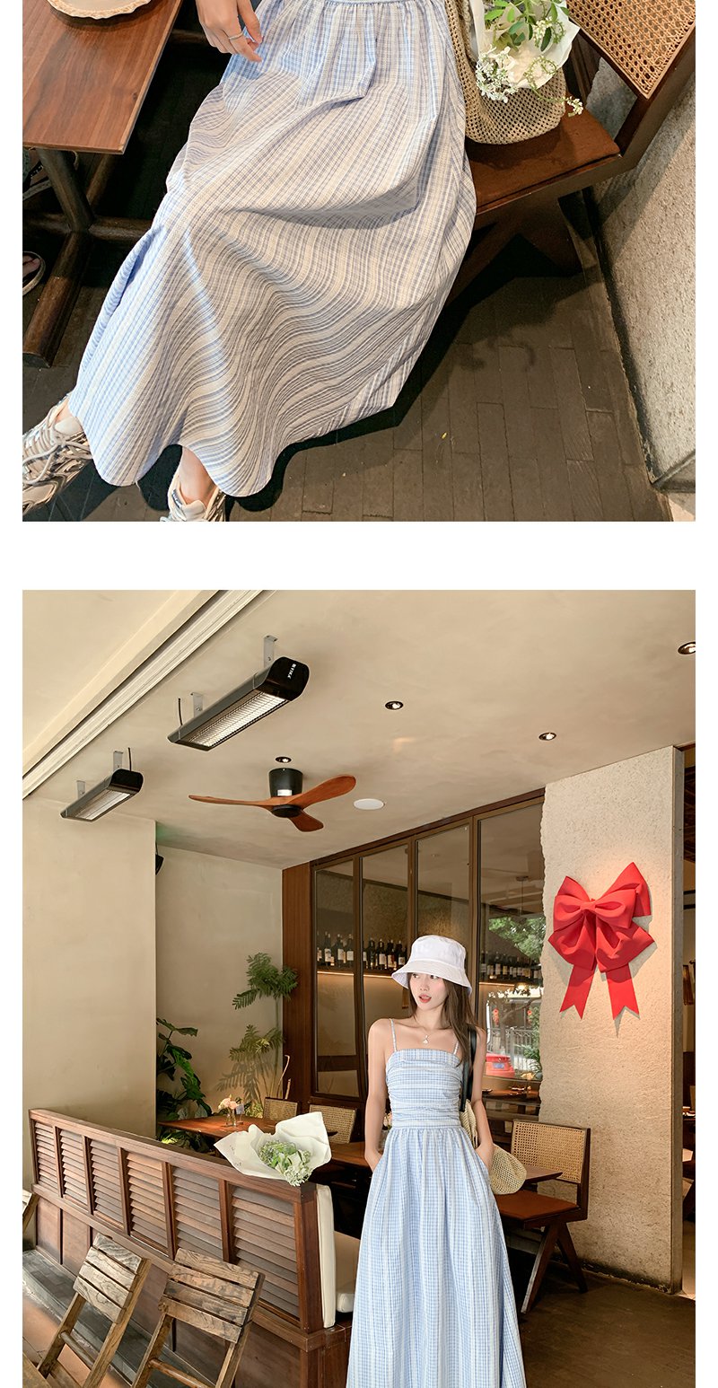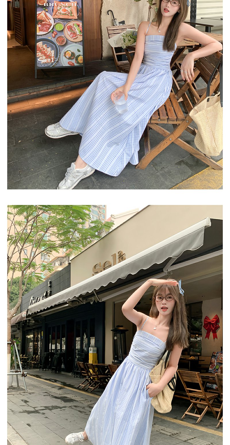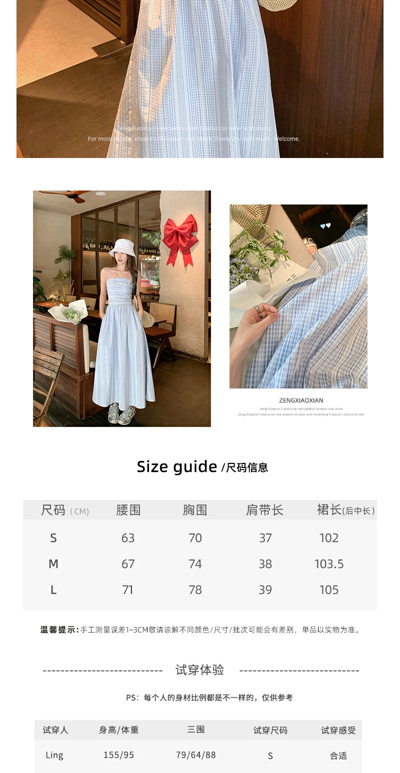 <曾小咸推荐>蓝白格吊带长裙收腰显瘦连衣裙