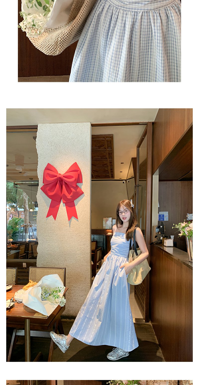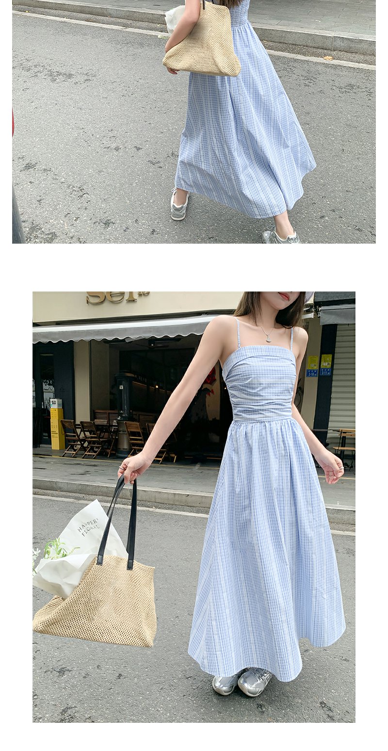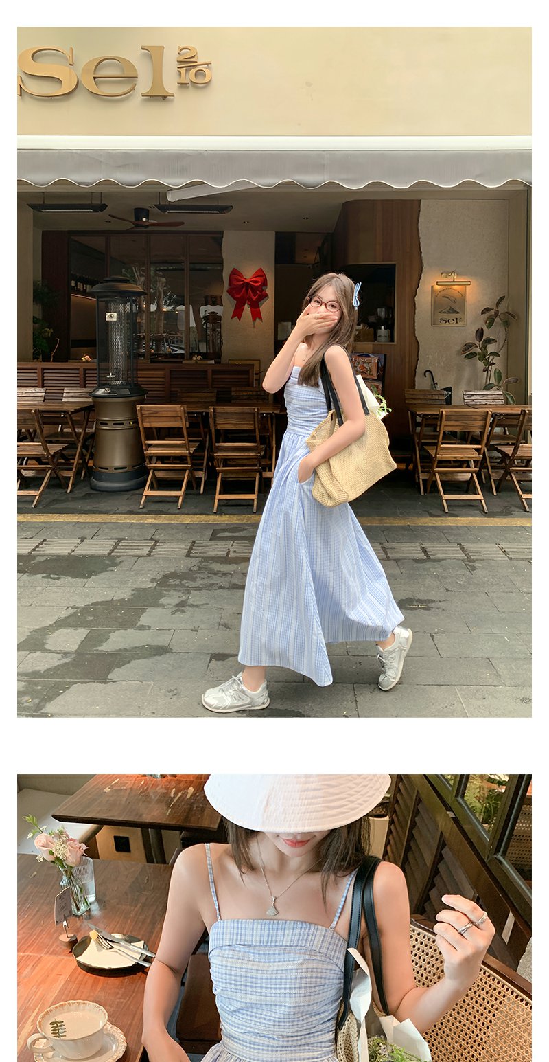 <曾小咸推荐>蓝白格吊带长裙收腰显瘦连衣裙