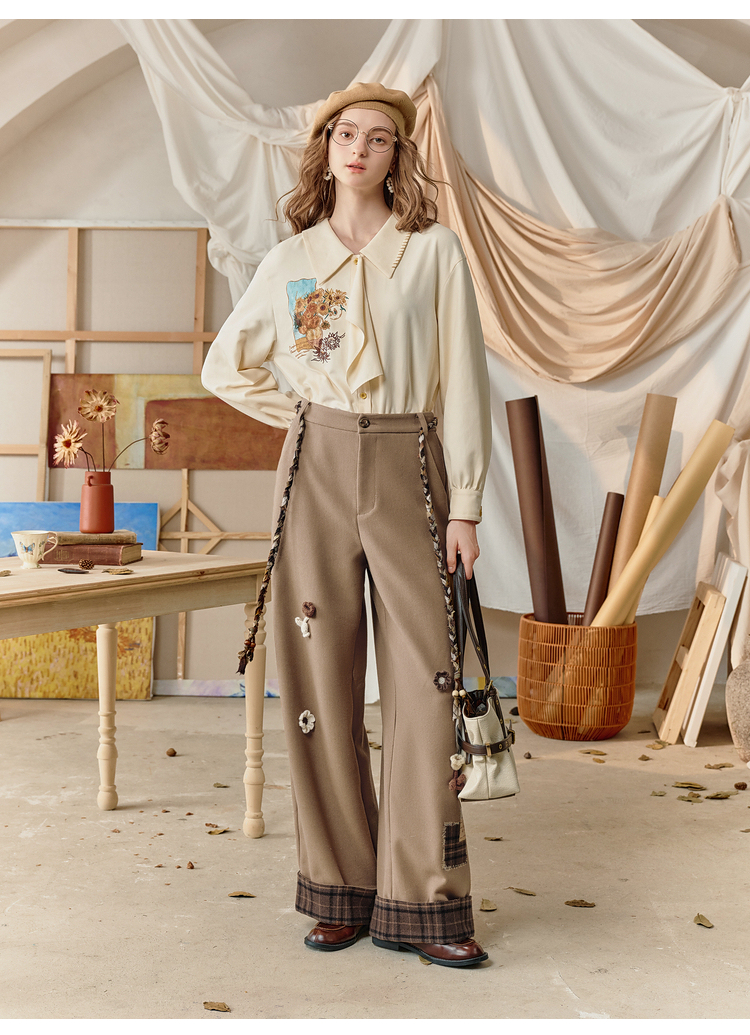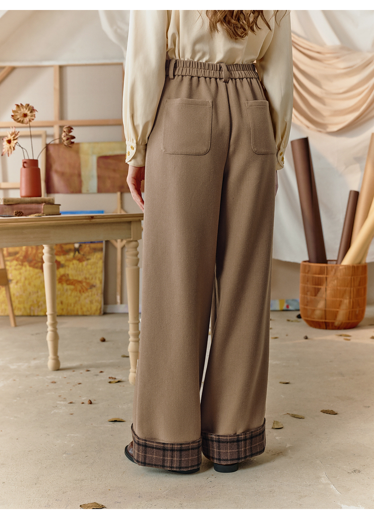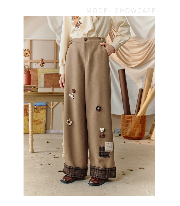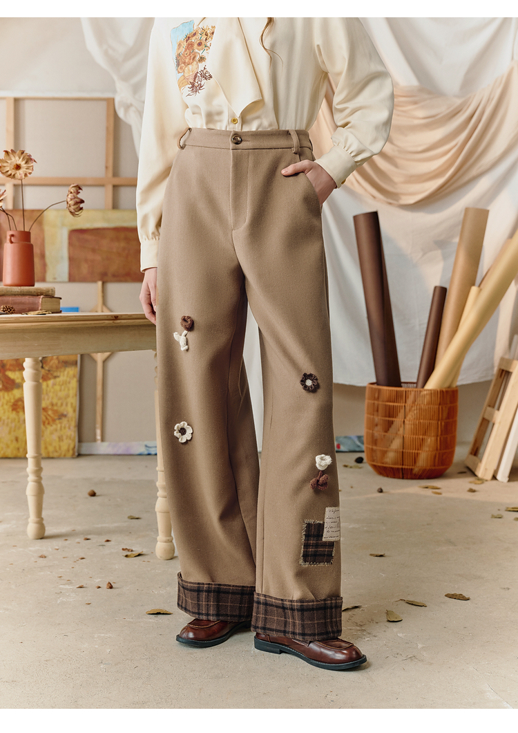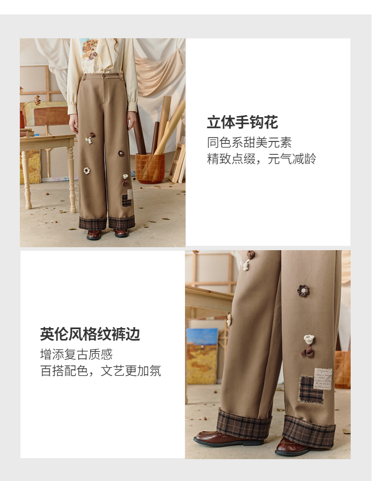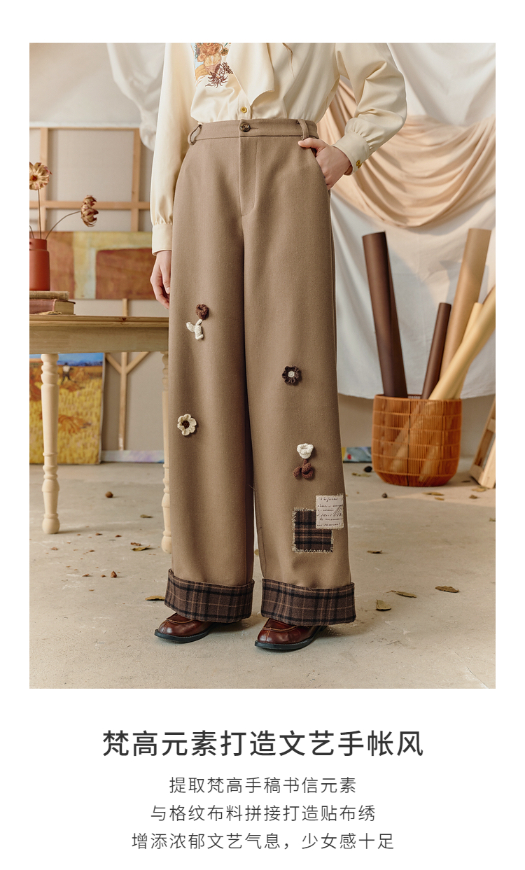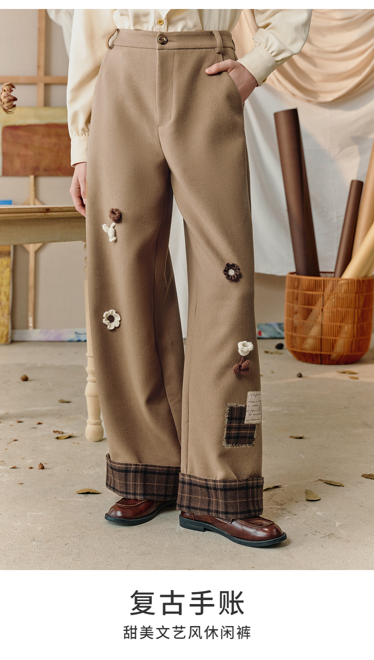 两三事梵高文艺复古手账2025冬新款立体钩花格子翻边裤脚休闲裤女