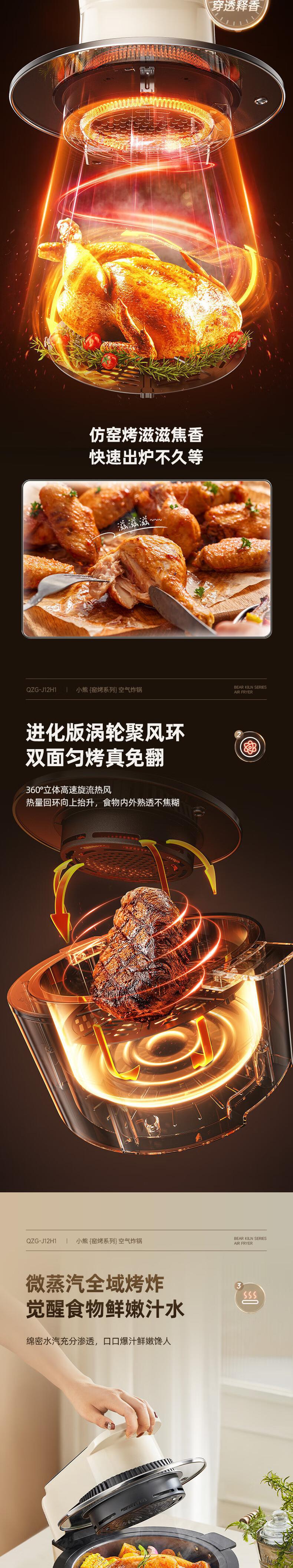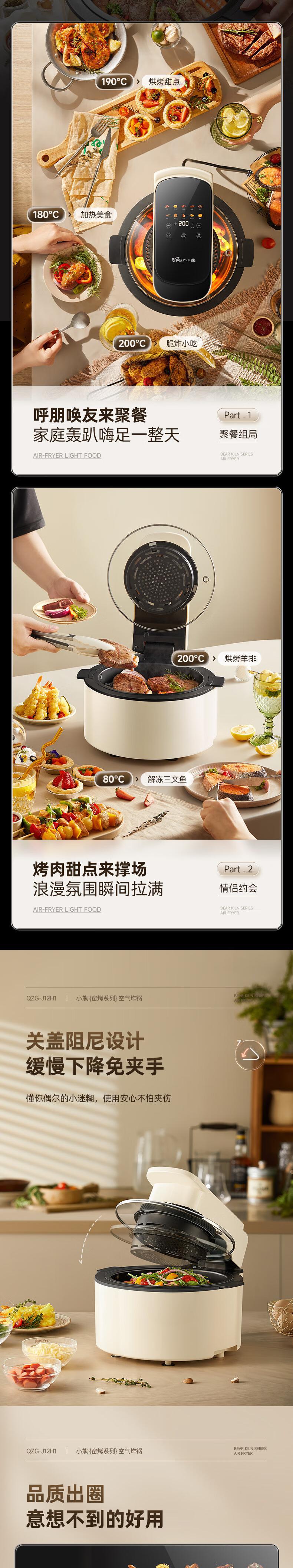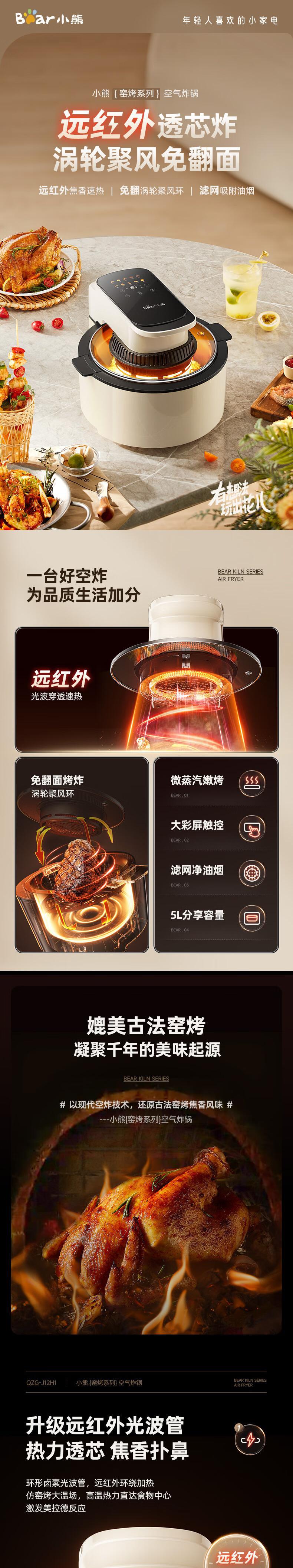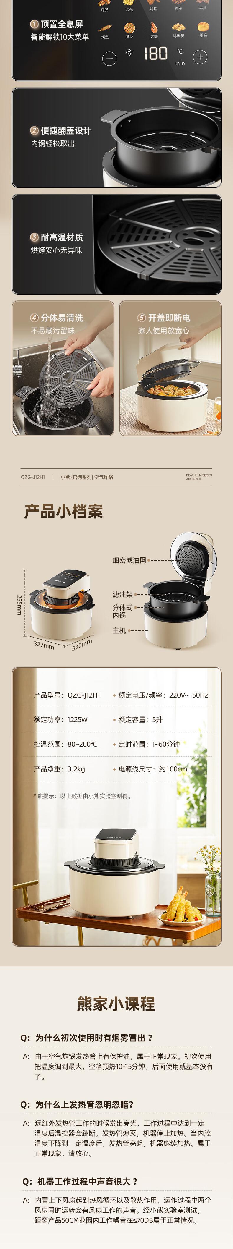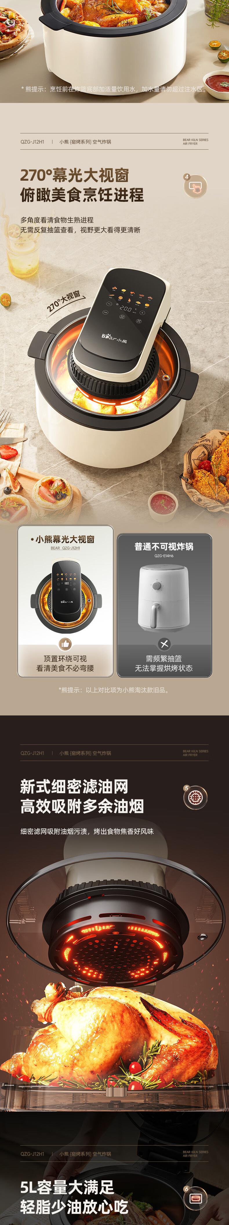 【自营】小熊(Bear)5L空气炸锅 QZG-J12H1大视窗可视炸锅无油低脂免翻面智能菜单不粘易洗