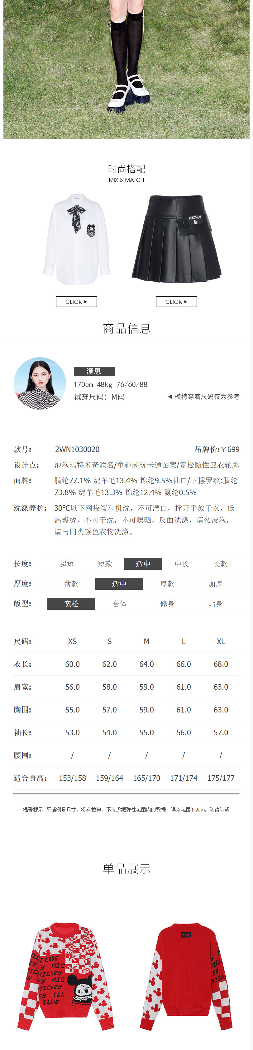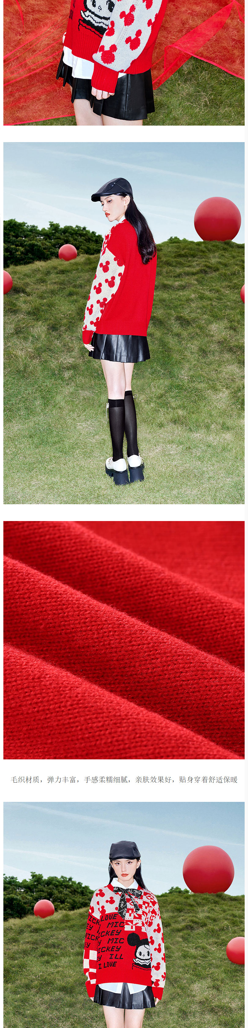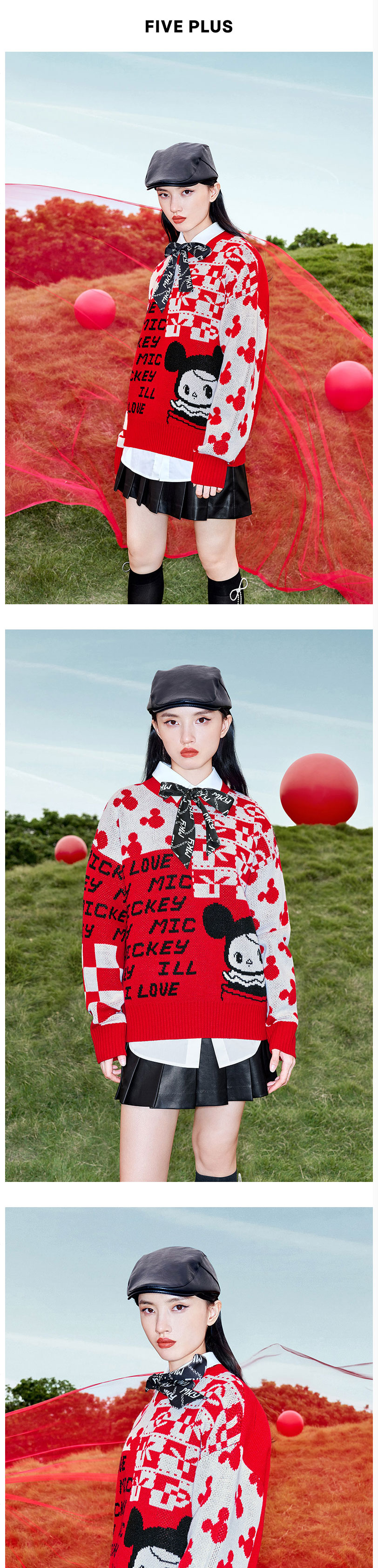 FIVE PLUS2022新款女春装泡泡玛特红色毛衣女宽松卡通米奇套头衫2WN1030020
