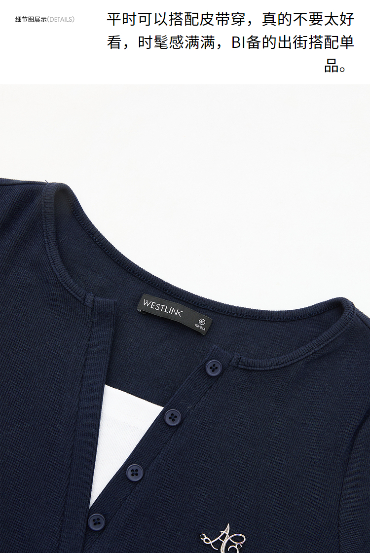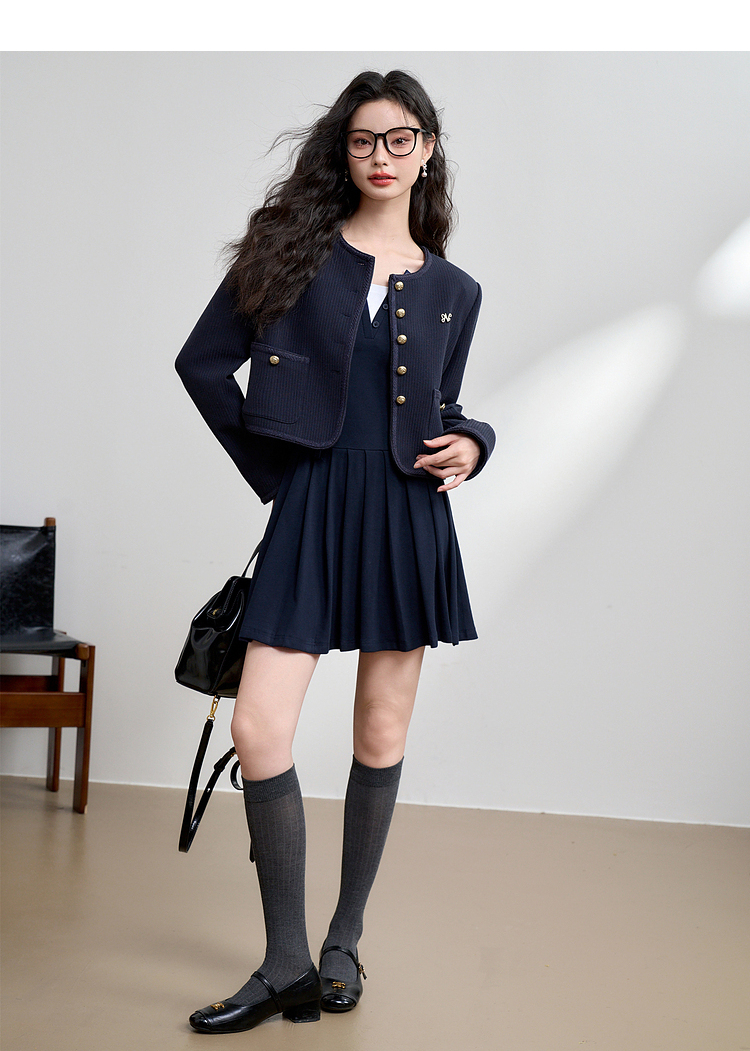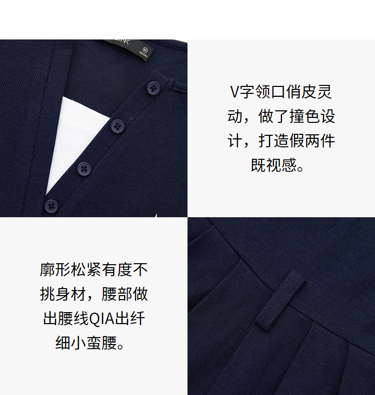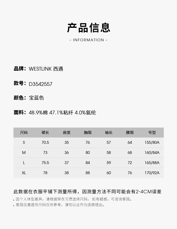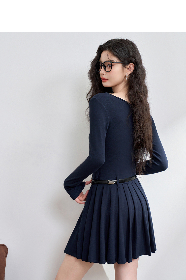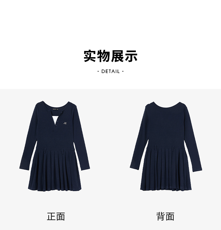 西遇长袖假两件连衣裙女新款V领宝蓝MIU系学院风百褶裙D3542557