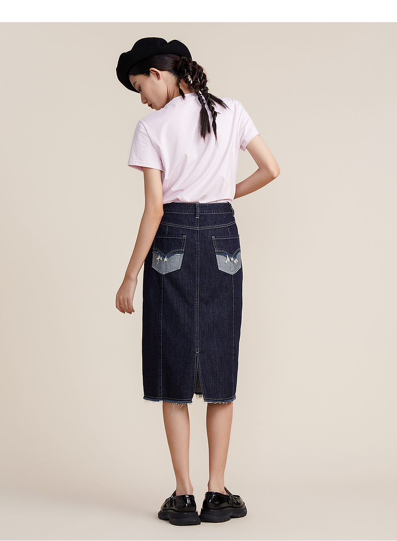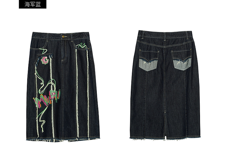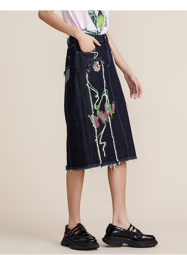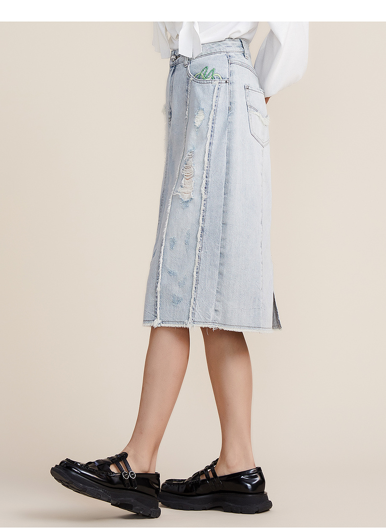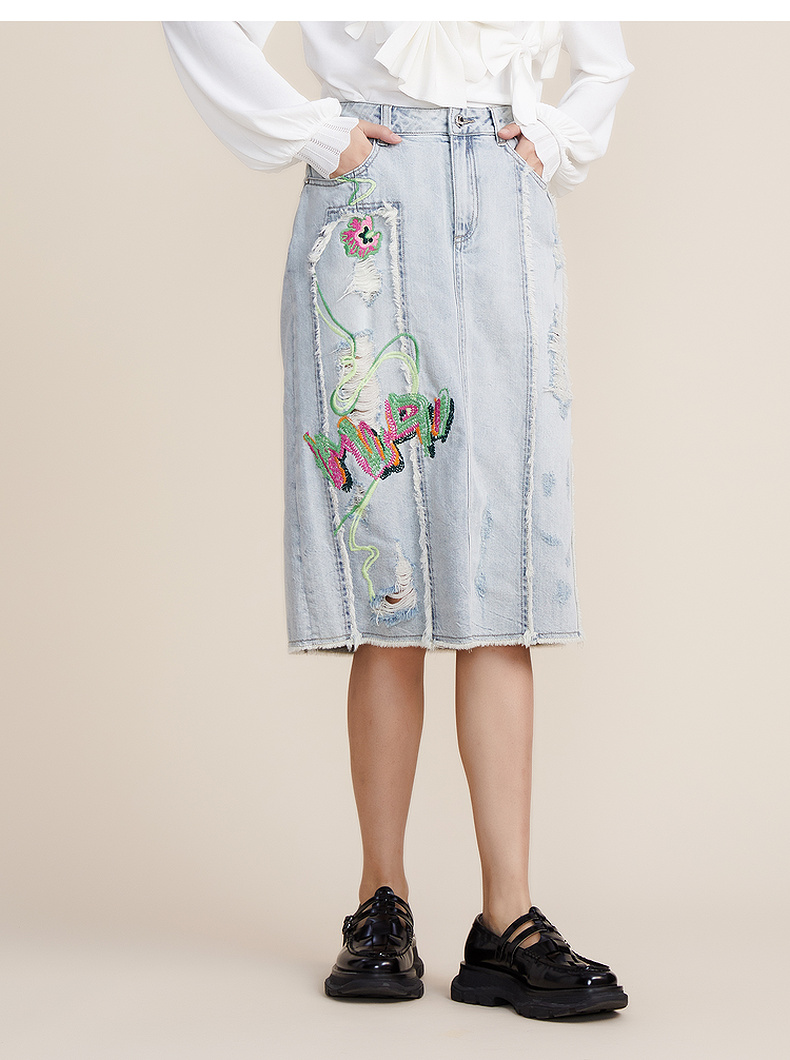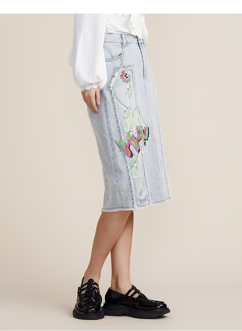 MIIDII谜底2022春款磨烂毛边合体刺绣天丝棉牛仔半身裙221MB0031