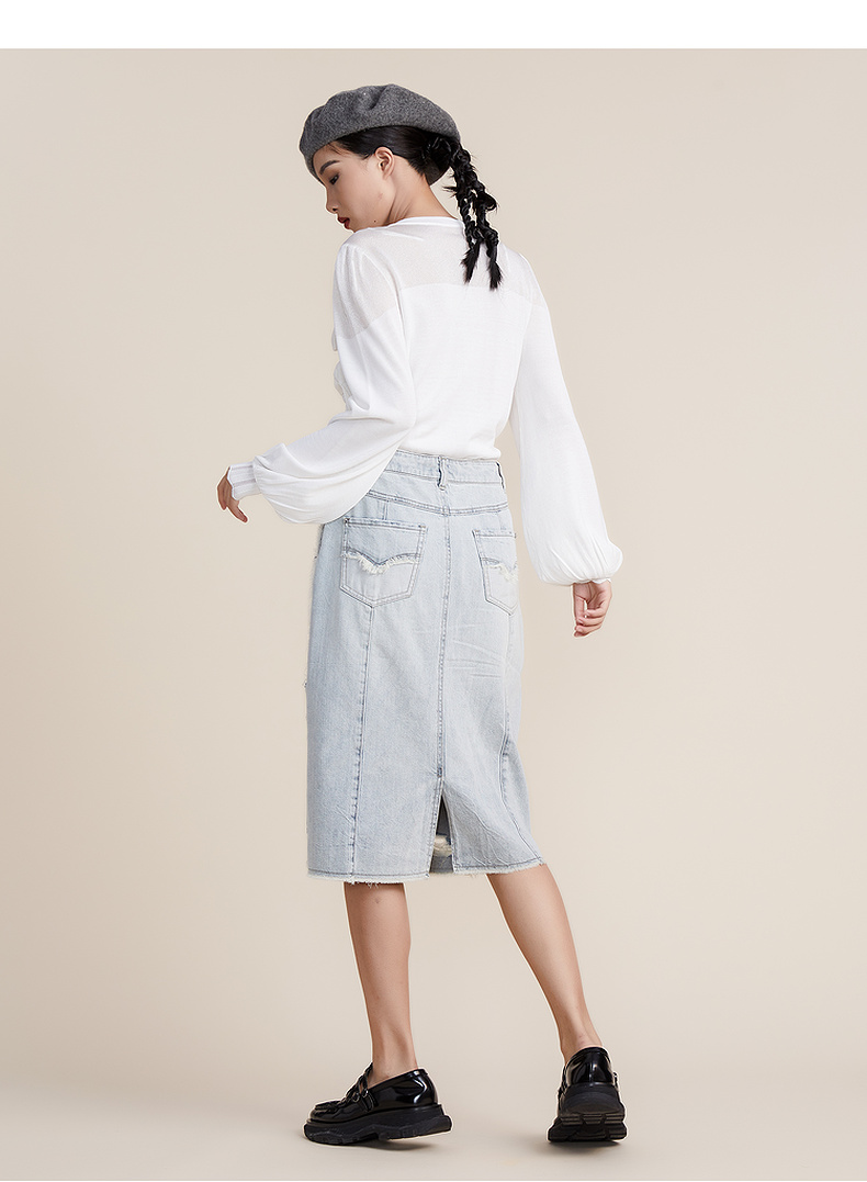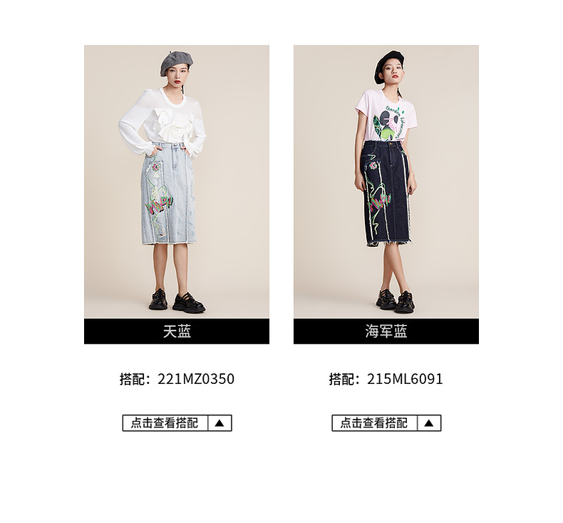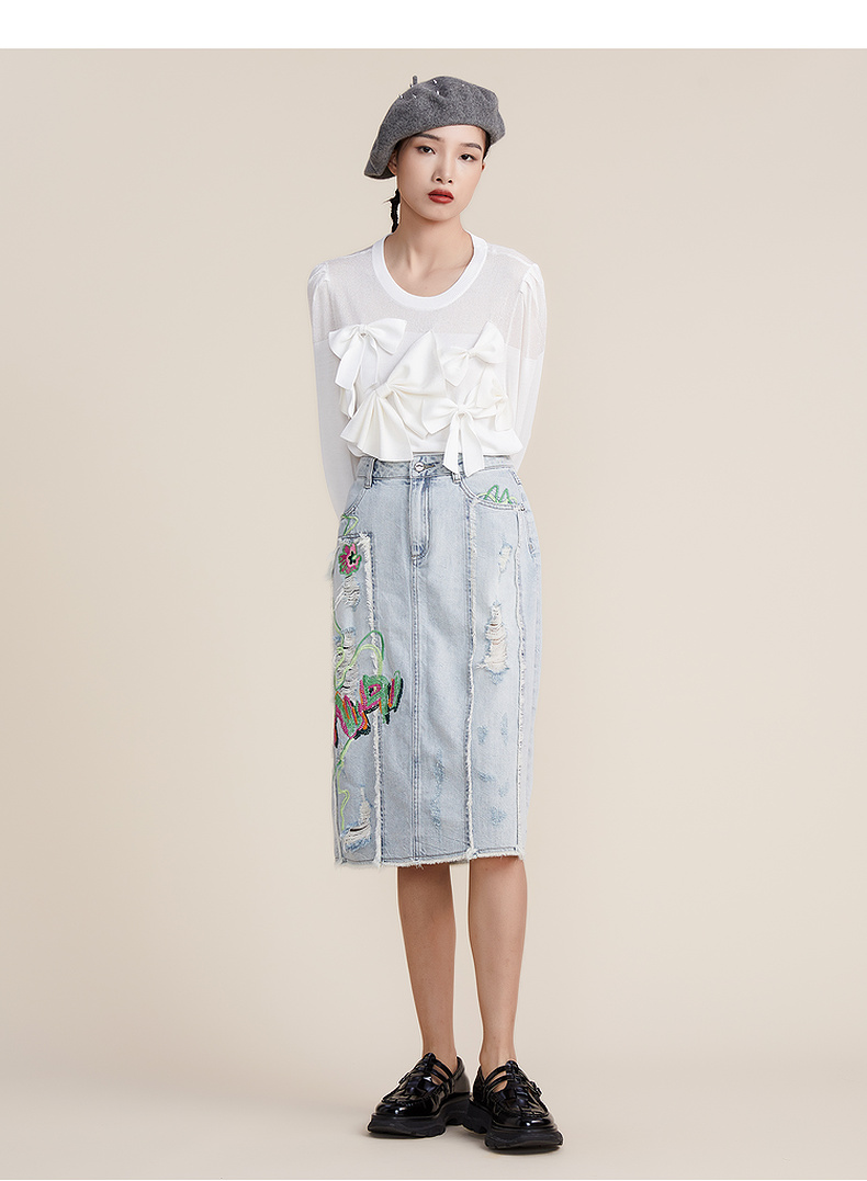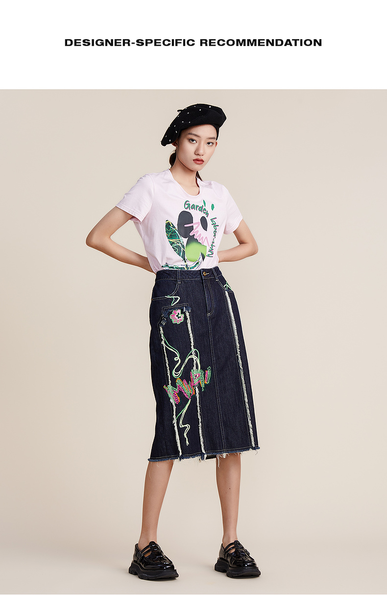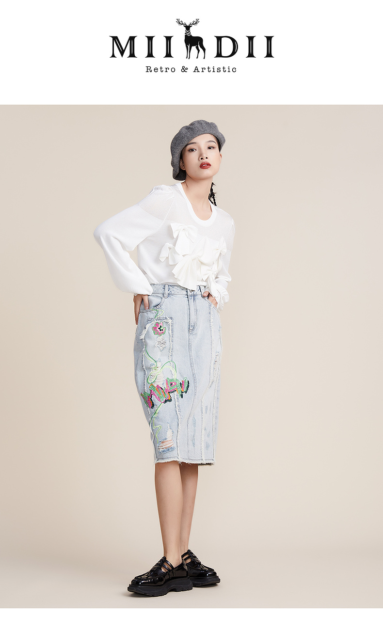 MIIDII谜底2022春款磨烂毛边合体刺绣天丝棉牛仔半身裙221MB0031