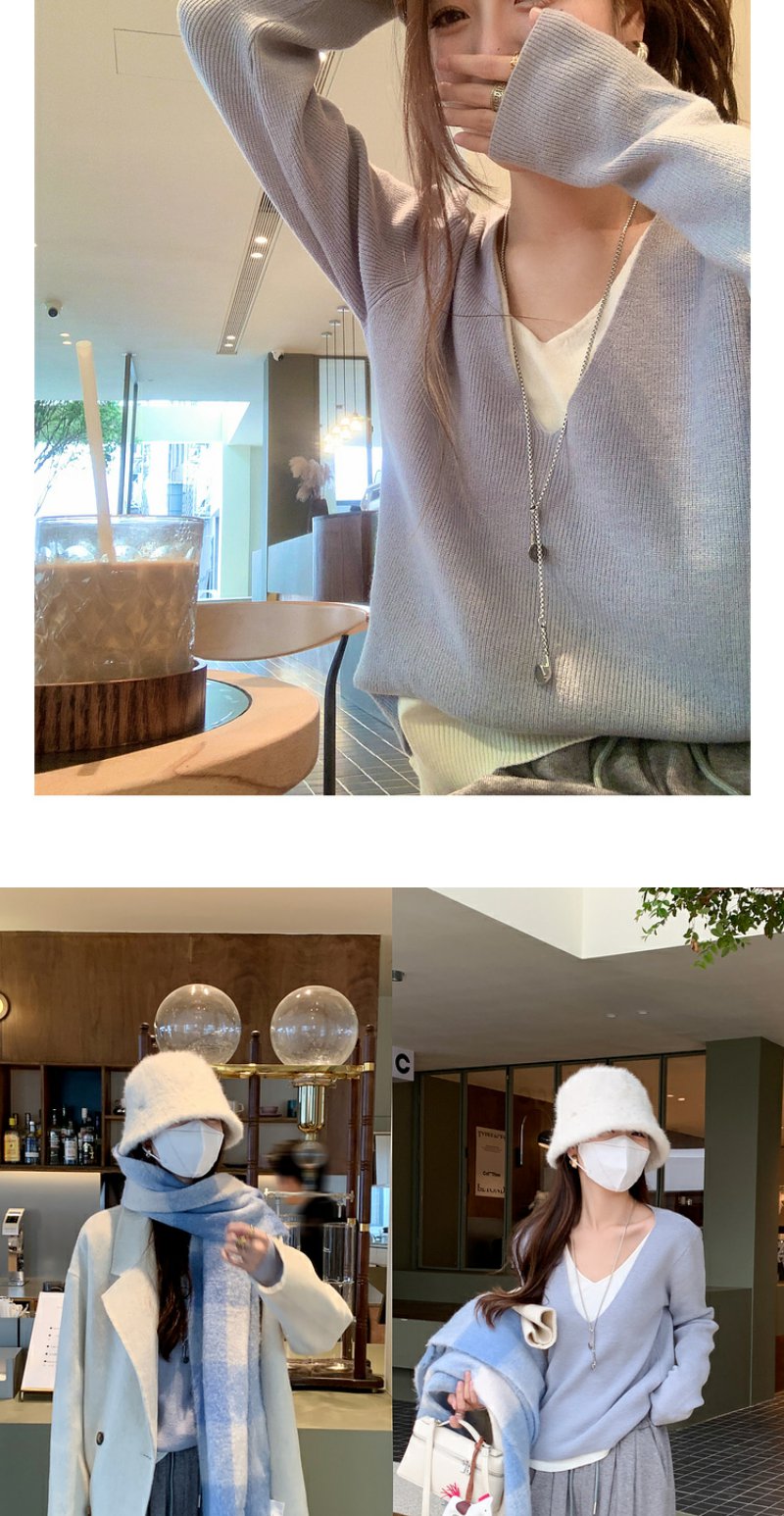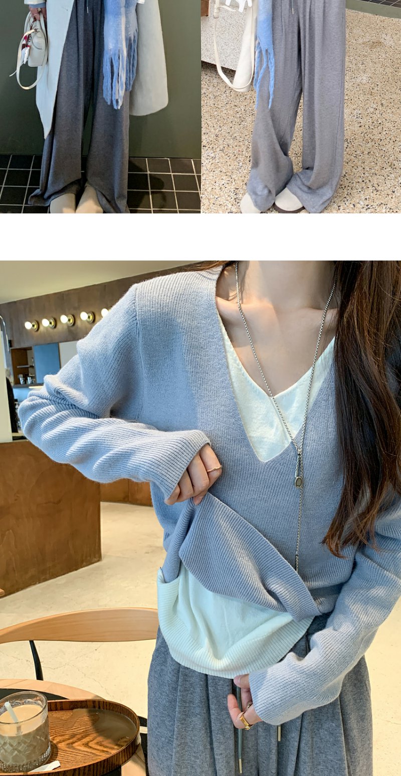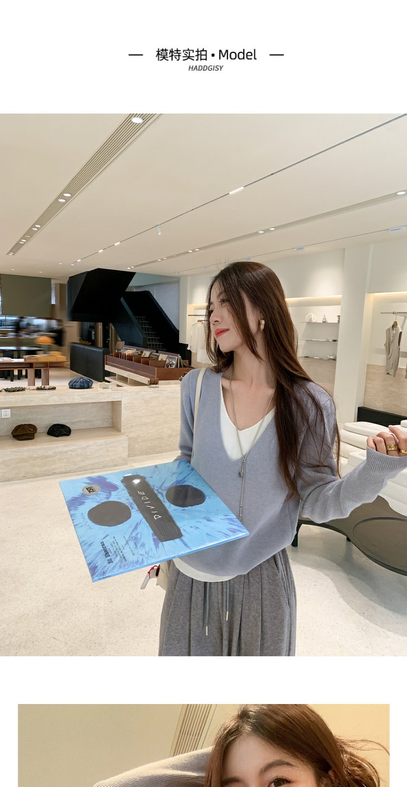 <曾小咸推荐>韩系假两件V领蓝色长袖针织衫女