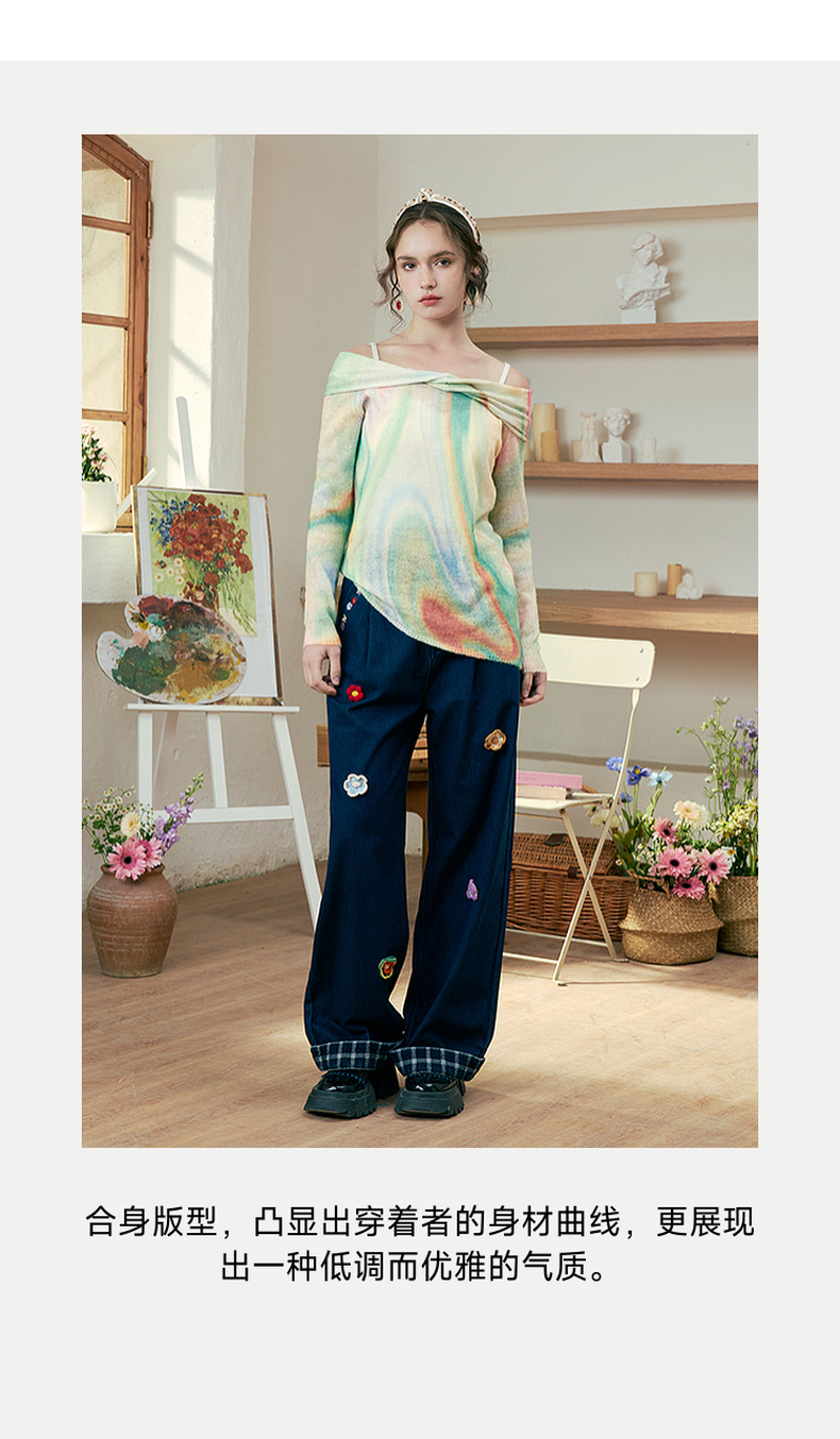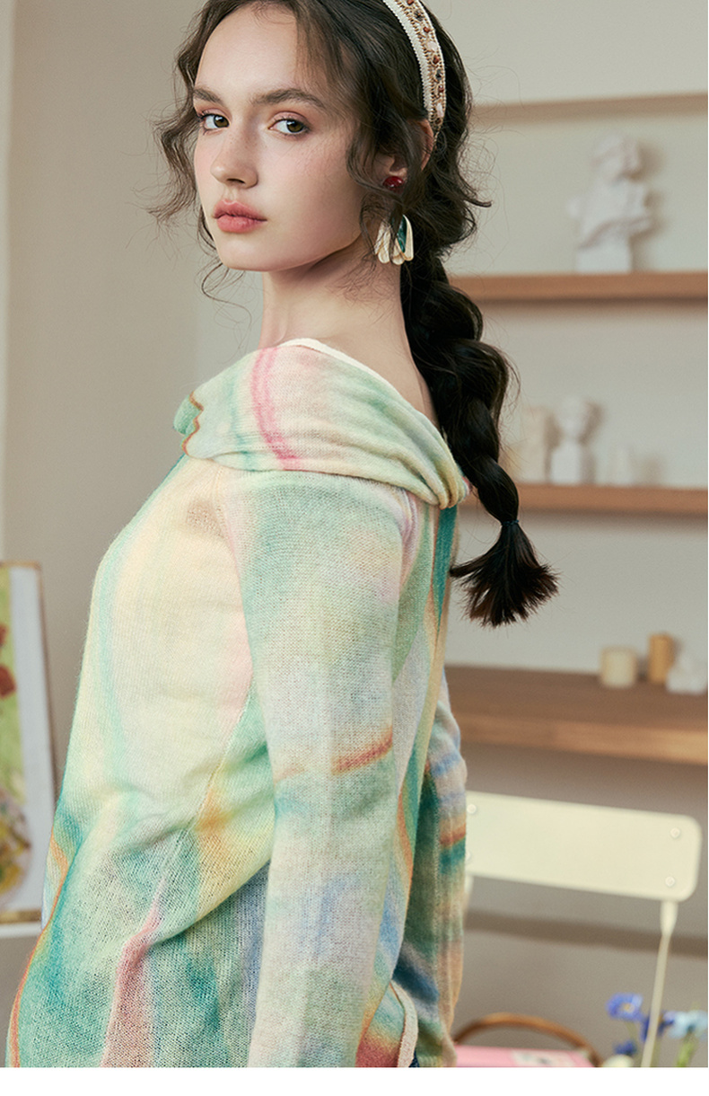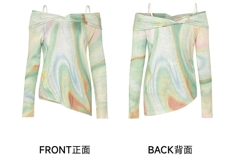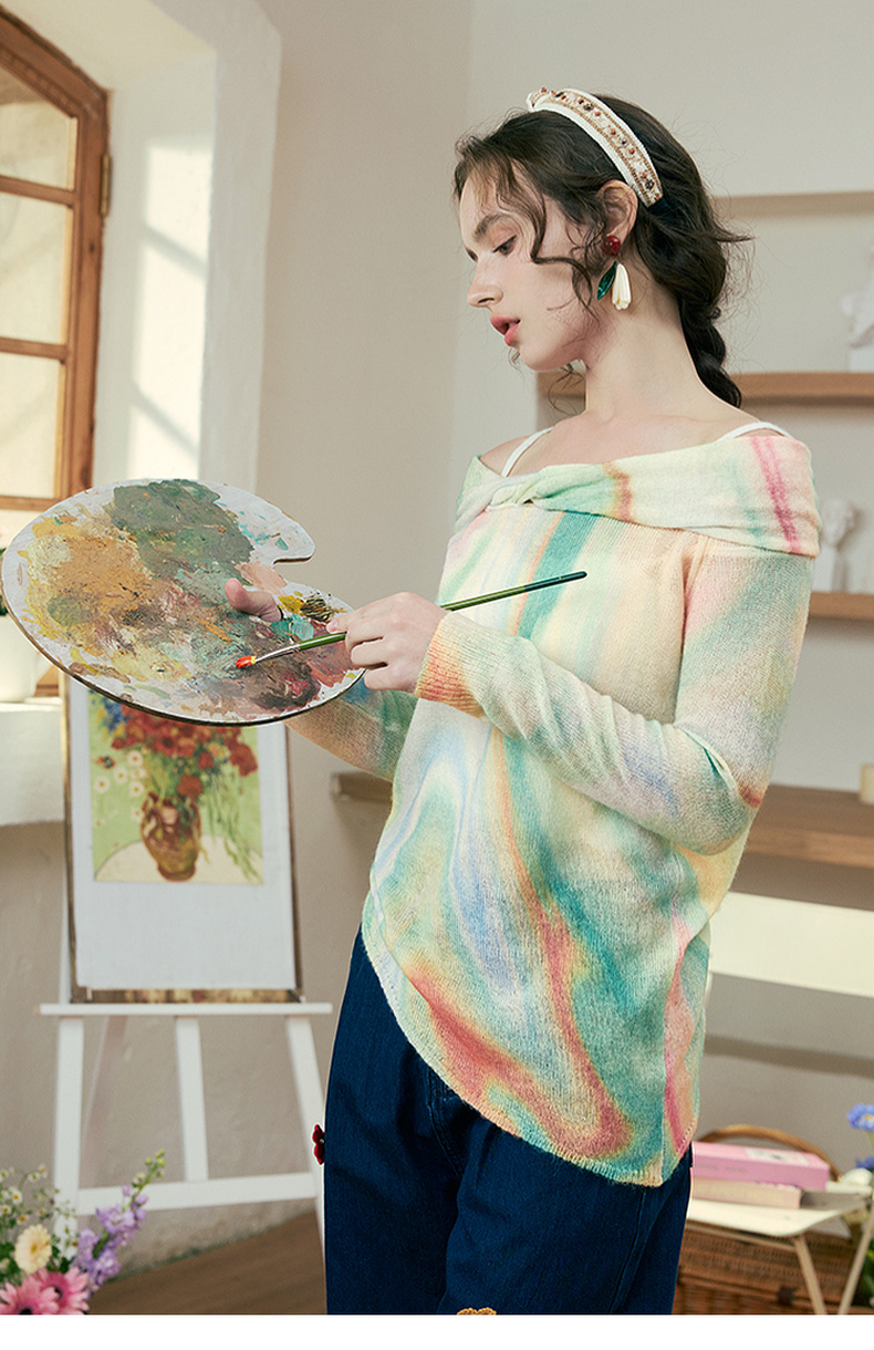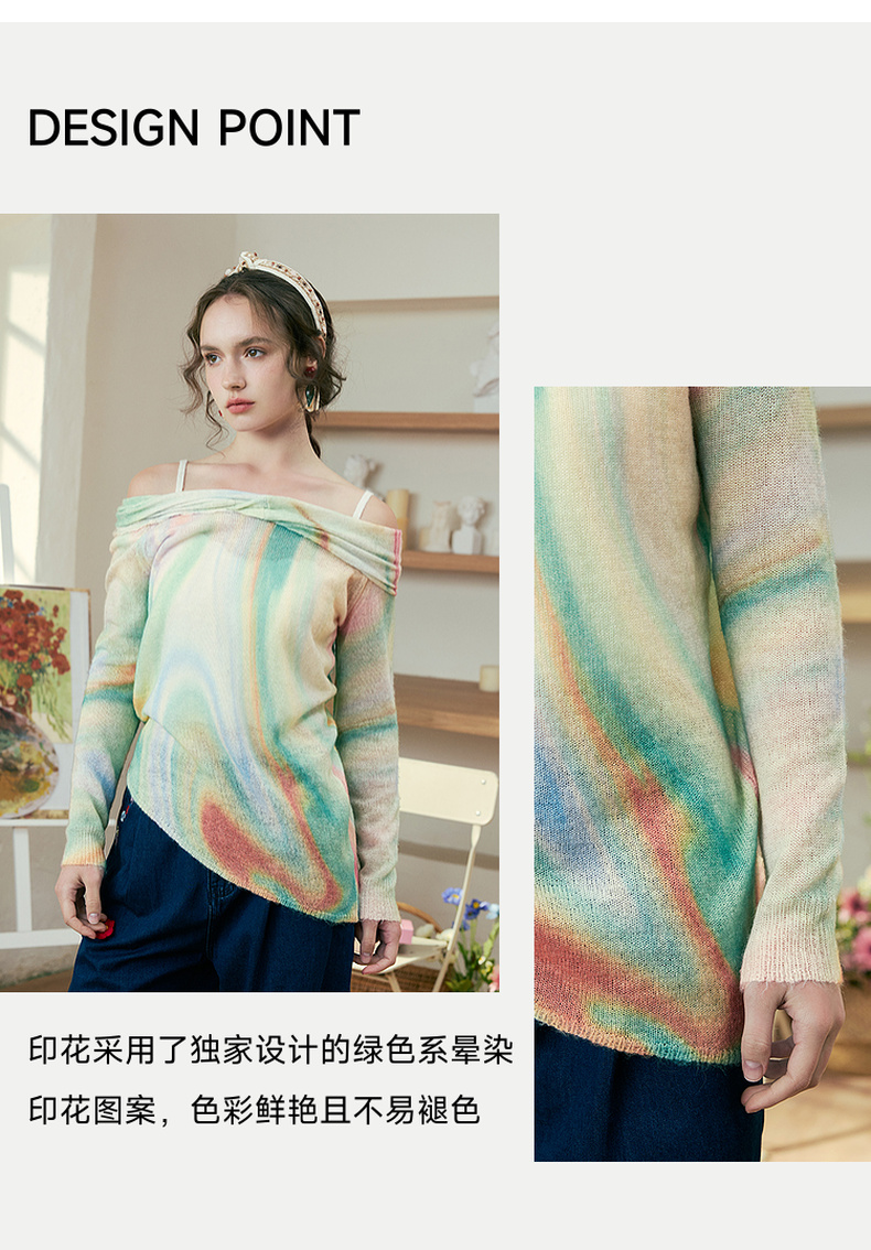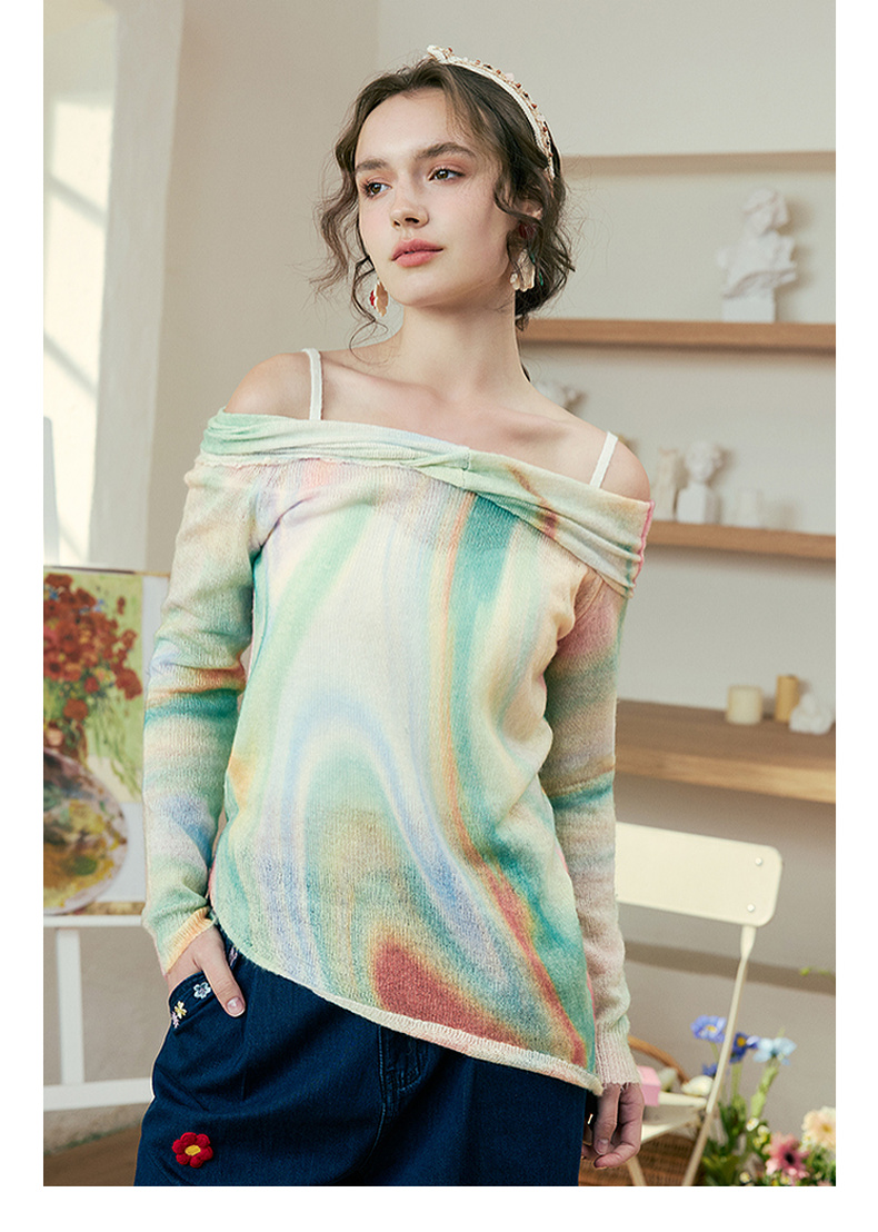 两三事 极光飞行 2025春季新款花色不对称下摆扭结一字肩针织衫女