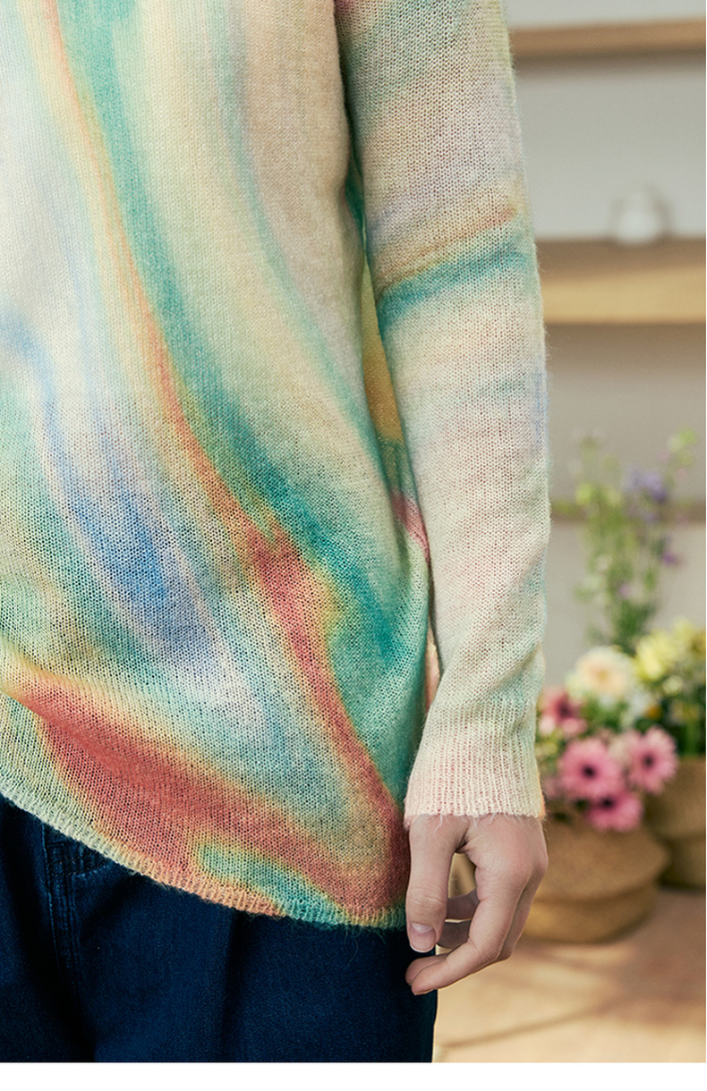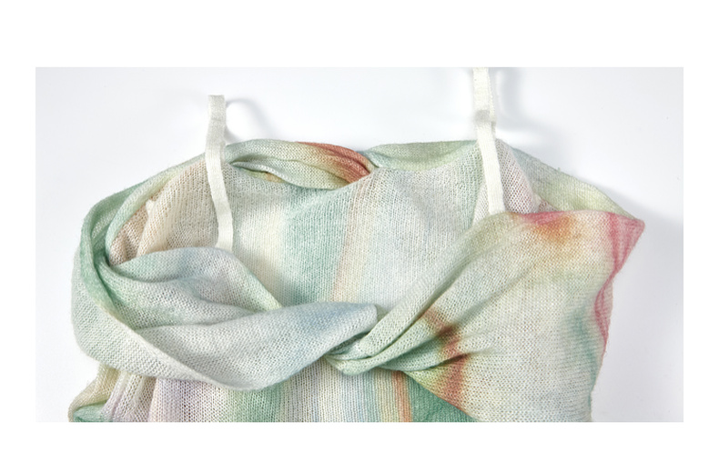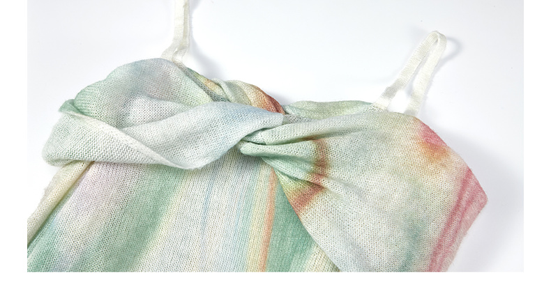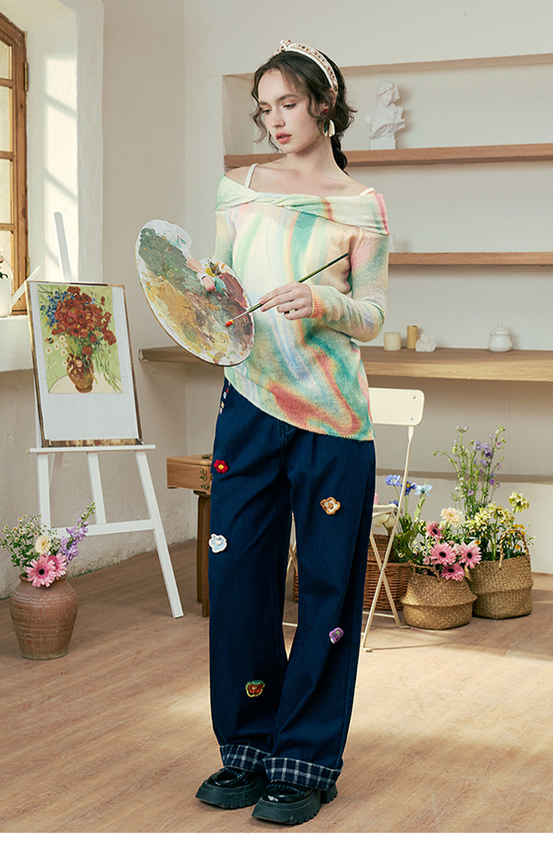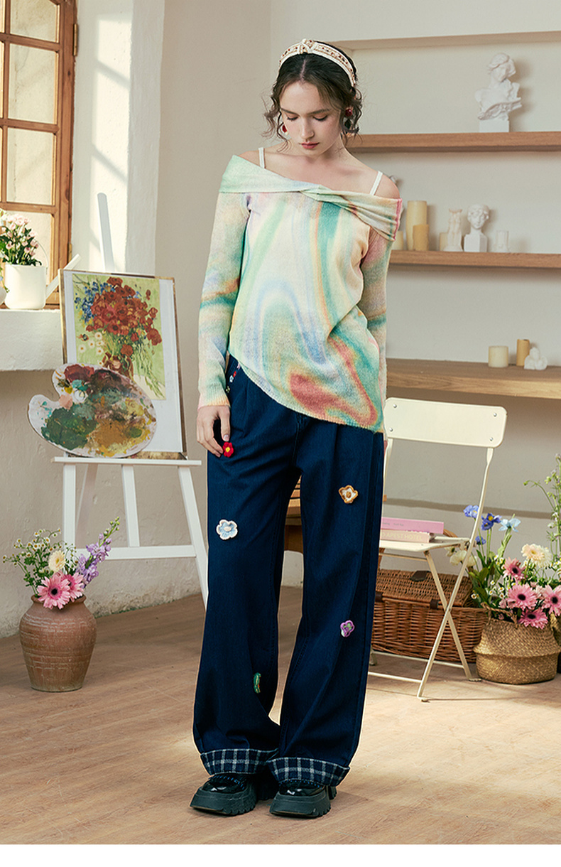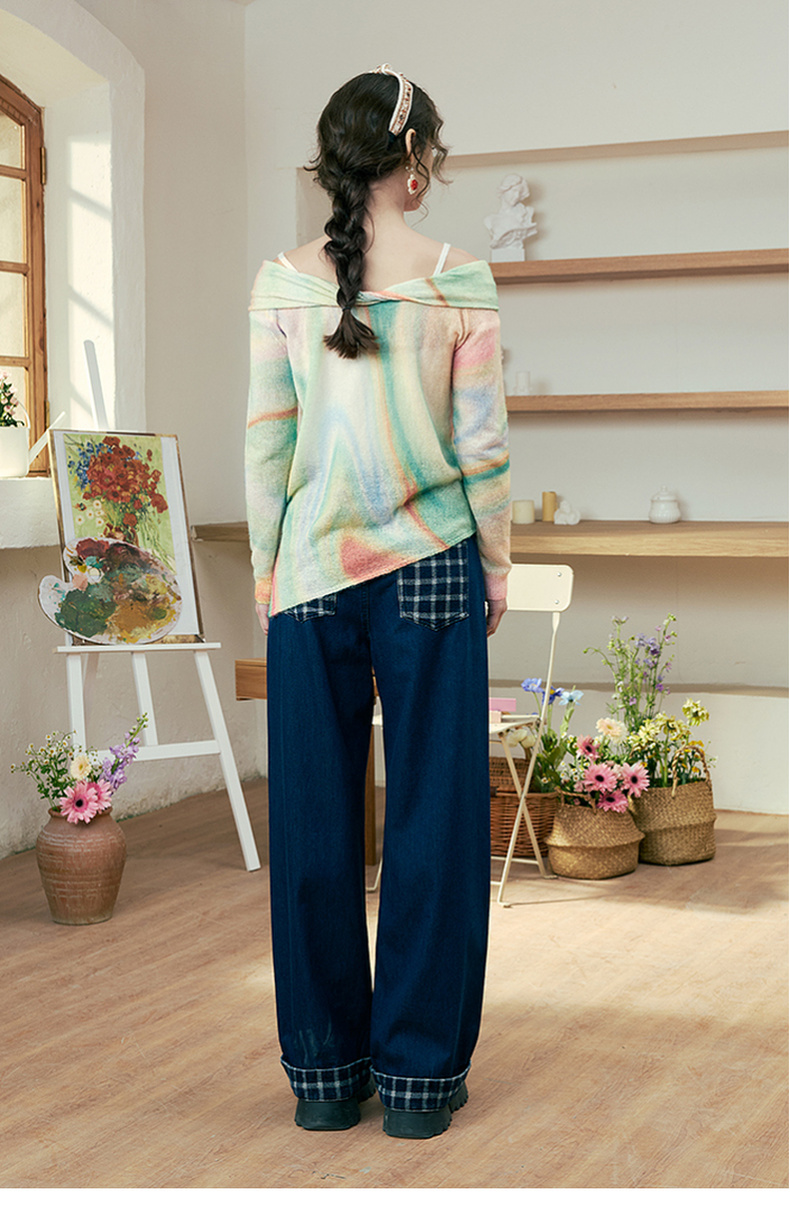 两三事 极光飞行 2025春季新款花色不对称下摆扭结一字肩针织衫女