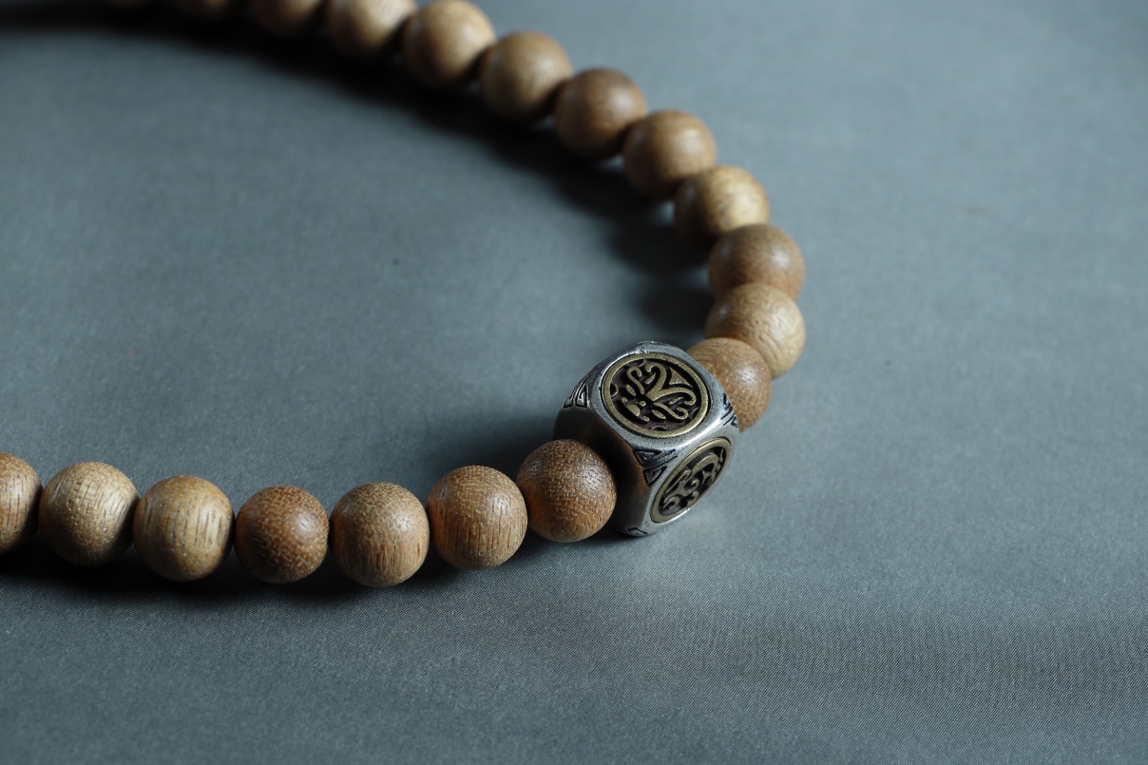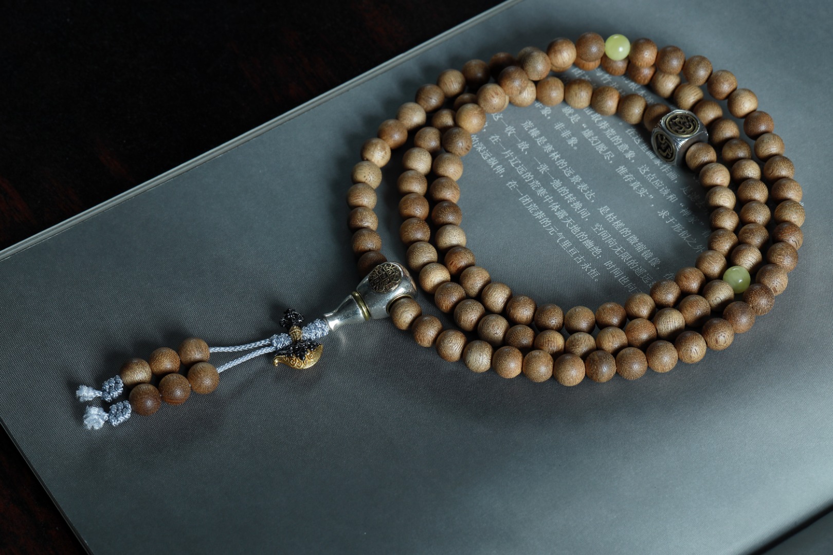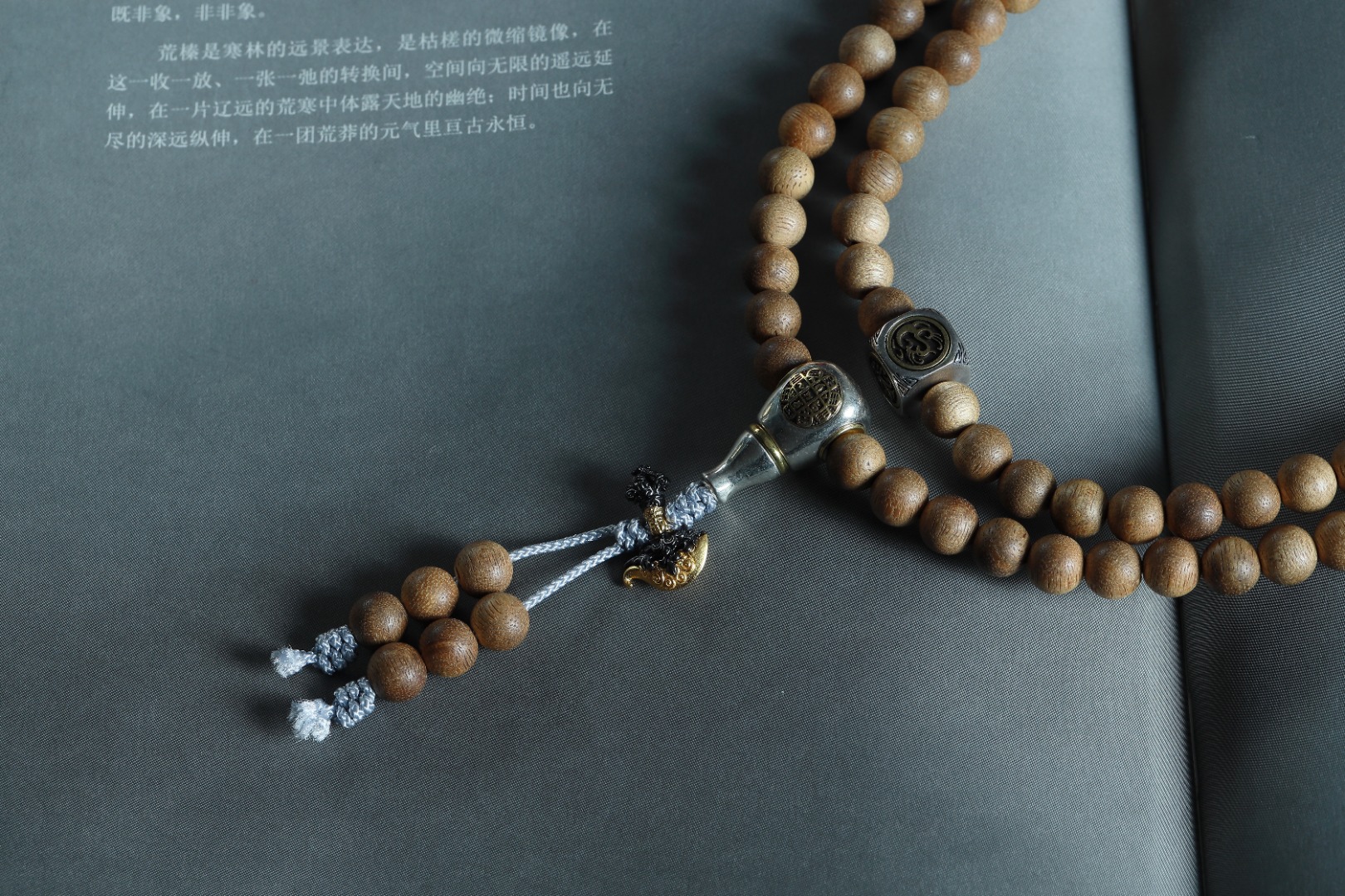 沉香圆珠多圈手串,香味倾泻,悠如云行,925银四象隔珠的搭配!展现着东方文化的独特魅力。925银九宫八卦三通,更加彰显尊贵,925银的光泽和古朴的造型,给整体增添一抹奢华和自信,银镀金刚铲刀是点睛之笔,展现独特经典大气。整体精致华丽和古朴雅致的气质,显示了对美的追求,也彰显对传统的热爱